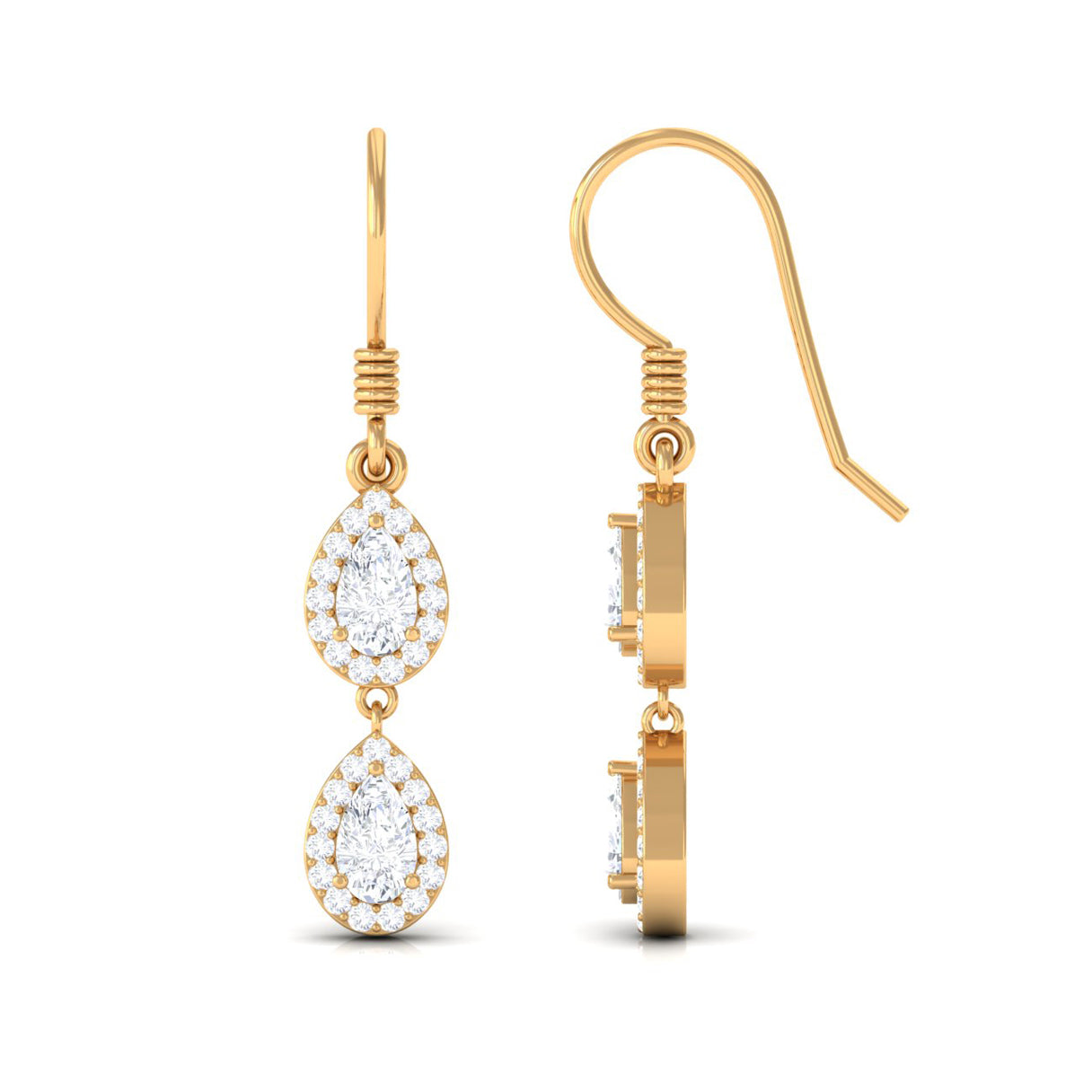 Every woman possesses a unique sparkle that complements her beauty. Discover yours with these alluring Moissanite Dangle Earrings. These dangle drop earrings feature pear-cut moissanite arranged in an eye-catching dangle style, embellished with dainty round moissanite accents around them. Crafted from solid gold, these dangler earrings are a must-have accessory that will enhance your radiance and warmth.