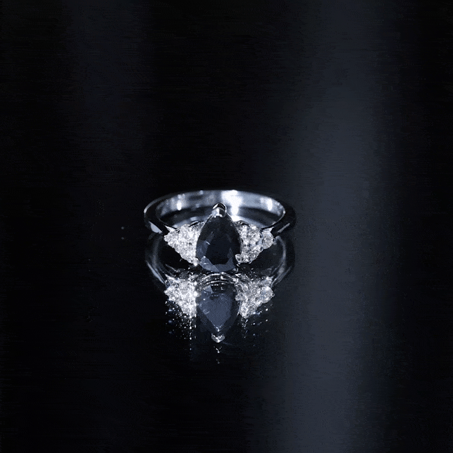 The Solitaire Ring is a unique and beautiful piece of jewelry that is perfect for those looking for a unique and stylish ring. This ring features a stunning pear-shaped created Black Diamond in the center, with Diamond trio on both sides. The created Black Diamond provides a bold and modern look, while the Diamond stones add extra sparkle and brilliance to the overall design. Whether your looking to make a statement with your jewelry or searching for a special and meaningful gift, this created Black Diamond ring is sure to impress.