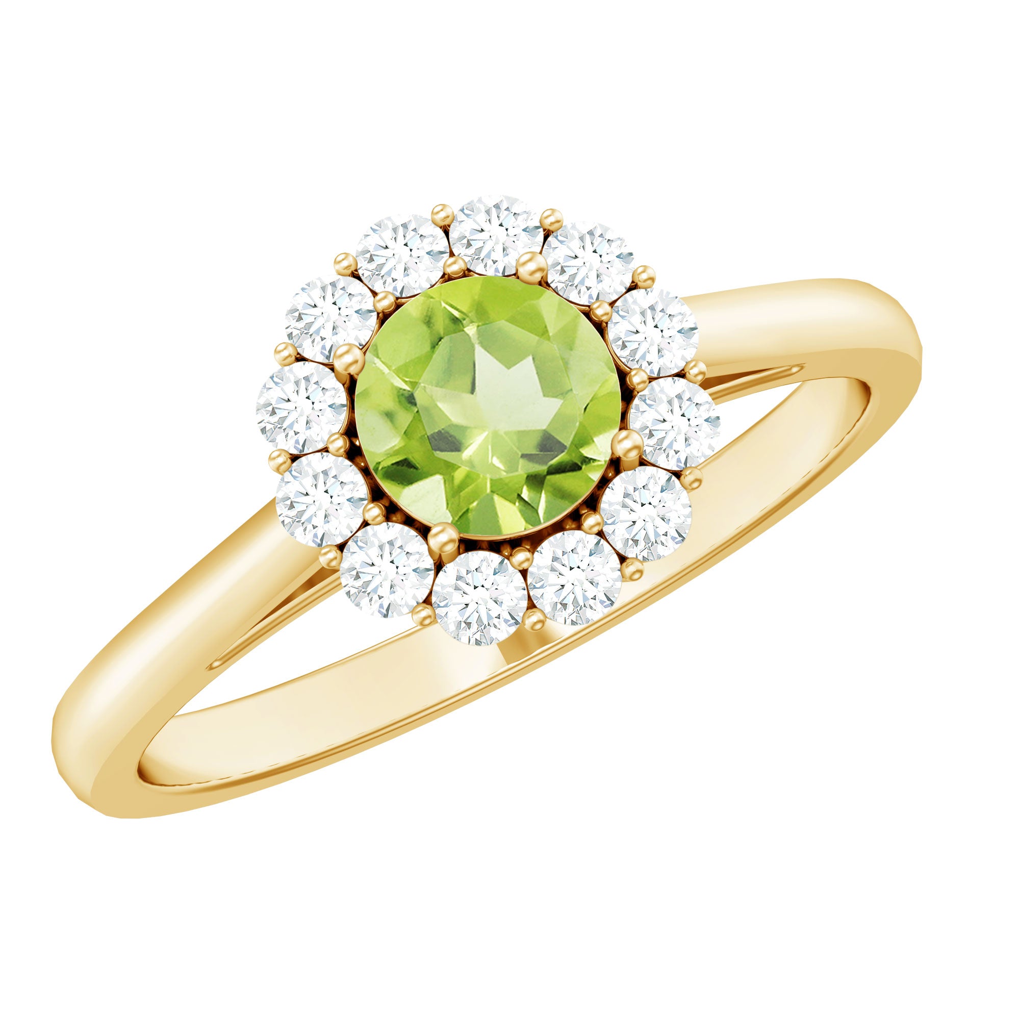 Enhance your beauty with Floating Halo Engagement Ring is embellished with Round Shape Peridot Set as a solitaire in a prong setting and Round Shape Diamond in a floating Halo. This Engagement Ring is composed of solid gold.