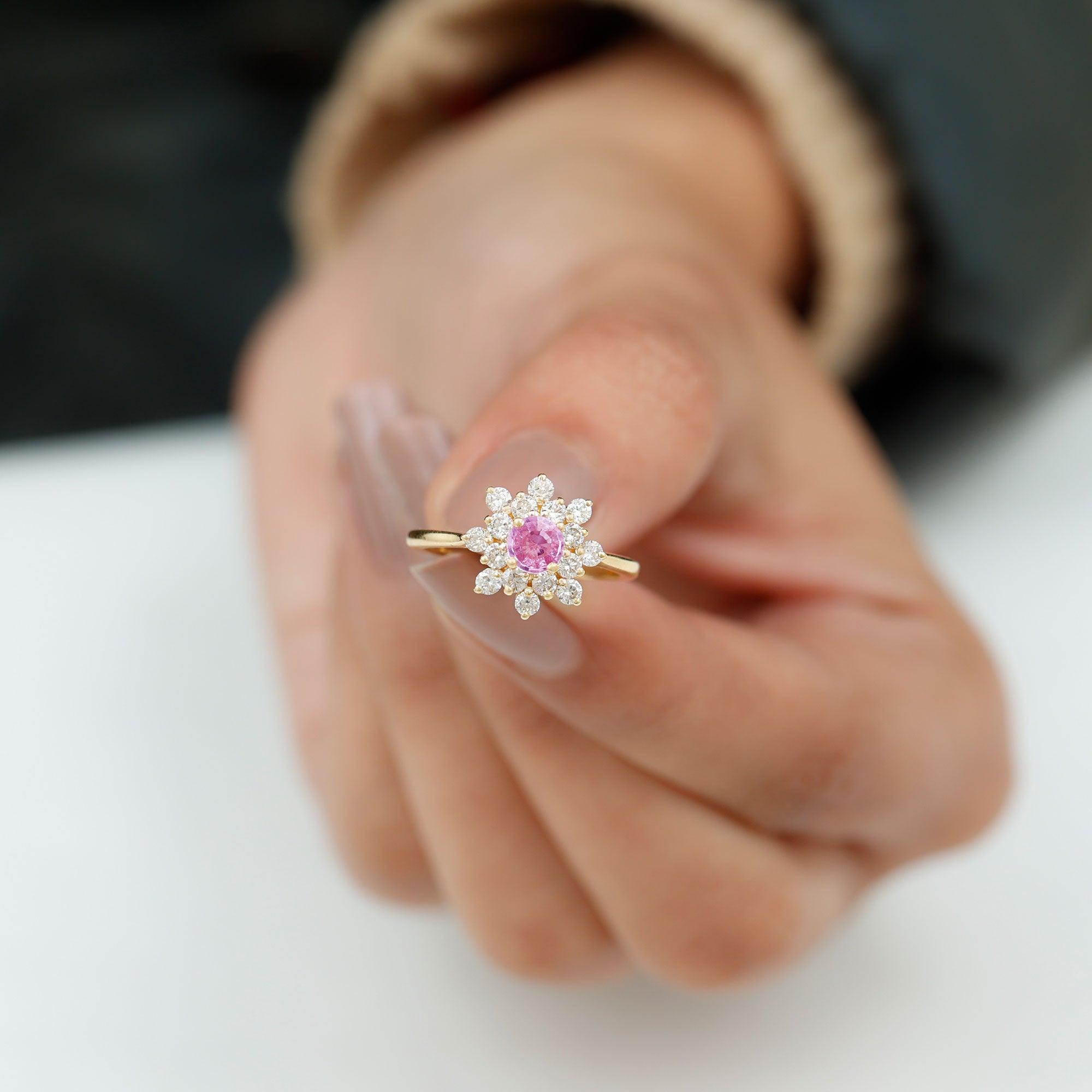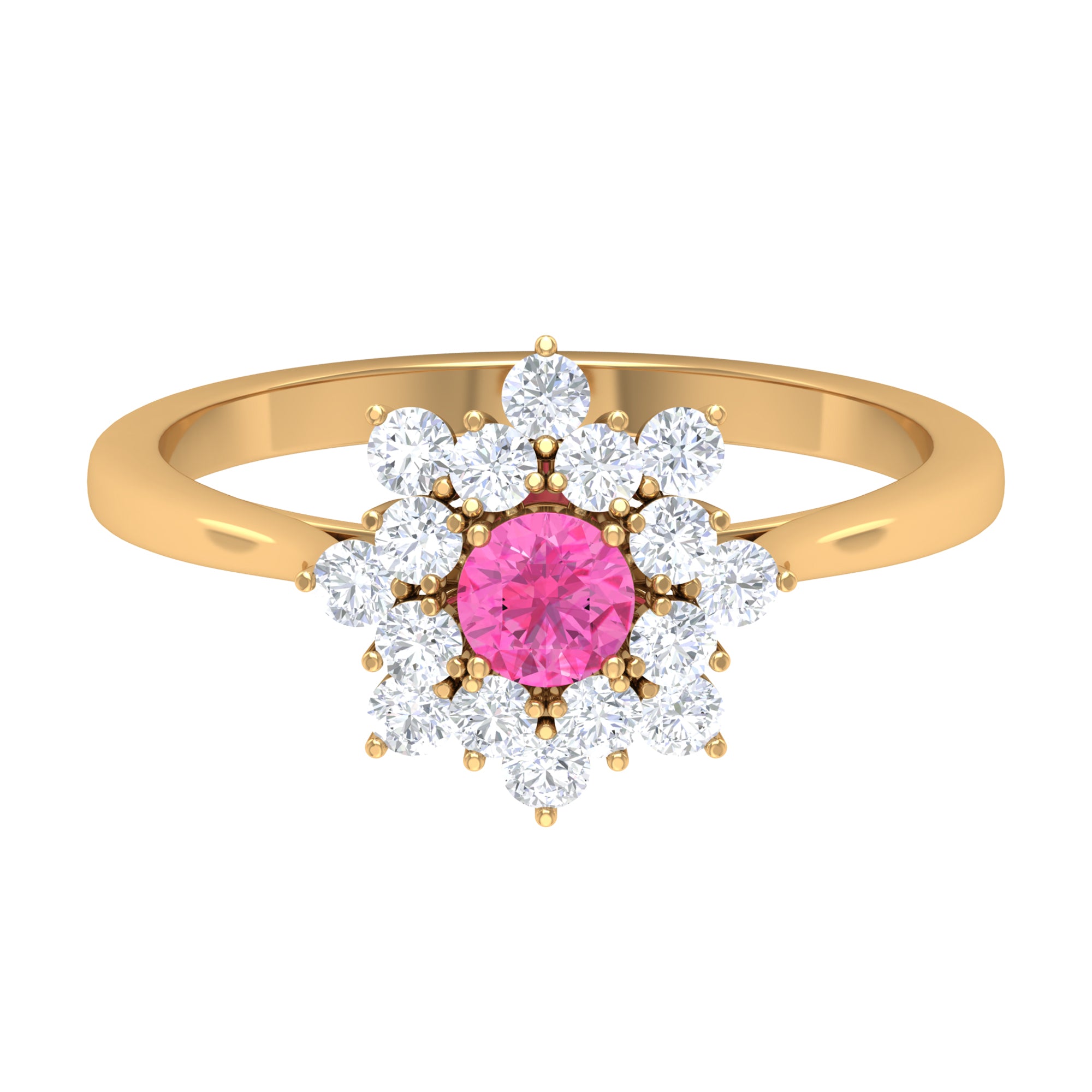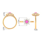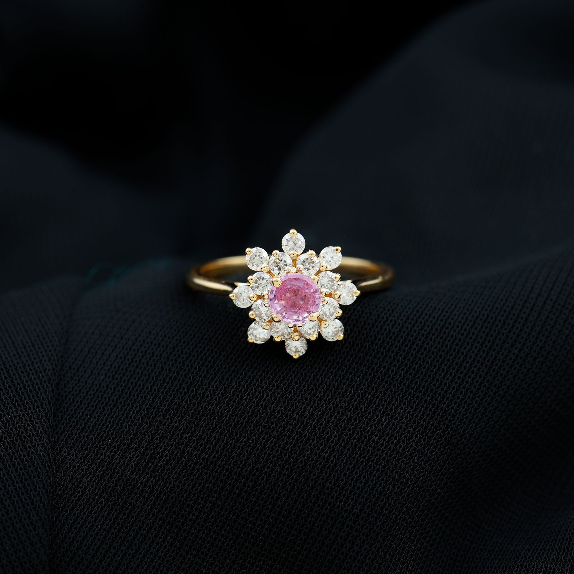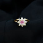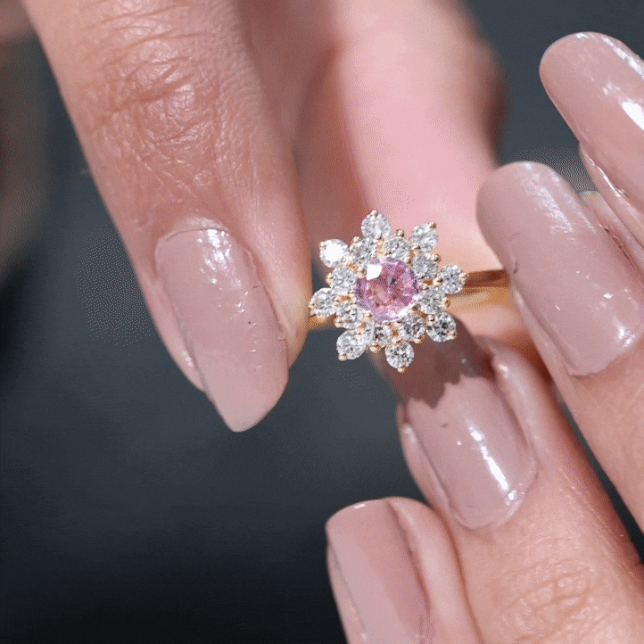 This gorgeous Cluster Engagement Ring is designed with Round Shape Pink Sapphire set as a Solitaire and Round Shape Diamond to make for an exquisite choice for special occasions. Crafted with Solid Gold to give a luxe appeal to this Statement Ring.