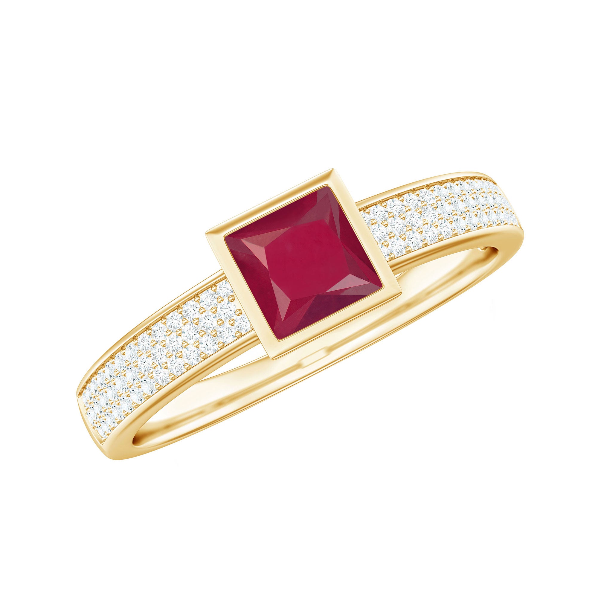 This Ruby Engagement Ring lends an air of grace and elegance to your special day. It embellished with Princess Cut Ruby in Bezel Setting with Diamond Side Stones in Pave Setting. This Ruby and Diamond Engagement Ring is beautifully crafted in Gold. Present this Ruby Gold Ring to her and make her feel like a princess.