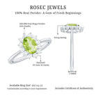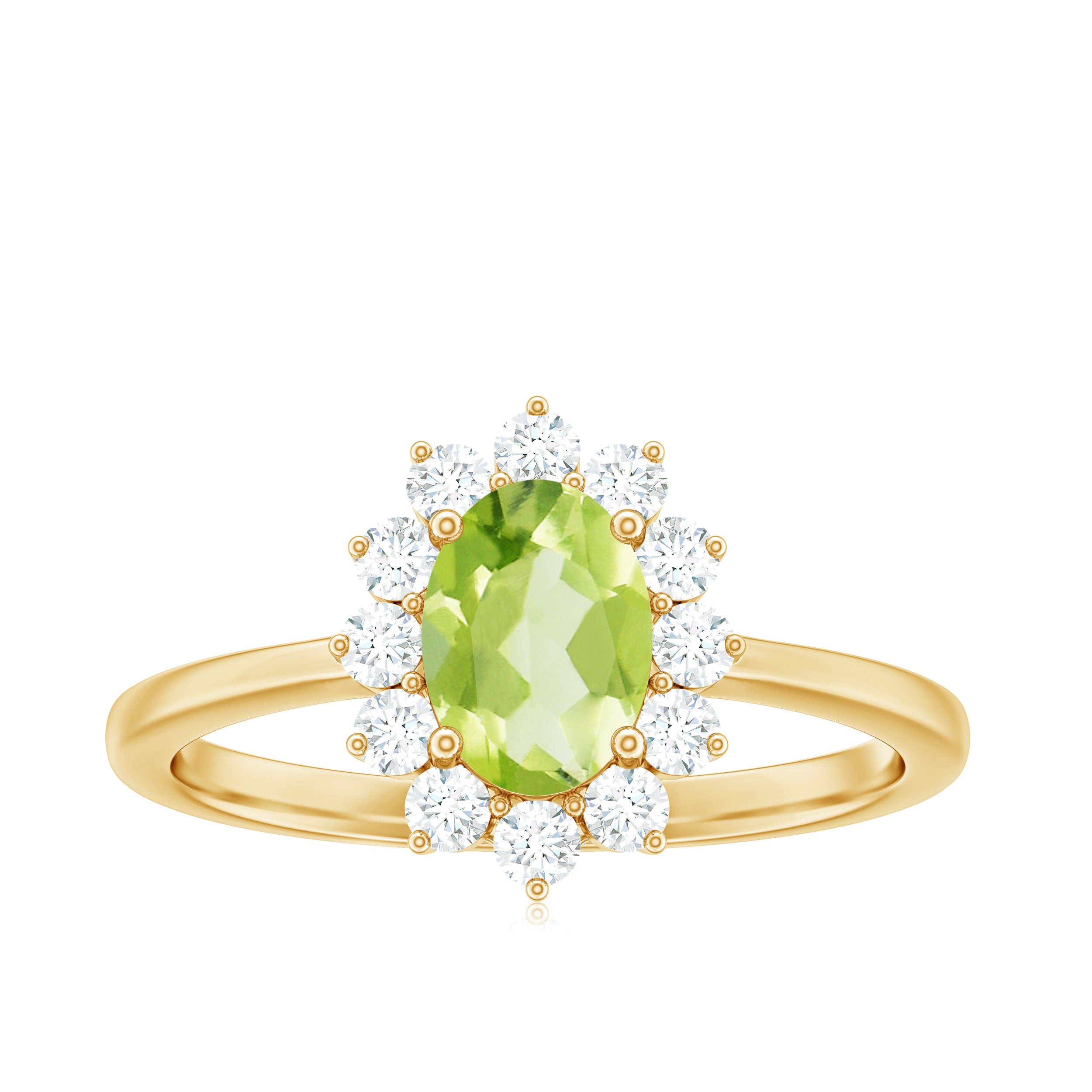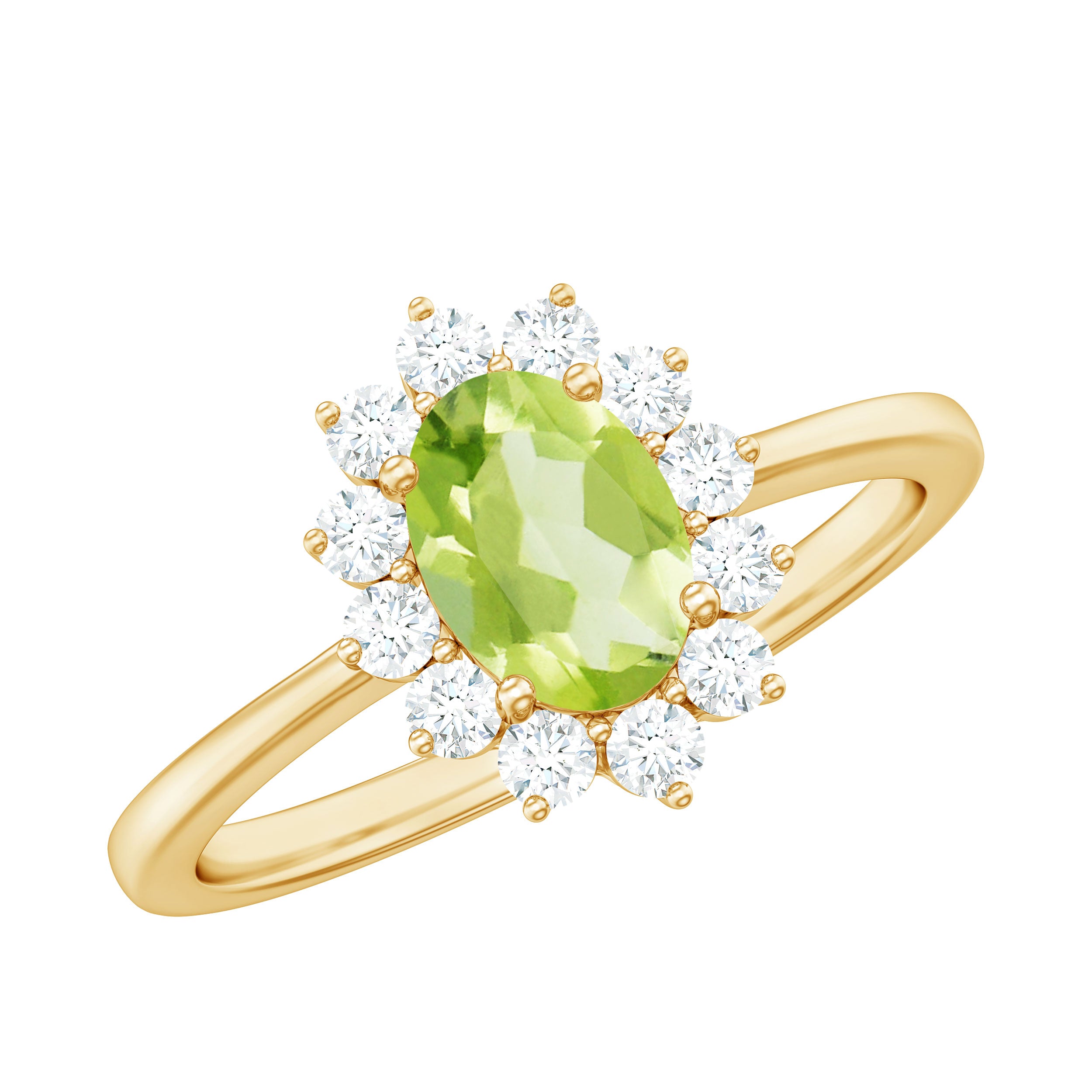 Propose to your beloved with the exquisite Peridot Ring and make her feel like a princess. This engagement ring is inspired by Princess Diana and features a 5X7 MM oval cut Peridot gemstone in a prong setting, surrounded by Diamond gemstones. With this natural Peridot ring, your love will always be with her, no matter where she goes. The total weight of the ring is 1 carat, and the gemstone has a AAA clarity rating. Rest assured, all our gemstones are certified and go through a rigorous quality check process.