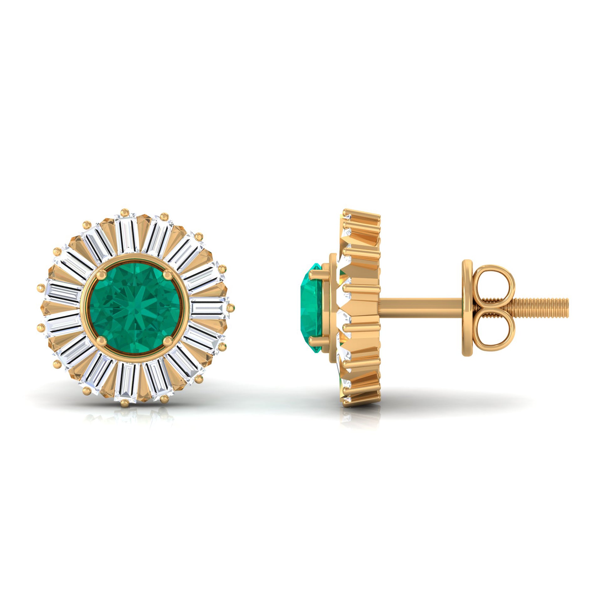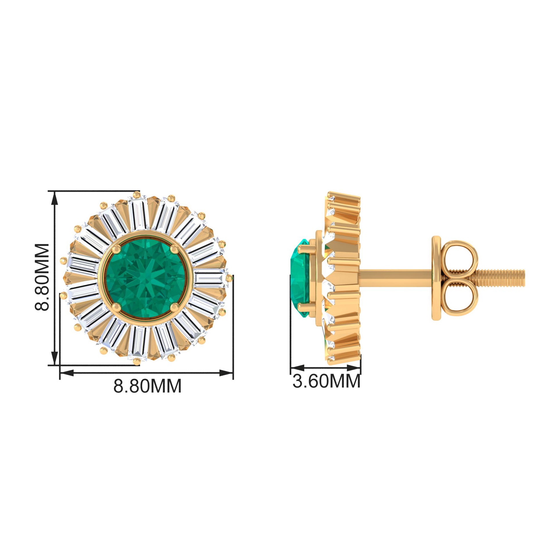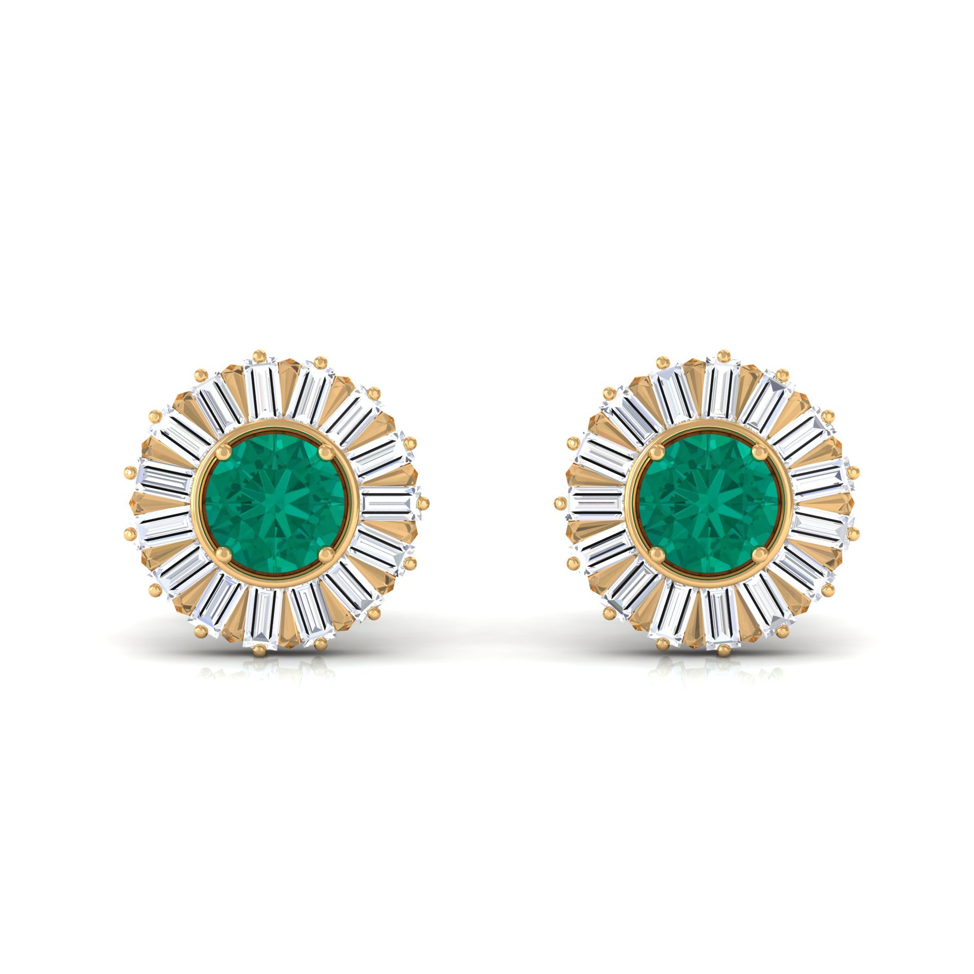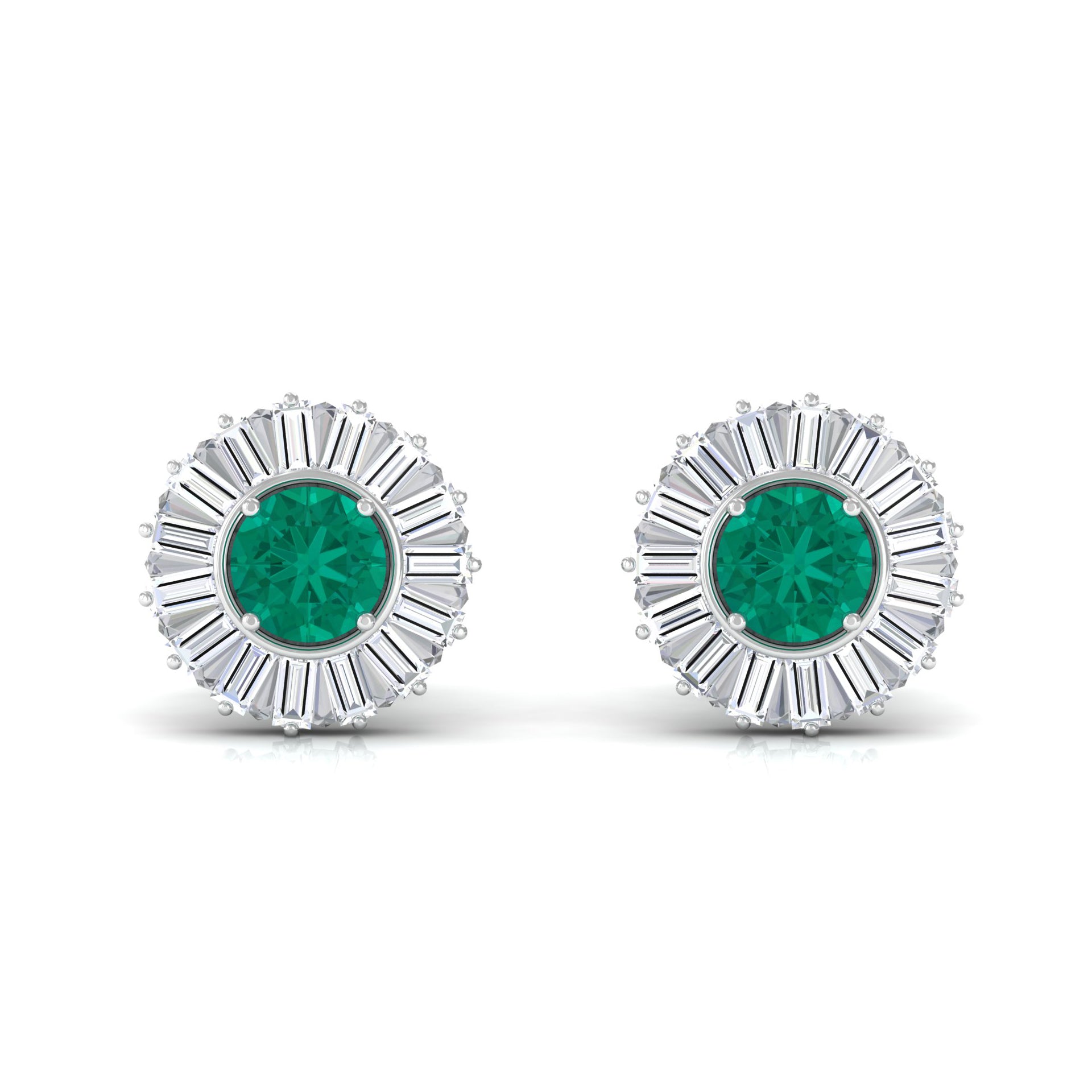 1 CT Prong Set Emerald Stud Earrings with Baguette Diamond Halo