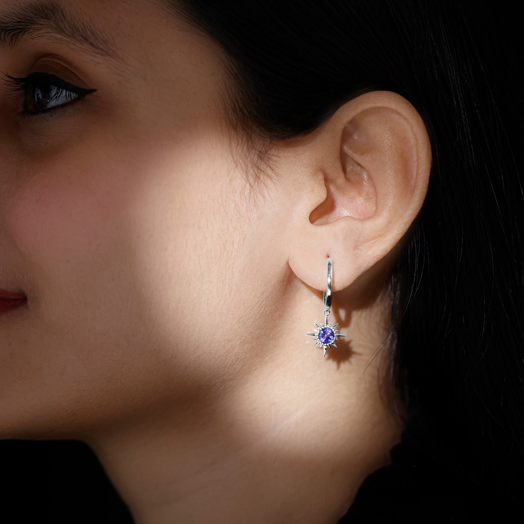 Upgrade your style with these beautiful Hoop Drop Earrings. Designed to be elegant and eye-catching, they bring a fresh and stylish touch to any outfit. Each earring features a sparkling 5 MM round cut Tanzanite that hangs gracefully from the hoop. The stone is set in a lovely sunburst design, which adds extra shine and creates a bold yet graceful look. The hoops are crafted with a hinged design, making them easy to open, close, and wear comfortably throughout the day. These Tanzanite Hoop Earrings fit securely on the ear while allowing the Tanzanite drop to move gently as you do, adding a soft, glowing sparkle to your appearance. These Sunburst Earrings are perfect for any woman who loves jewelry that is both simple and stylish. Whether you wear them with casual clothes, work outfits, or dressy evening looks, they will add beauty and elegance. The Huggie Hoop Earrings are a wonderful way to express your personality and enhance your everyday style.