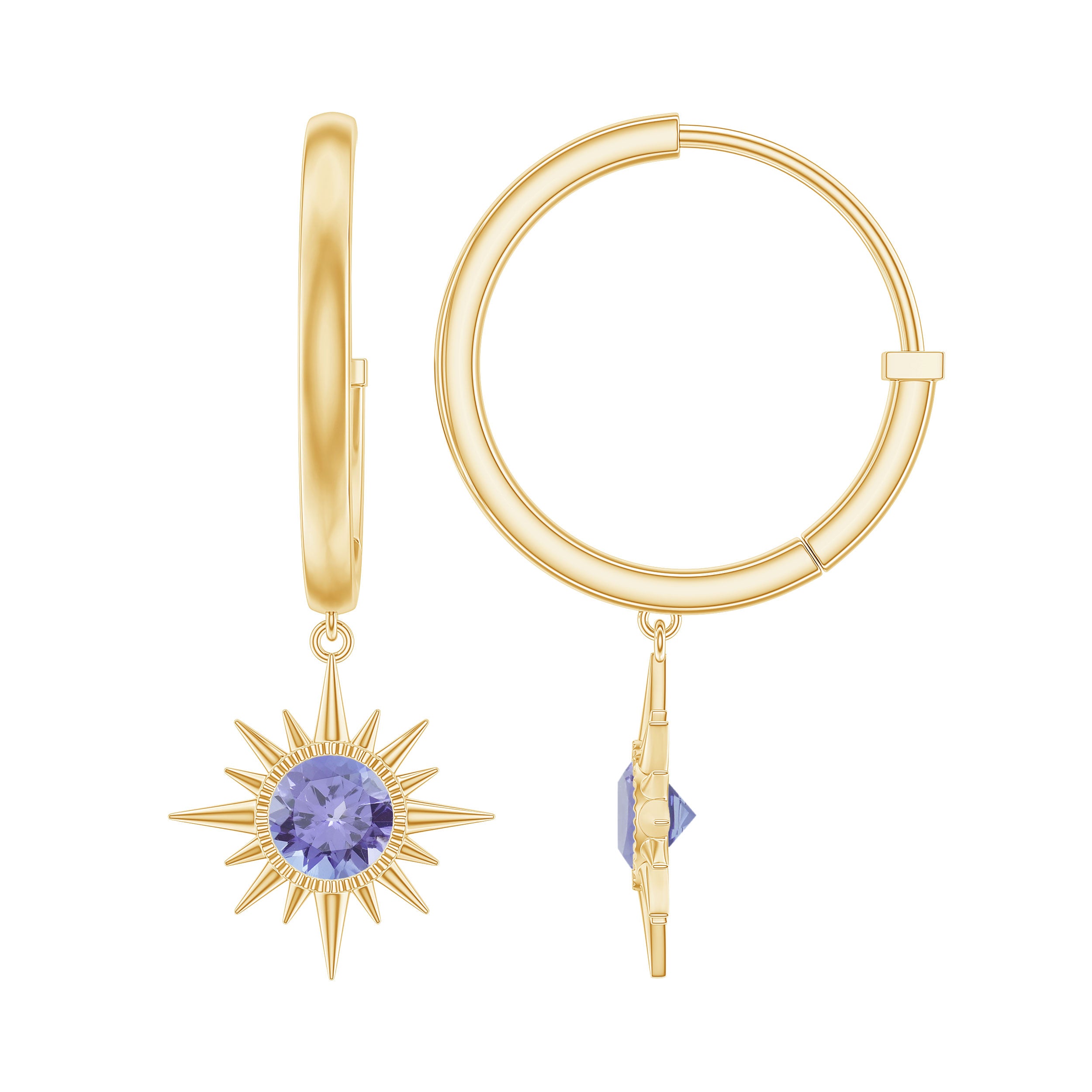 Upgrade your look with the Milgrain Drop Earring. This Hoop earring pairs perfectly with a blue dress, adding a touch of elegance. The Round Cut Tanzanite in a sunburst design will make a stunning statement. This Tanzanite Hoop Drop Earring is a charming choice for any woman. Embrace your style and elevate your look with this gorgeous piece.