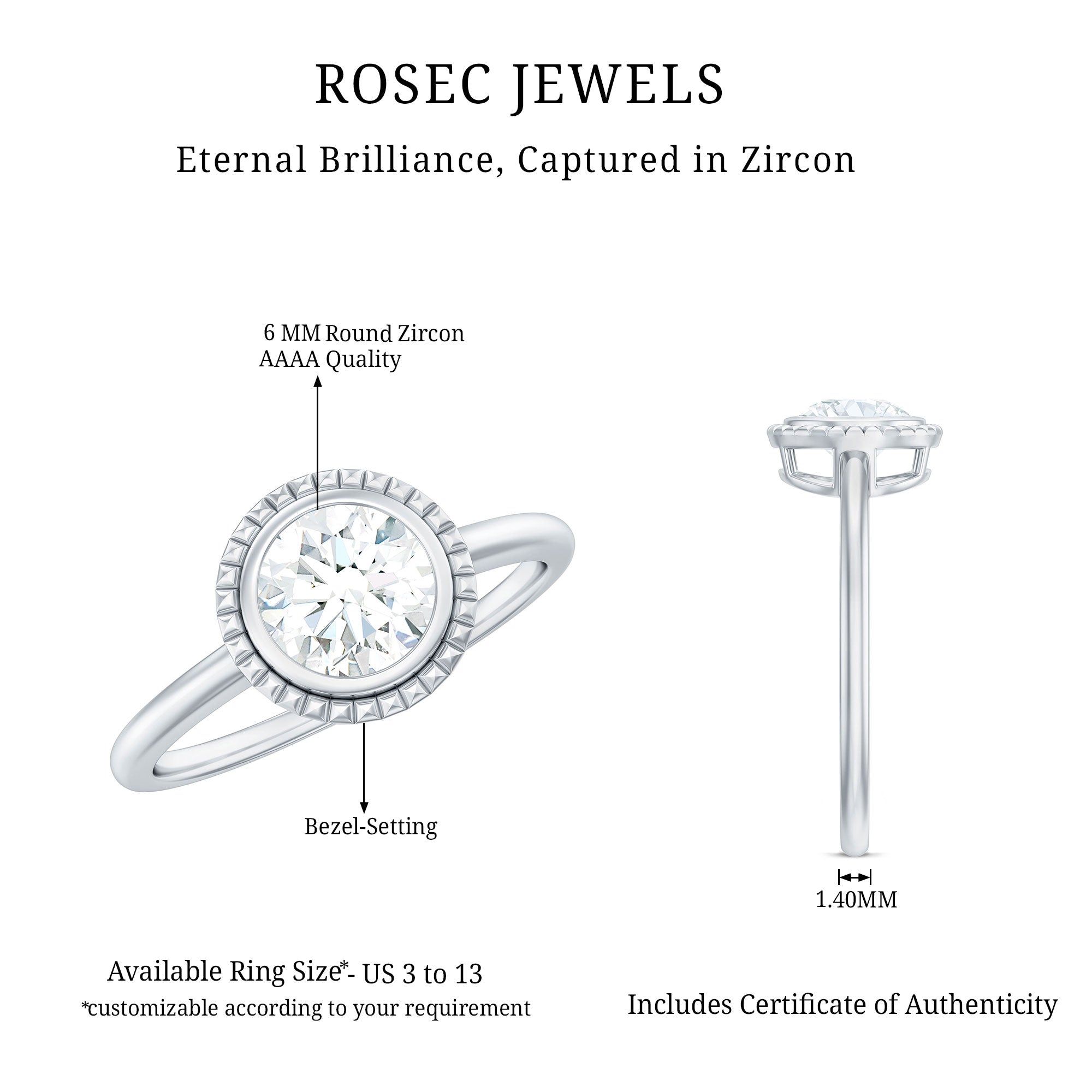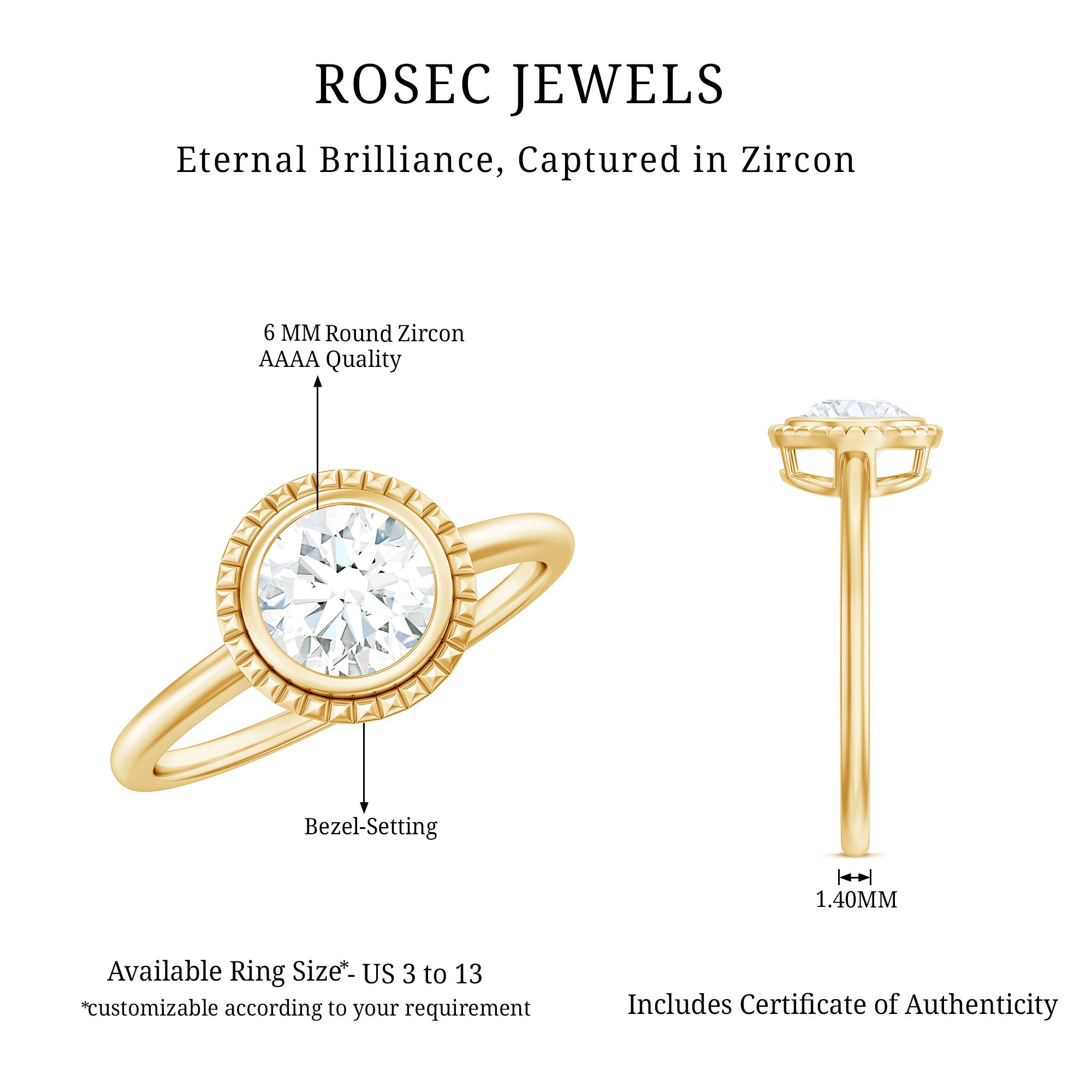This stunning promise ring showcases a round cut zircon center stone in bezel setting. The solitaire design emphasizes the beauty of the center stone, which sparkles brilliantly against the gold metal band. The minimalistic design of the ring is perfect for those who appreciate a simple and elegant style. This ring is an ideal choice for a promise ring or an affordable engagement ring.