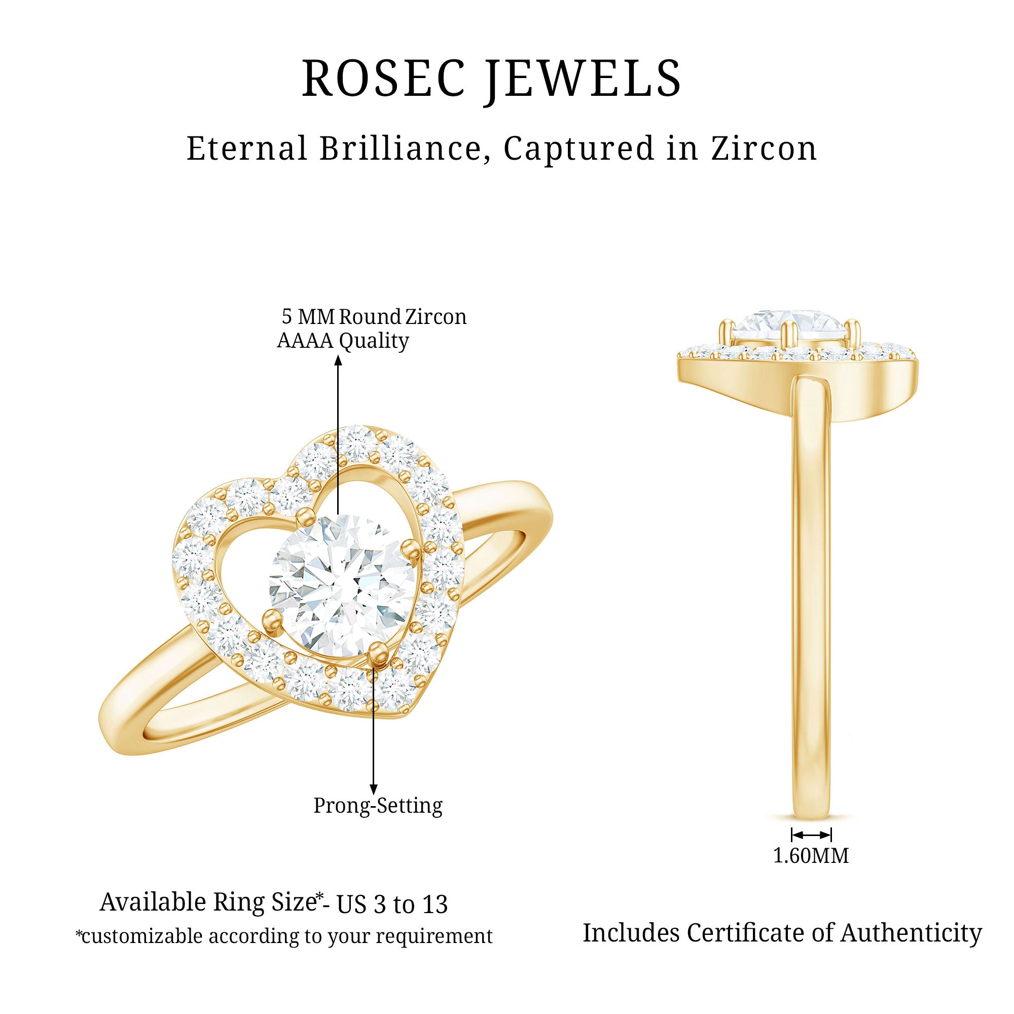 This delicate and timeless Zircon Jewelry is the perfect symbol of your love. The unique style makes it perfect for everyday wear and easy to stack with other jewelry. Heavenly crafted in Gold with Round Shape Cubic Zirconia set in Prong Setting and creating a halo in heart shape, makes a perfect Heart Engagement Ring.