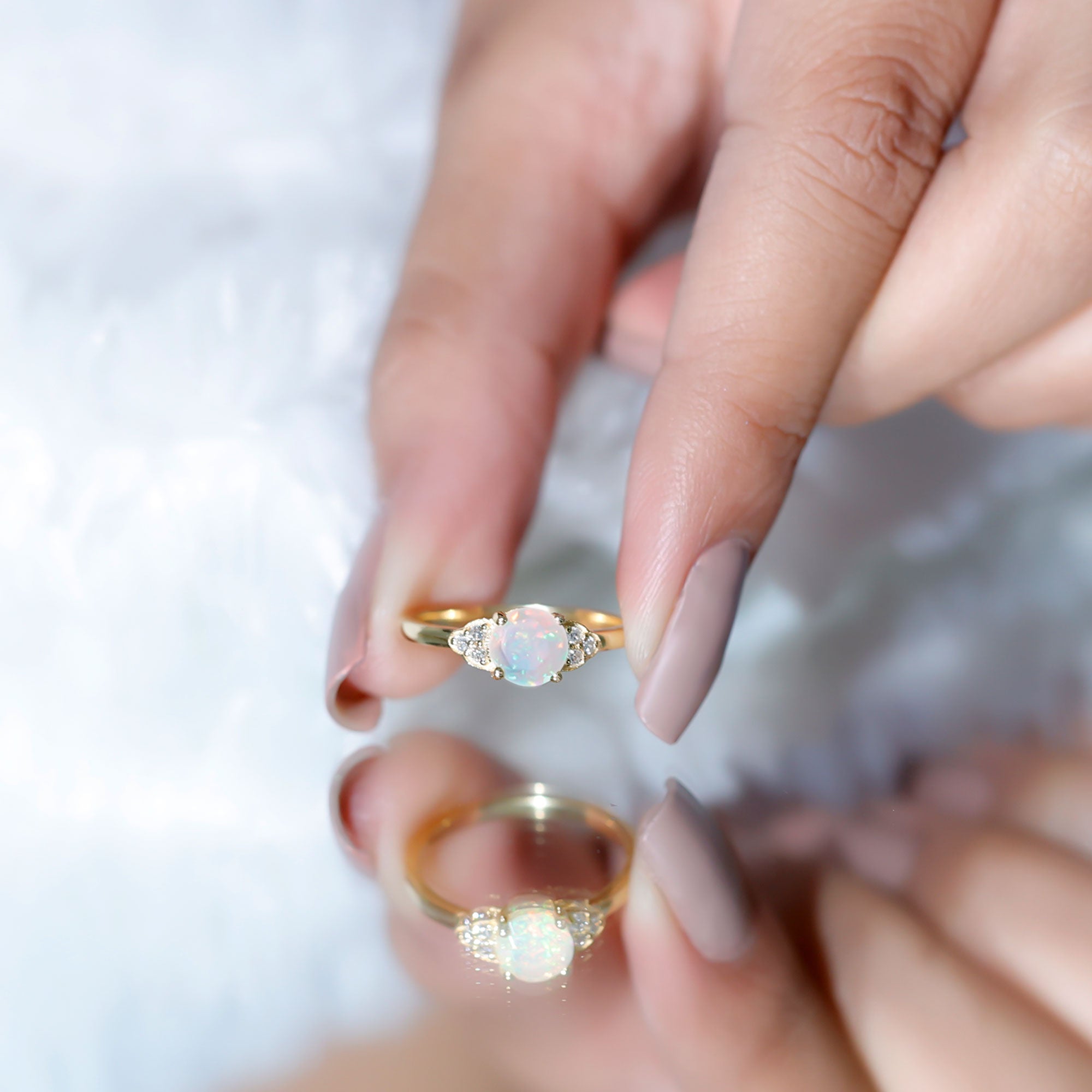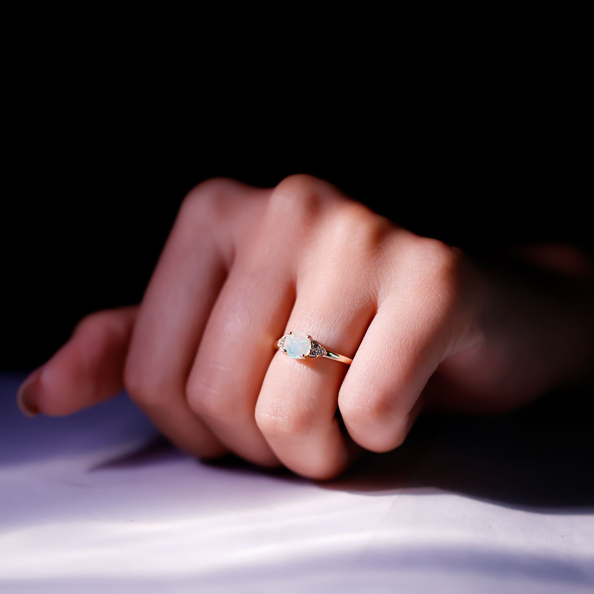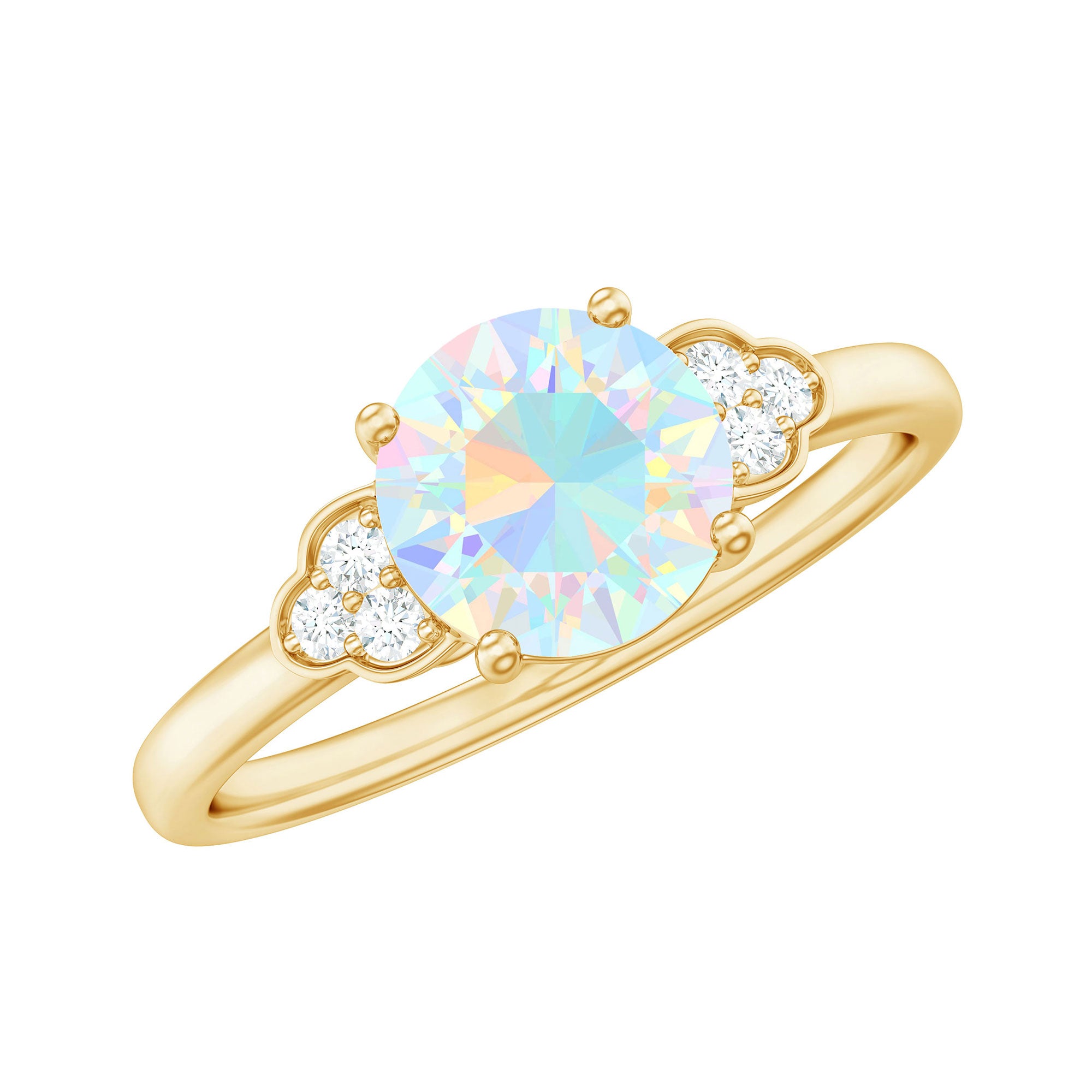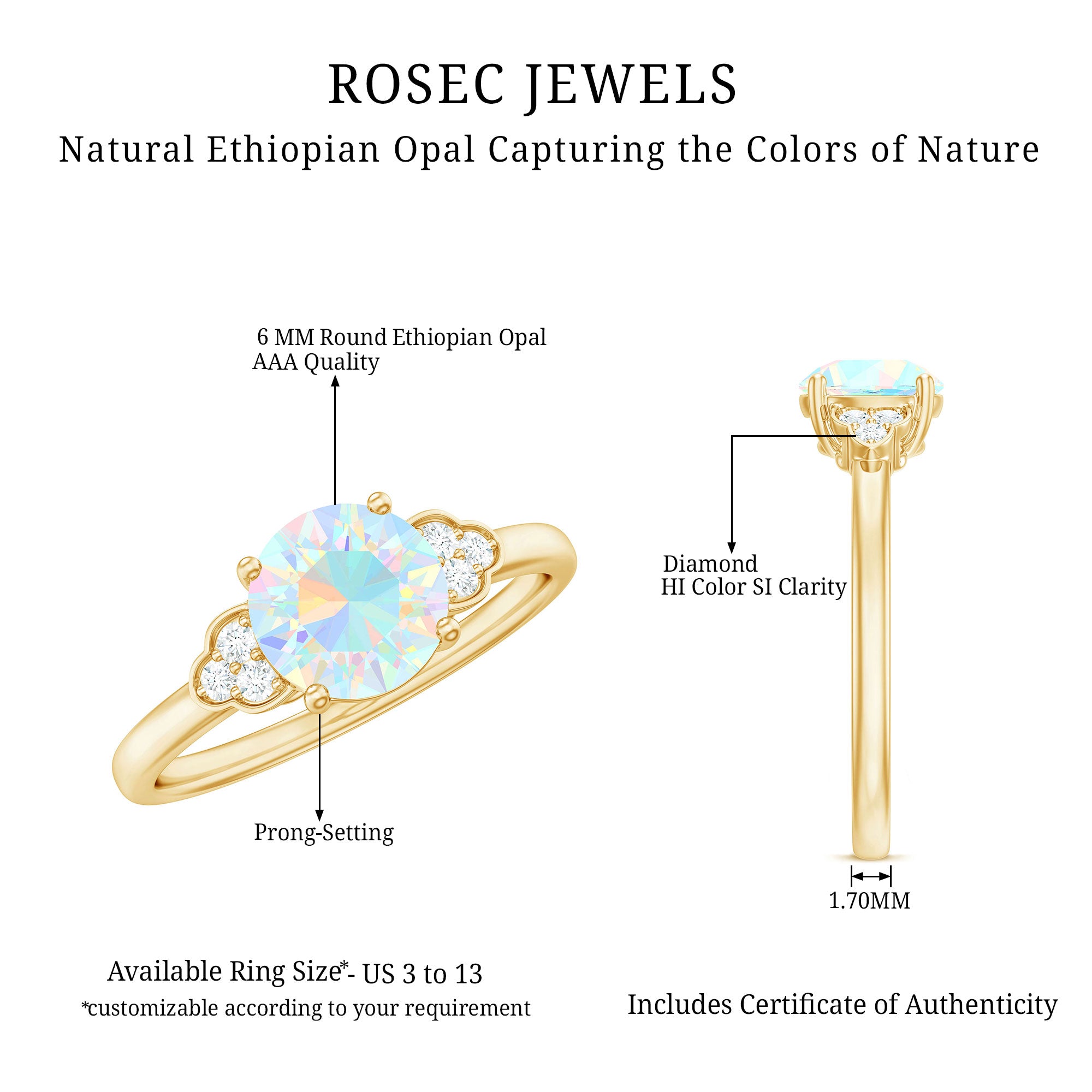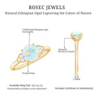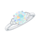 Turn heads and capture hearts with this stunning Opal Diamond Engagement Ring, designed for the soul who dares to be different. At the center, a mesmerizing 6 mm Round Shape Ethiopian Opal flashes with ethereal hues, blues, pinks, greens and oranges, dancing with every movement. Placed on either side, a trio of dazzling Diamond stones adds the perfect balance of sparkle and sophistication. Set in a slim band that flatters every hand, this Opal Solitaire Ring is a symbol of passion and a promise of forever. Whether you are popping the question or treating yourself to something meaningful, this Ethiopian Opal Ring brings ethereal beauty to a timeless tradition. Presented in a signature jewelry box, this Opalescent Ring is perfect for gifting or safekeeping. Available in a variety of sizes to ensure the perfect fit, because your forever ring should feel like it was made just for you.