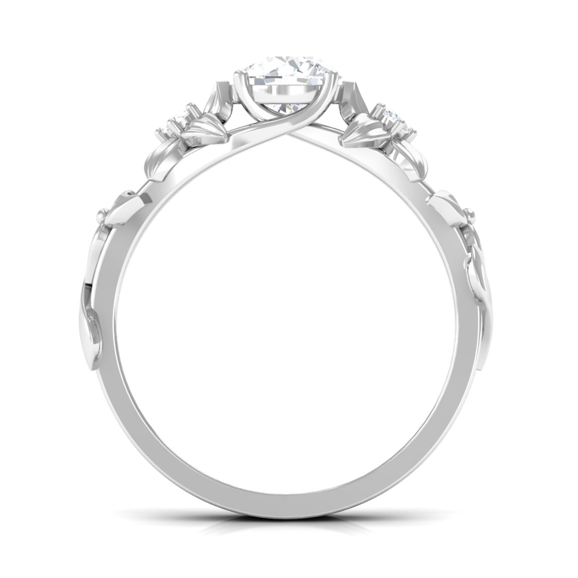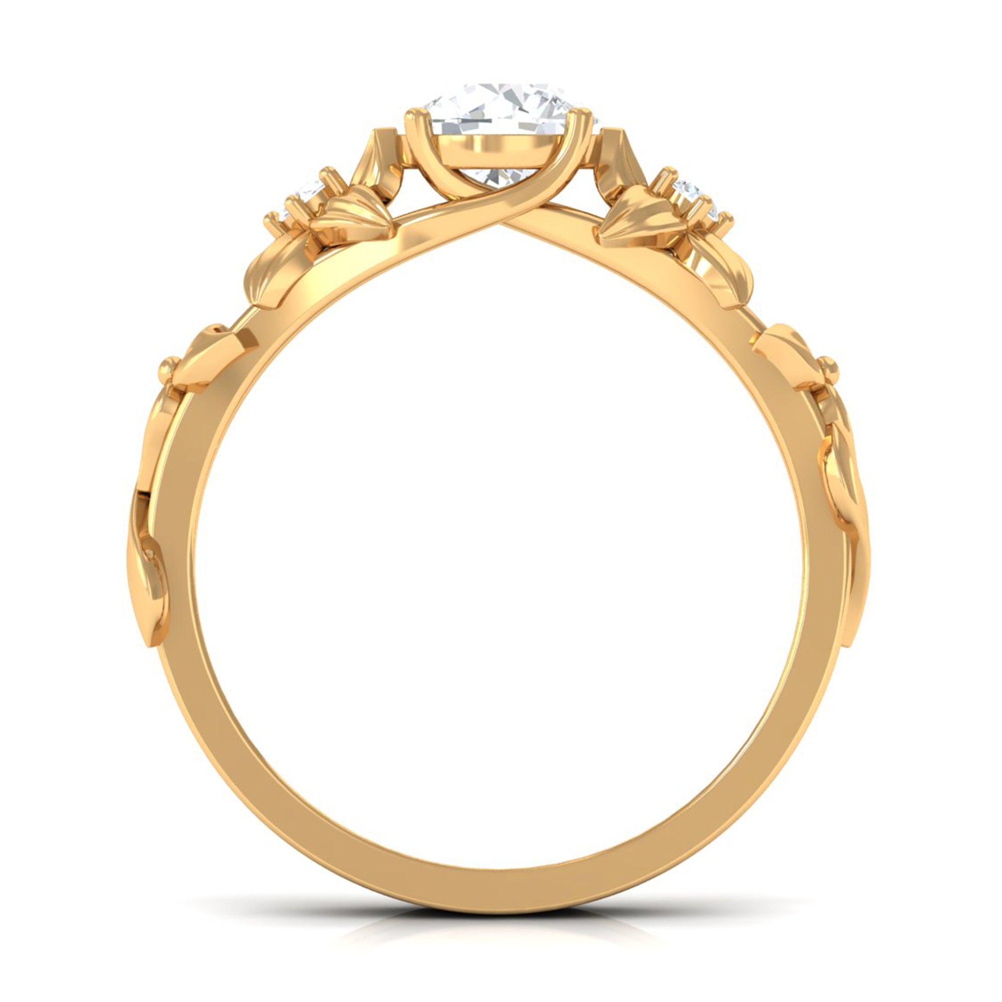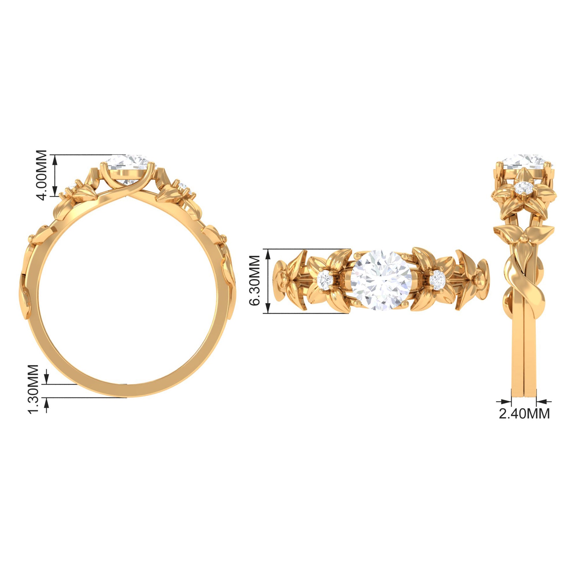 This beautiful engagement ring features a Round Shape Zircon Stone center stone set in prong setting with similar Zircon Stones studded over Gold Flowers. The flower design creates a romantic and whimsical feel, while the simulated diamond adds the perfect touch of sparkle and elegance. This ring is a perfect choice for someone who wants a timeless yet distinctive engagement ring.