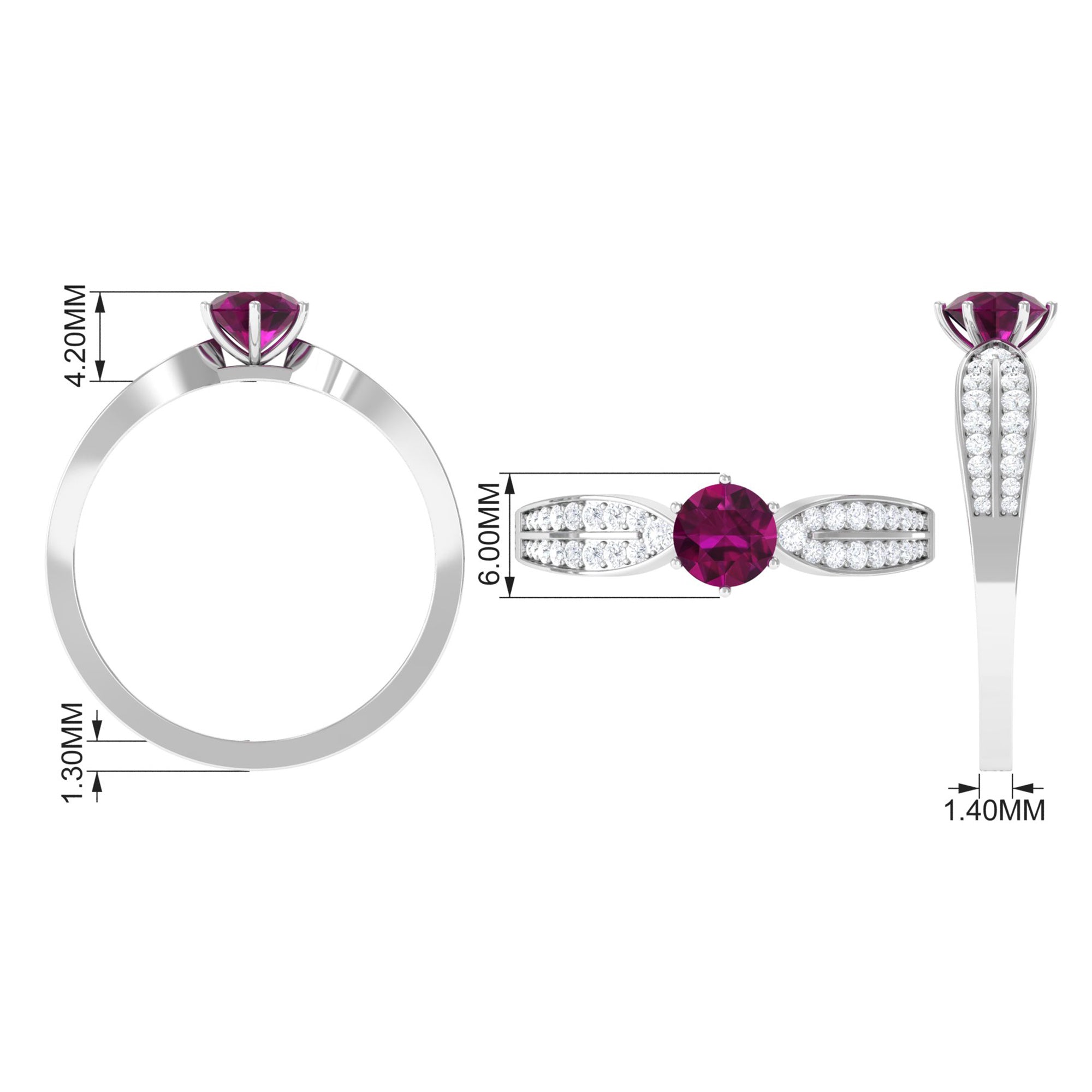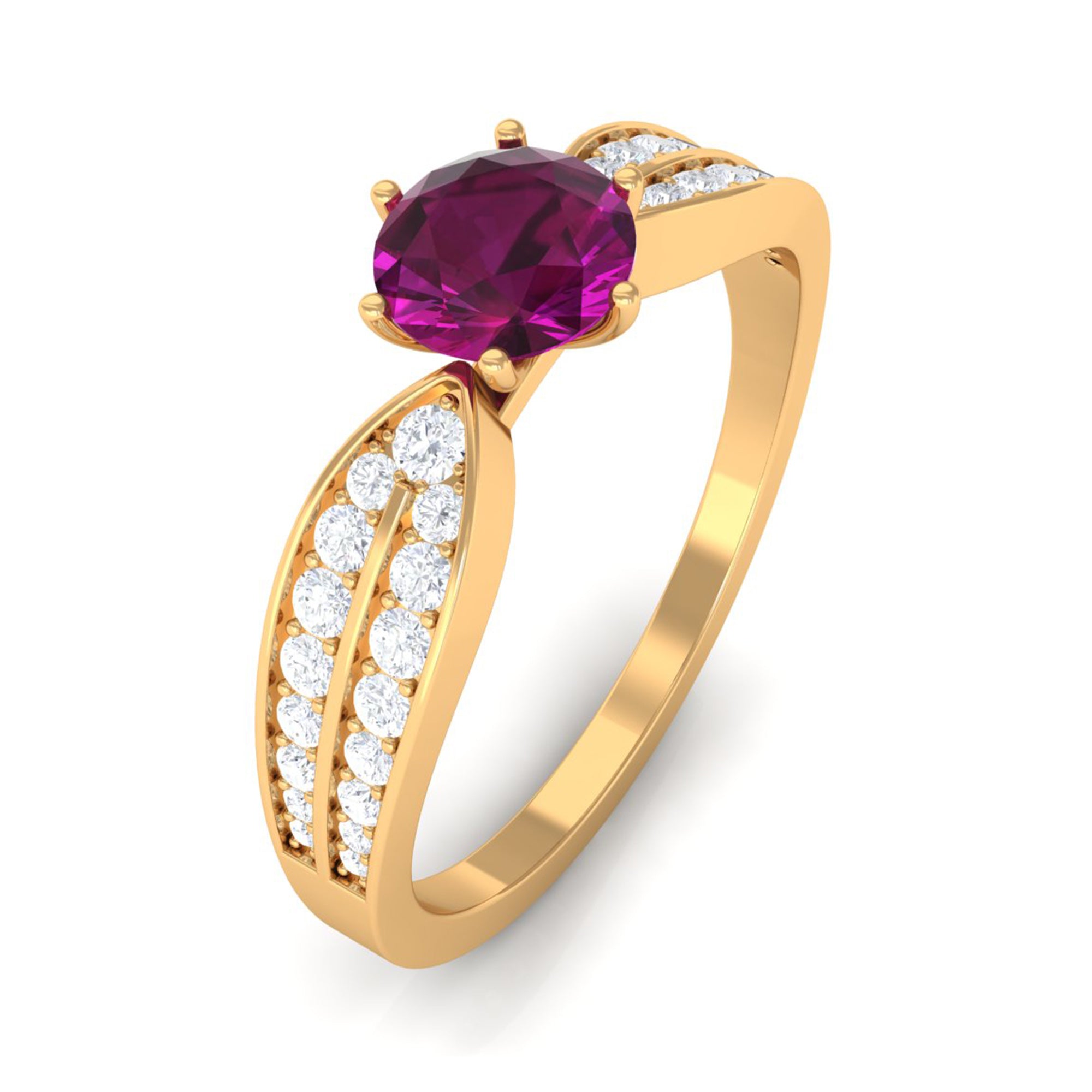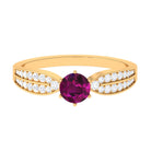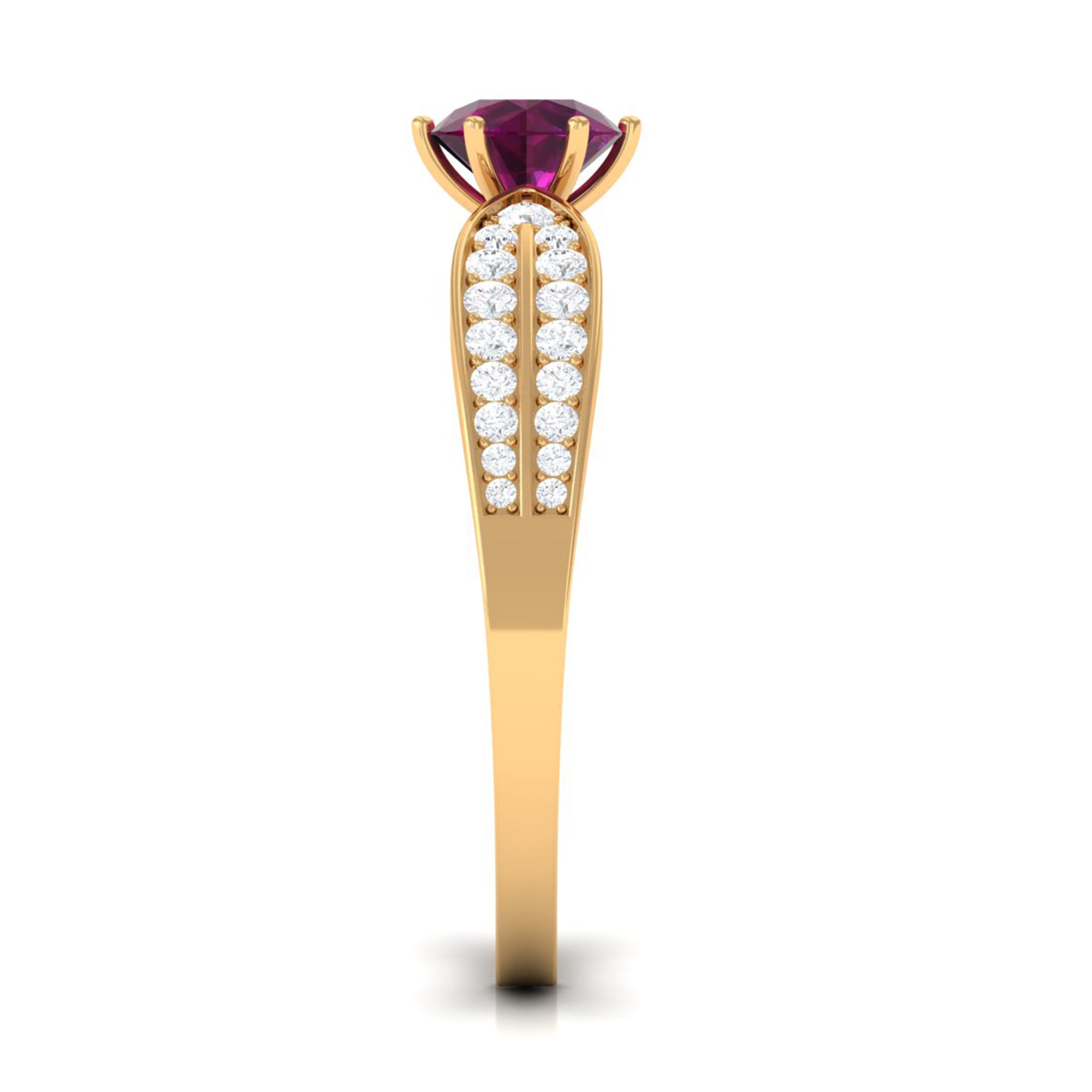 Make her feel special with this Engagement Ring is embellished with Round Shape Rhodolite is set as a solitaire in a 6 prong setting and round shape Diamond as side stone. This Side Stone Engagement Ring is mounted in solid gold.