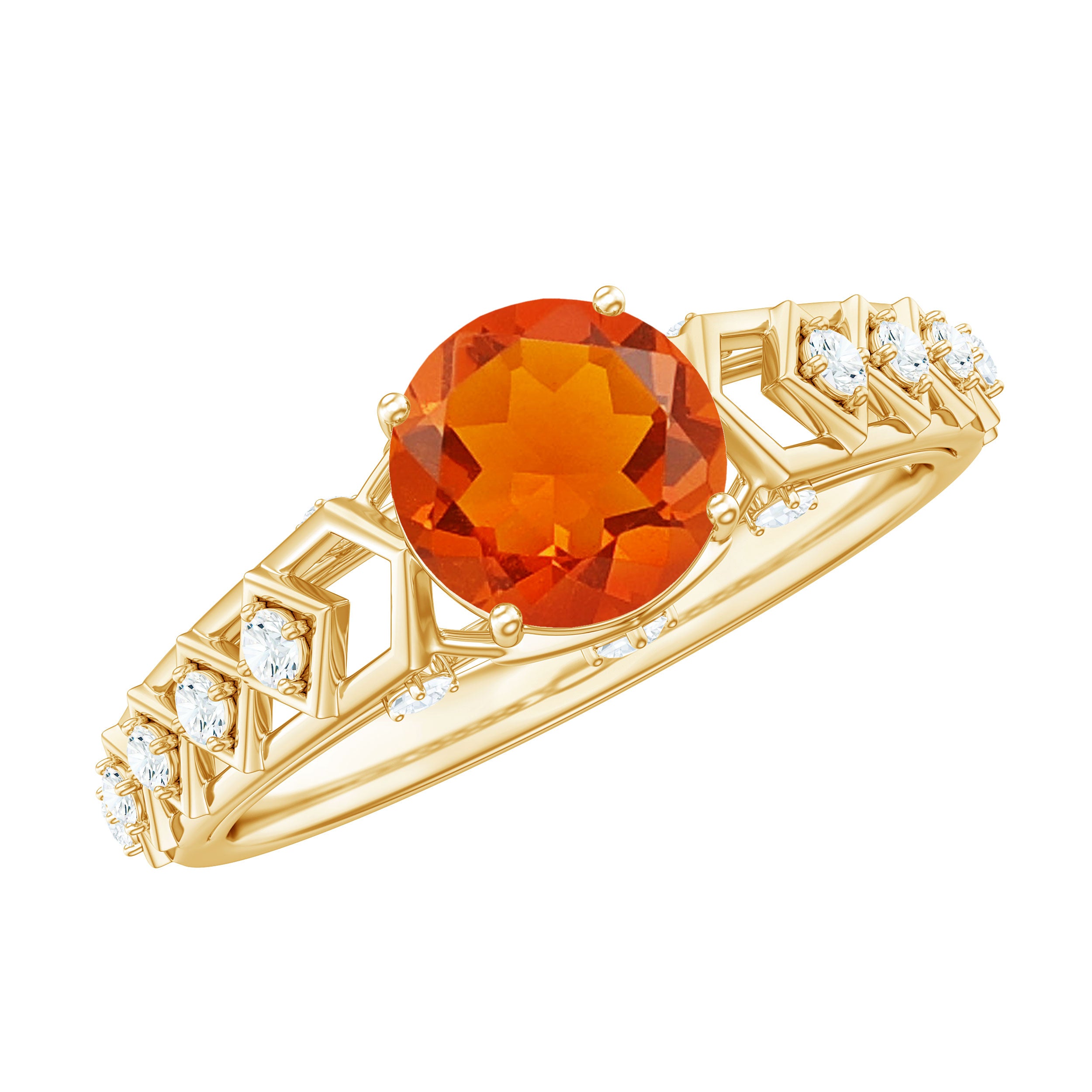Sparkle with this stunning Fire Opal Ring. Featuring a Round Shape Fire Opal in a prong setting, shank is decorated by golden cutwork and Diamond accents, it is crafted in gold to create a luxurious and elegant look. Perfect for adding a touch of sophistication to any outfit.
