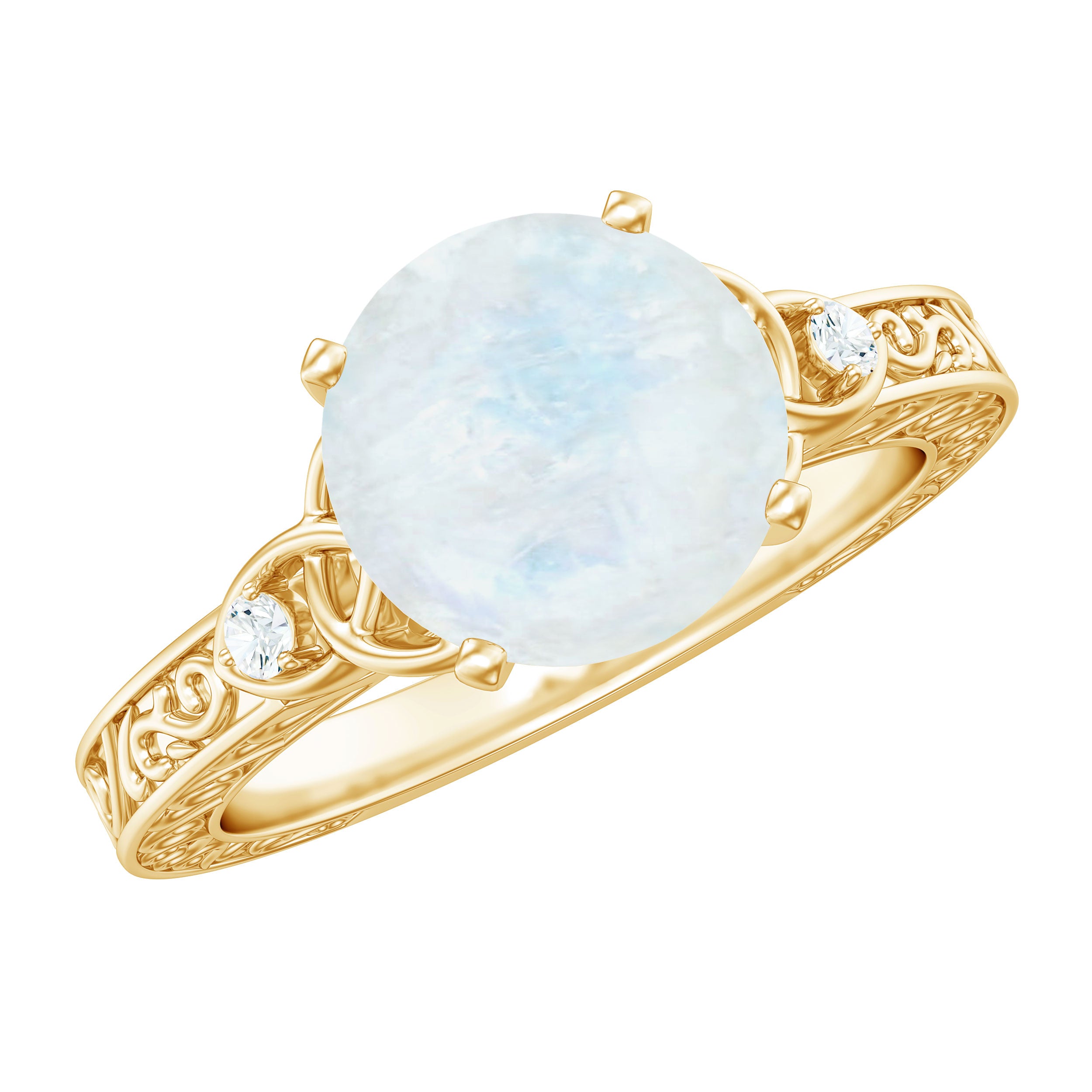 This exquisite Solitaire Ring features a round shape moonstone at its center, complemented by a sparkling Diamond on each side. The elegant Celtic knot design symbolizes eternal love and unity, making it a perfect gift for someone special. This stunning piece of jewelry is perfect for any occasion and will make a beautiful addition to any collection.