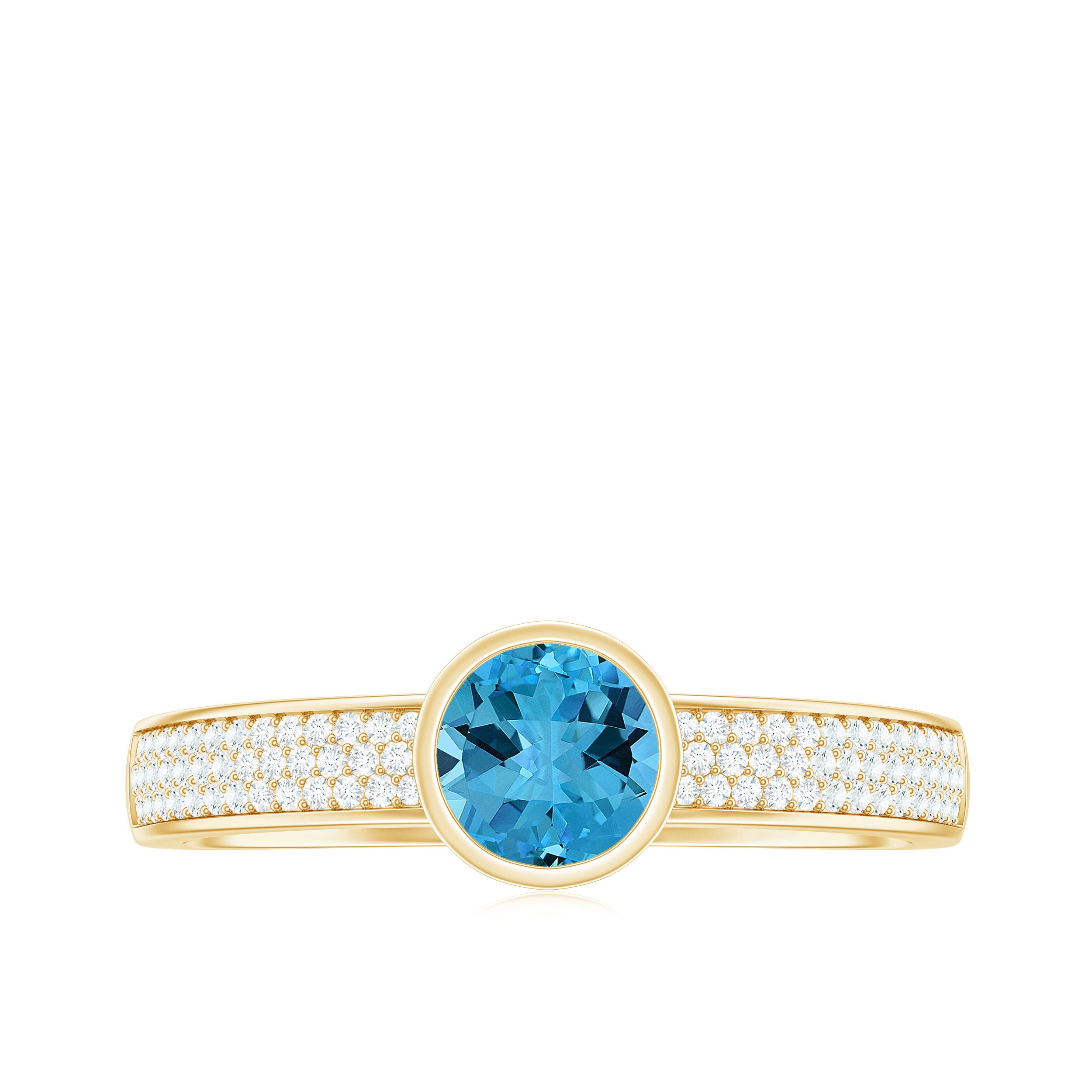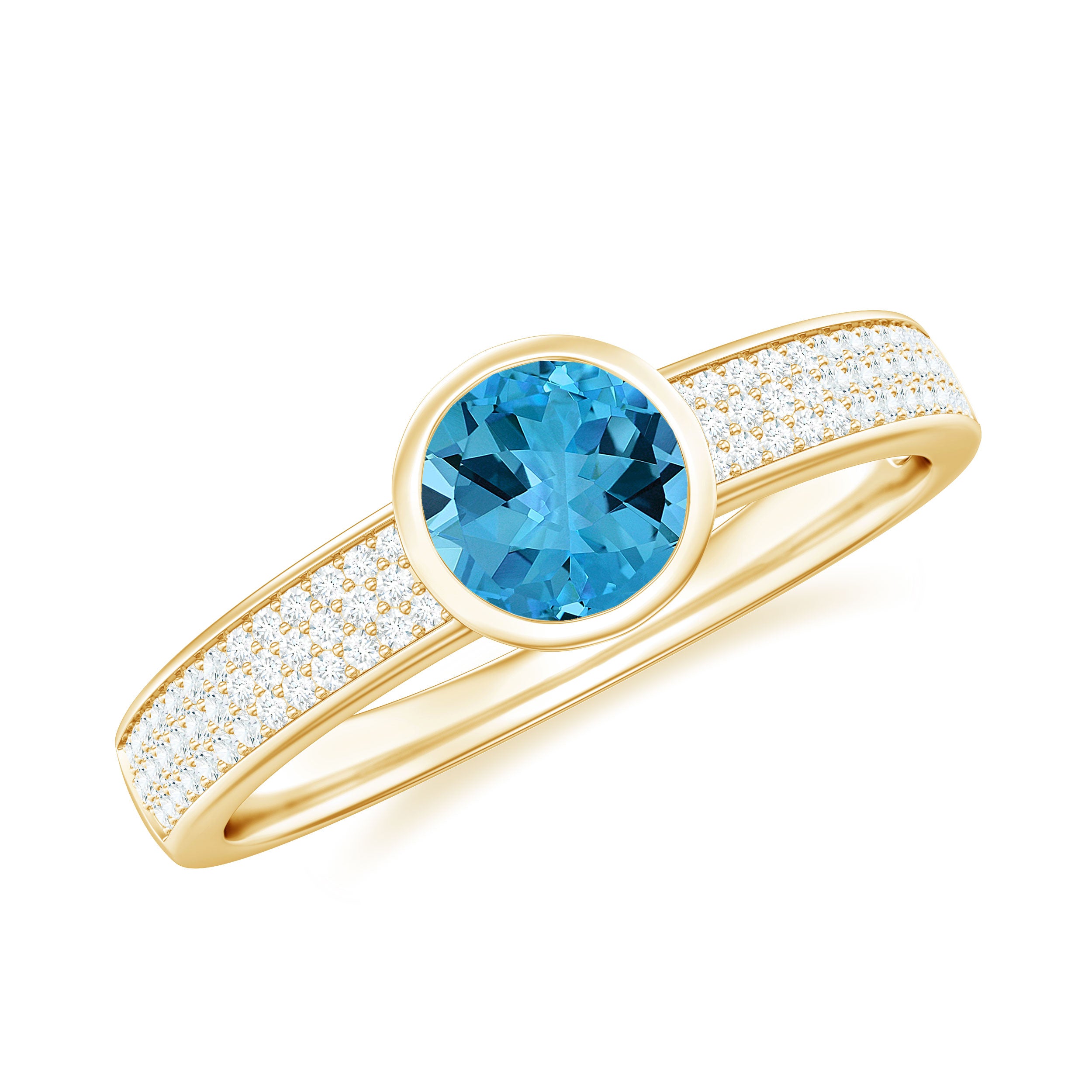 A Lovely and Beautiful Solitaire Ring has been embellished with Round Shape Swiss Blue Topaz set as a solitaire in a bezel setting and Round Shape Diamond as Side Stone. This Solitaire Ring is available in solid gold.