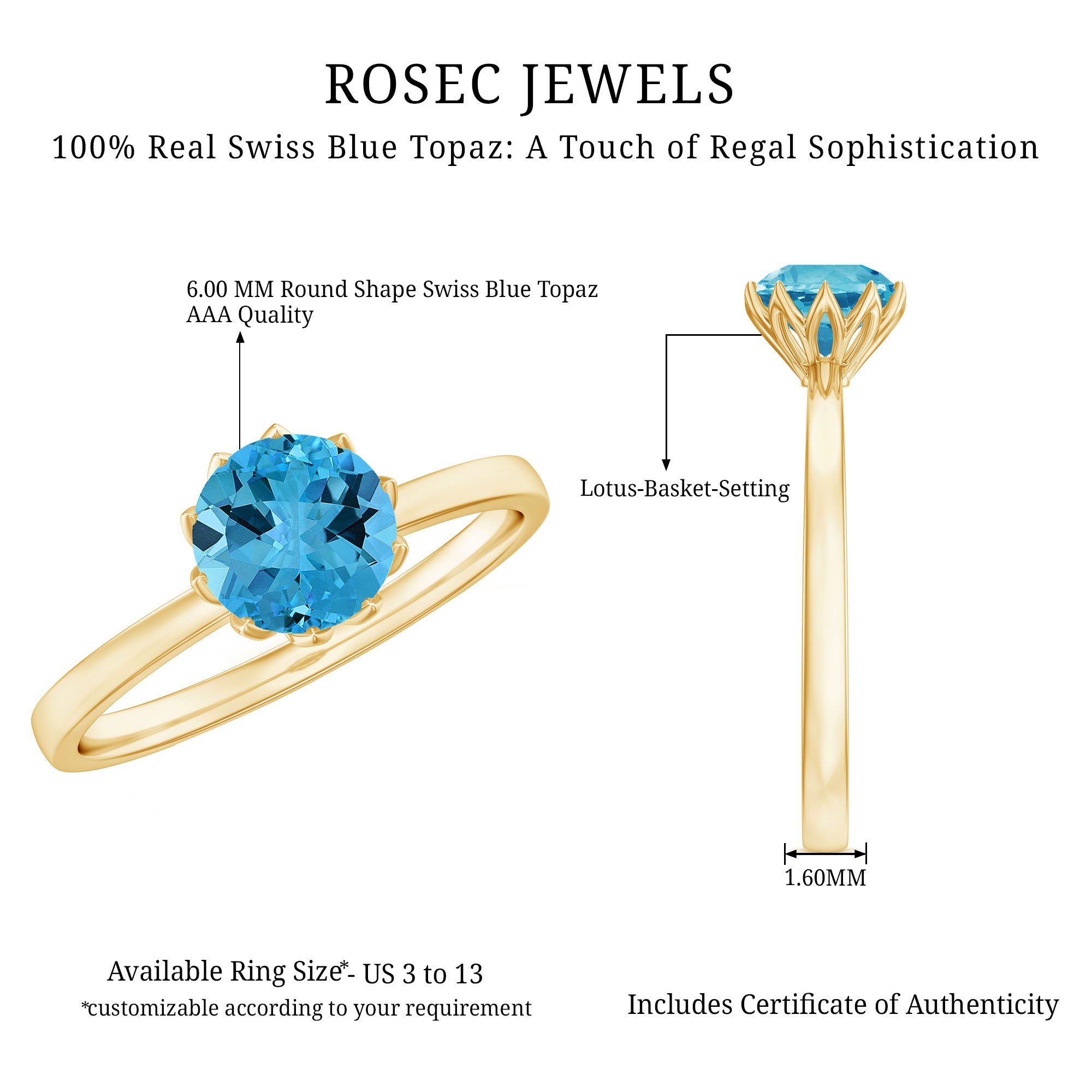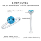 Get this adorable Swiss Blue Topaz Solitaire Ring to bring out your stand out look. Swiss Blue Topaz - Brilliant Cut Swiss Blue Topaz Gemstone exhibits AAA Quality and possess vibrant color. Semi-Precious December Birthstone summons prosperity and wealth. It is Natural and Certified, helps in bringing abundance, joy, and perfection to the wearer. Its Durability and Luster is enhanced by Heat and Irradiated Treatment, to further make it a captivating and desirable gem.