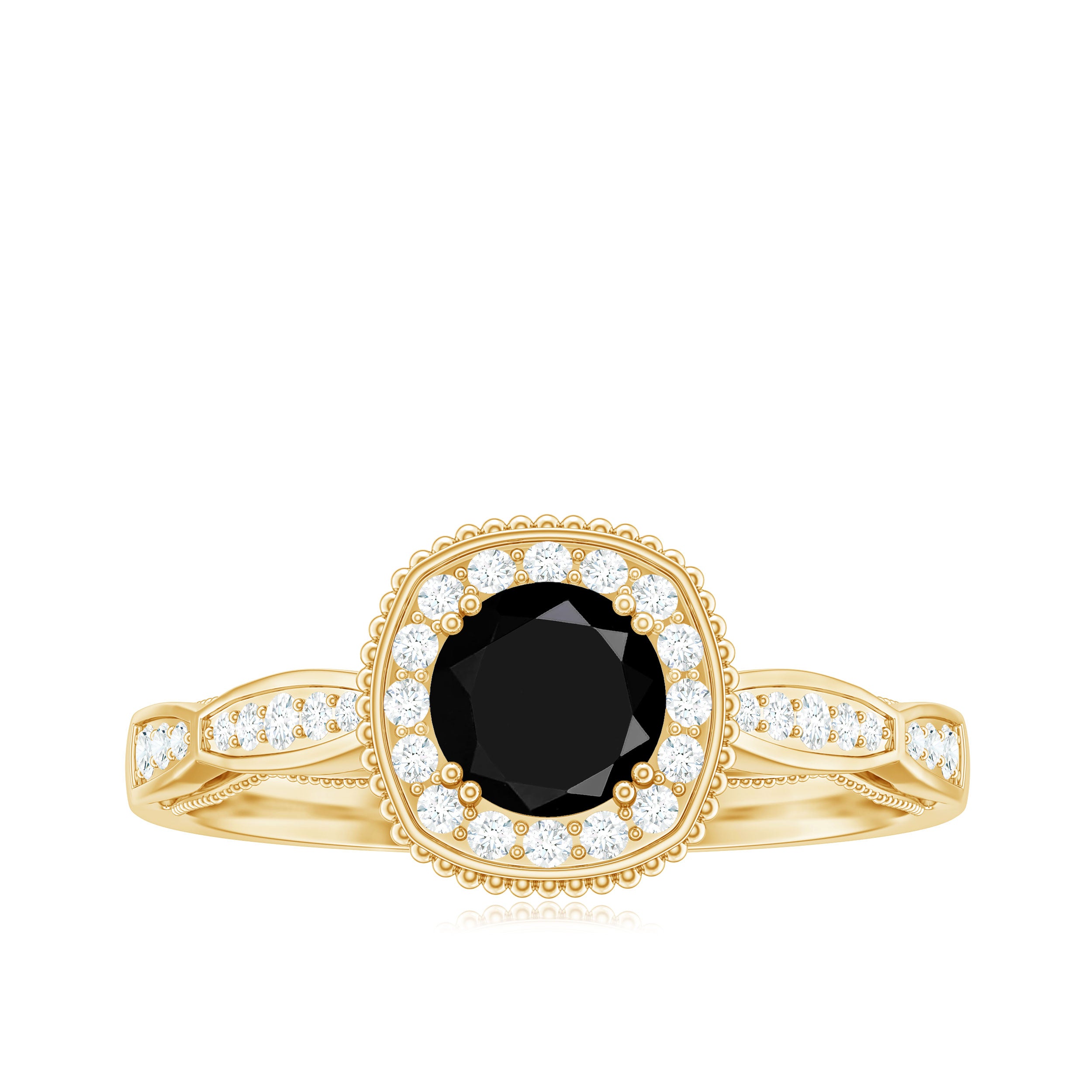 The littering Halo Engagement Ring features delicate Surface Prong Set Diamond Halo that encircle the center Round Shape Black Diamond with a designer shank, and adorn the band with Milgrain Detail. The Antique Design makes this ring light and feminine for a truly special look. Adorn yourself with our perfect black diamond and Diamond Engagement Ring on your big day.