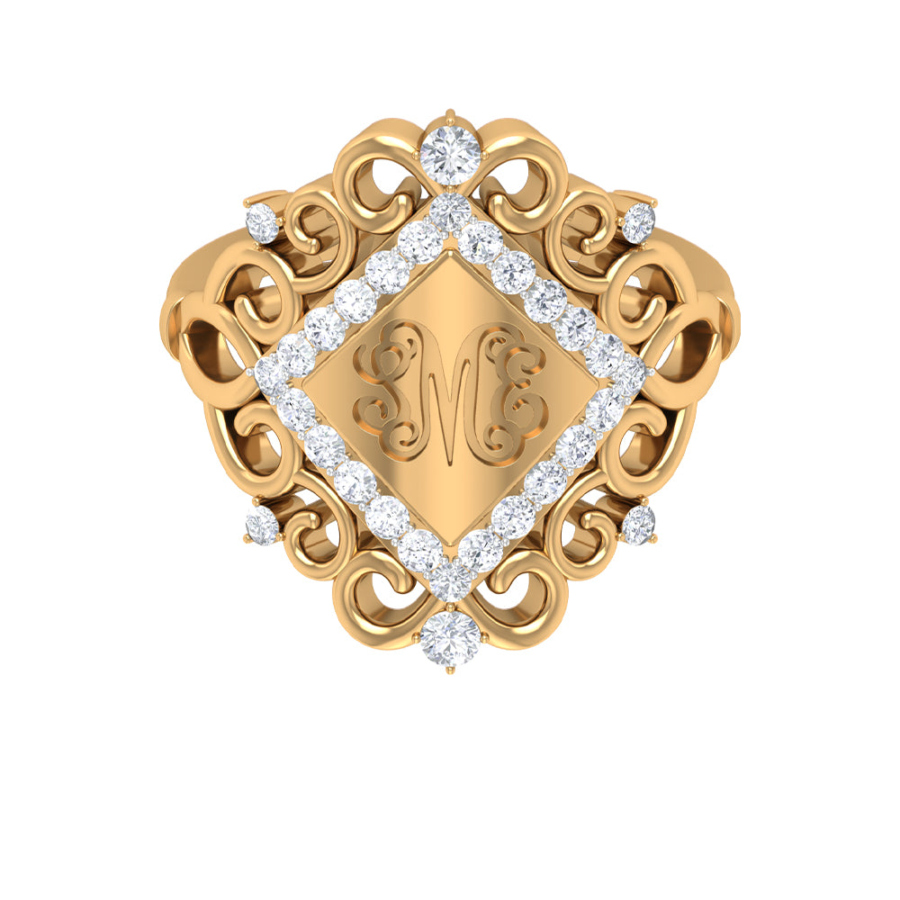 Unisex Art Deco-inspired ring with M engraving, adorned with round shape diamonds and intricate filigree design, crafted to perfection.