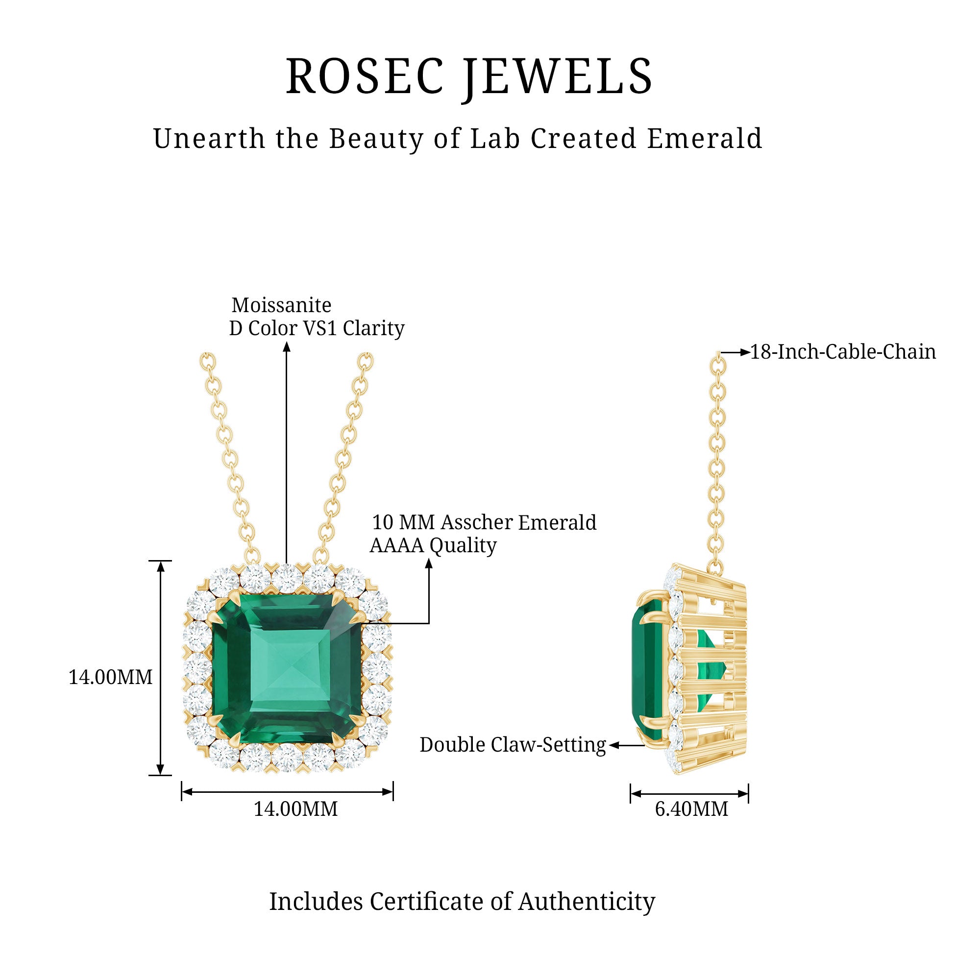 Turn heads and steal the spotlight with this bold and breathtaking Lab Grown Emerald Necklace, made to make a statement that lasts. Designed to be the center of attention, this Halo Pendant features a striking 10 MM Asscher Cut Lab Grown Emerald. Set in 14k yellow gold plated silver with a secure double claw setting, the large center stone radiates elegance and grandeur from every angle. Surrounding the emerald is a shimmering halo of Round Brilliant Cut Moissanite, creating a stunning contrast and adding extra brilliance that elevates the pendant’s luxurious feel. Suspended gracefully from a sleek cable chain, this piece sits beautifully at the collarbone, perfect for bridal wear, formal occasions, or a glamorous cocktail evening. Whether you are a bride seeking a standout piece for your big day or dressing up for a lavish celebration, this Halo Emerald Necklace delivers a look of sophistication. A perfect choice for weddings, bridal looks, anniversary dinners, or when you simply want to feel extraordinary.