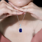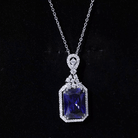 Anyone will be enchanted by the beauty of the Lab Grown Blue Sapphire Necklace. It is the ideal accessory for vintage enthusiasts who wish to enhance their neckline with something beautiful and unique. Made from 14k white gold plated silver, this Emerald Cut Sapphire Necklace elevates your appearance in just seconds. This Wedding Necklace features a 10X14 MM emerald cut lab grown blue sapphire set in prongs, surrounded by a moissanite halo and cluster. The stunning design of the Vintage Sapphire Necklace symbolizes grace and elegance, showcasing intricate details that make it a must-have for your collection. The AAAA Quality Lab Sapphire and D-VS1 Quality Moissanite are crafted to last, demonstrating exceptional workmanship. This Art Deco Necklace combines traditional and modern design elements that attract attention, spark conversations, and exude show-stopping glamour.