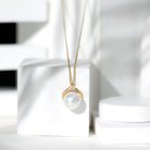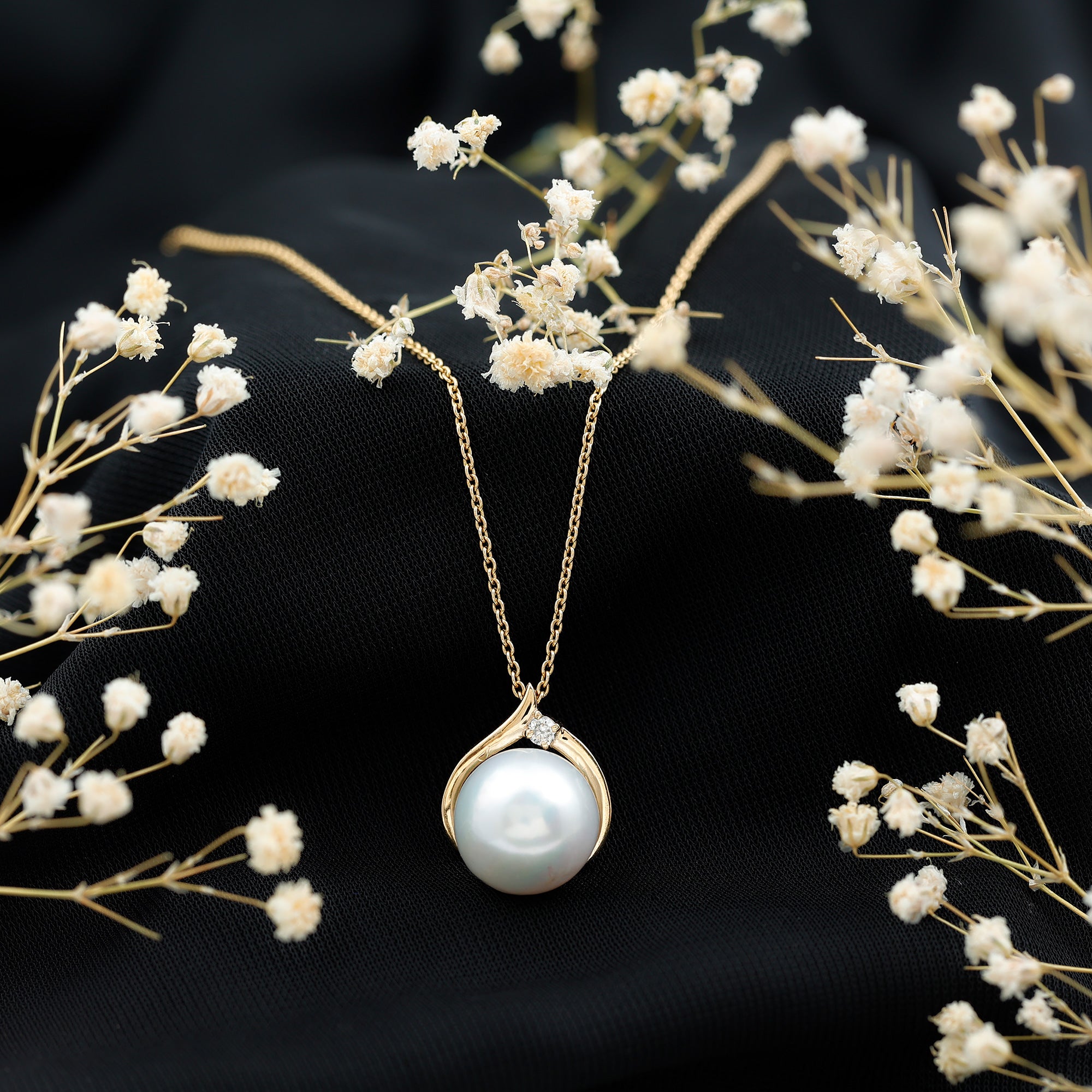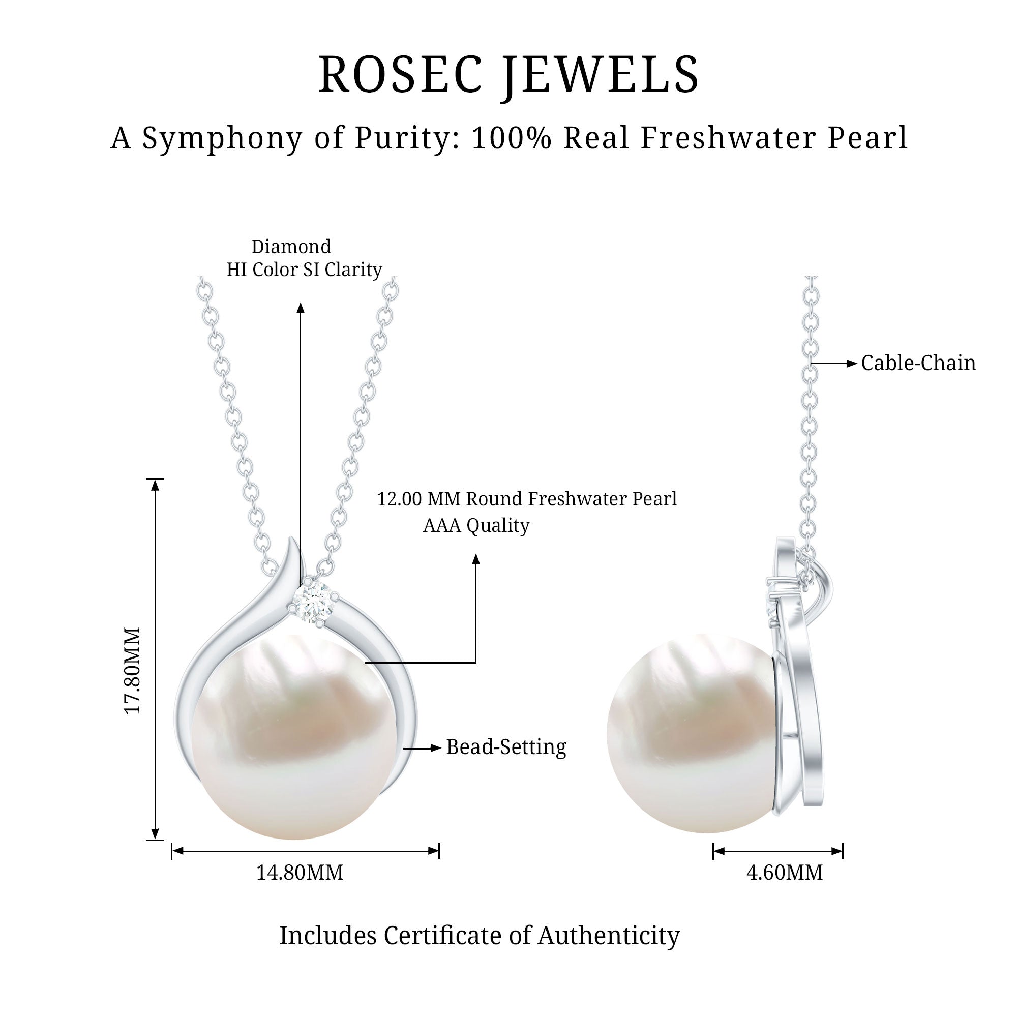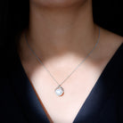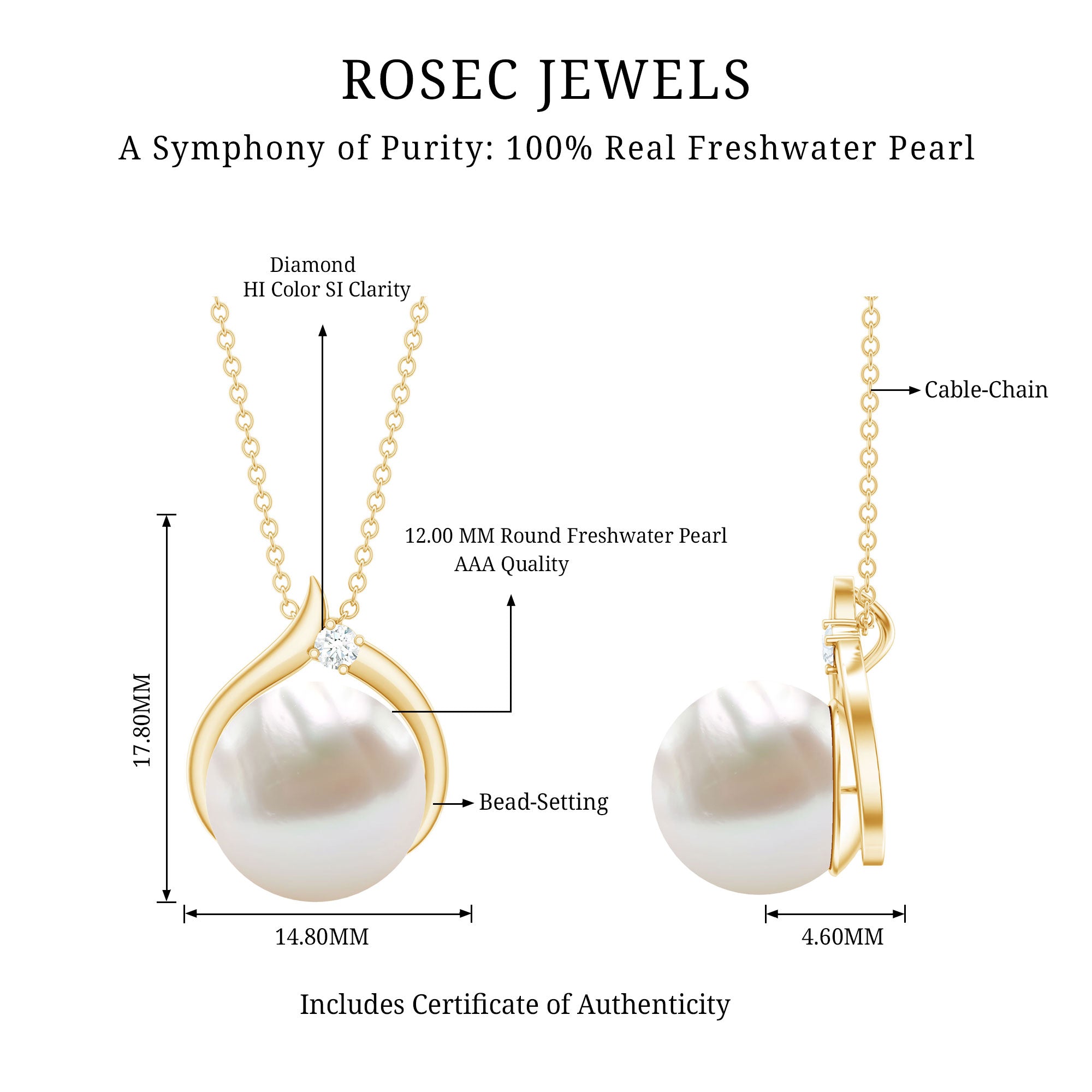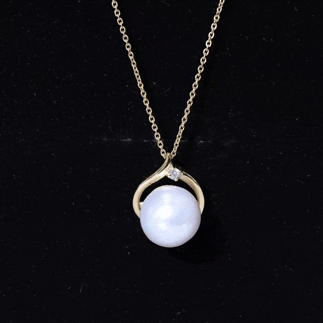The Solitaire Pendant is fitted with 12 MM Round Shape Freshwater Pearl in Bead Setting and Round Diamond studded in Prong Setting on Solid Gold crafted Petal Style. The Minimal Solitaire Necklace is a perfect piece for your lovely spouse.
