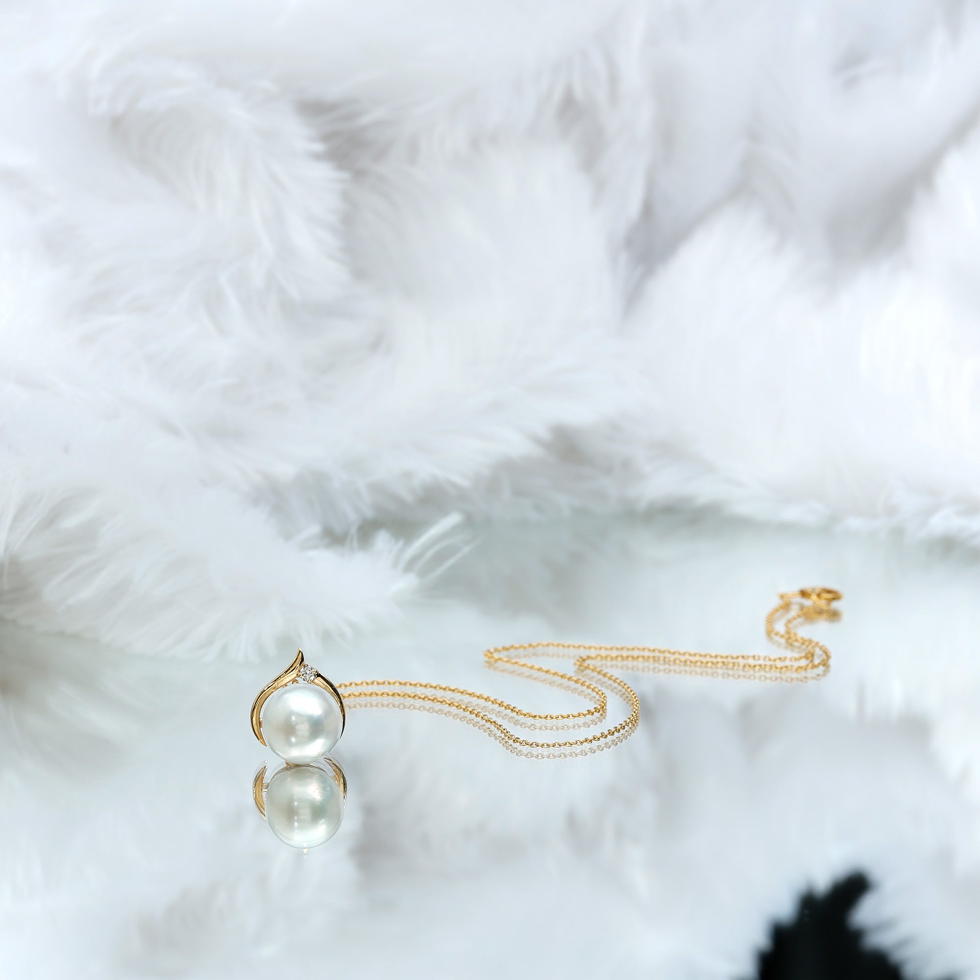 The Solitaire Pendant is fitted with 12 MM Round Shape Freshwater Pearl in Bead Setting and Round Diamond studded in Prong Setting on Solid Gold crafted Petal Style. The Minimal Solitaire Necklace is a perfect piece for your lovely spouse.