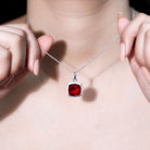 A dazzling masterpiece that seamlessly blends elegance with timeless beauty. This everlasting Red Gem Pendant features a 12 MM cushion cut lab created ruby gemstone framed in a moissanite halo, creating a perfect contrasting look anybody would love. The Cushion Cut Pendant Necklace beholds the classic shine of AAAA Quality Lab made Ruby and D-VS1 Quality Moissanite stones, which makes the wearer the center of attraction. A true statement piece, it hangs from a strong cable chain with a lobster clasp, which helps you to adjust the length effortlessly. We curated this Ruby and Moissanite Necklace with an evergreen design that transcends fleeting trends. For brides looking for a bold and statement making accessory for their wedding day, this design is carefully crafted to maintain a classic and enduring appeal. This jewelry piece effortlessly elevates any outfit and can be enjoyed for years to come. The Halo Pendant will be delivered in the classic velvet pouch with the certificate of authenticity. Present this pendant to your special one and witness a priceless reaction from her that will be cherished forever.