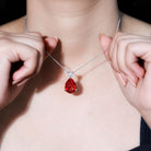 This Lab Grown Orange Sapphire Necklace is a stylish and adaptable choice for any occasion. Featuring a breathtaking and huge pear cut orange sapphire gemstone (18X13 MM Lab Created) securely set in prongs, along with a delicate heart shaped moissanite at the top, it radiates elegance. The vibrant hue represents passion and warmth, making it a meaningful selection for anyone. With a total carat weight of 9 CT, this Solitaire Sapphire Necklace dazzles with its bold sparkle. Made from high-quality 14k white gold plated sterling silver, it combines durability with timeless beauty. The sterling silver setting provides a stunning contrast to the lab orange sapphire, ensuring lasting quality. The Teardrop Pendant comes with a matching cable chain, creating a complete and ready-to-wear piece. Our dedication to excellence guarantees that you receive a carefully crafted product that adheres to the highest design and quality standards. Elegant, large, and unforgettable - this Silver Statement Necklace is perfect for those who want to shine uniquely on their special day.