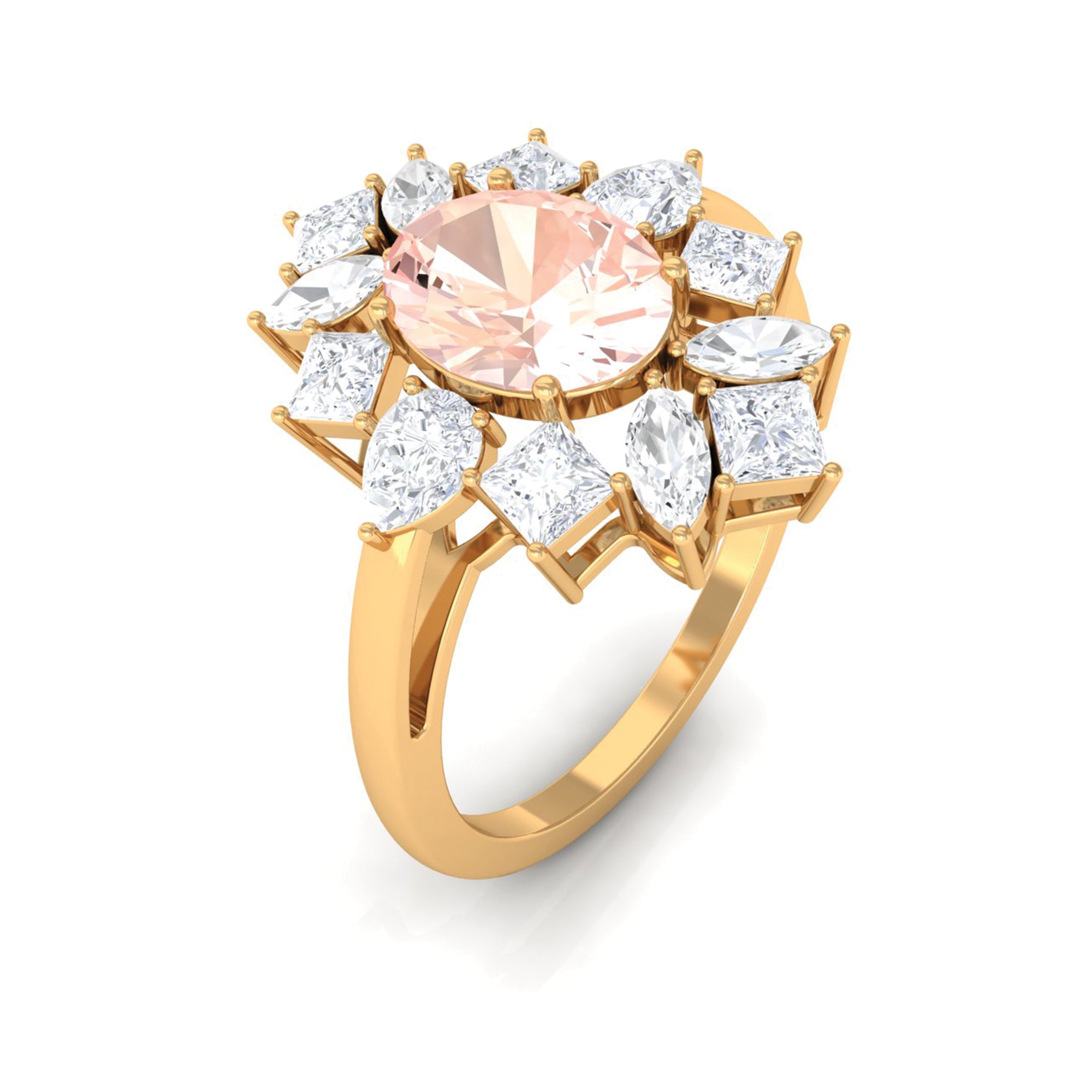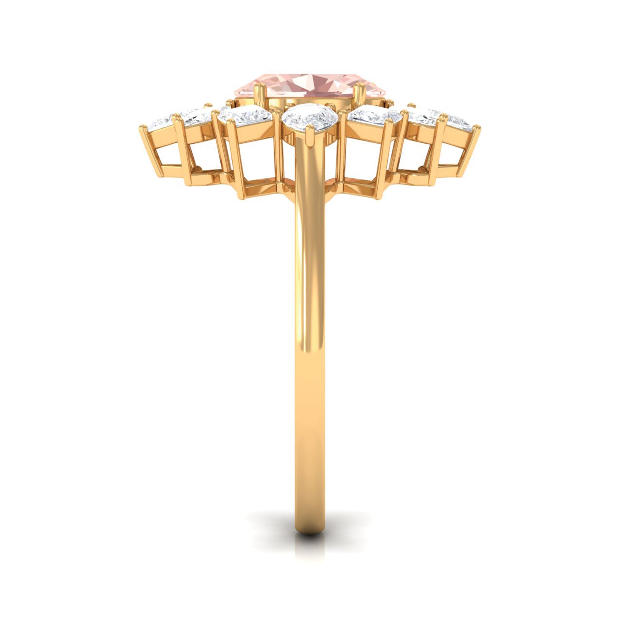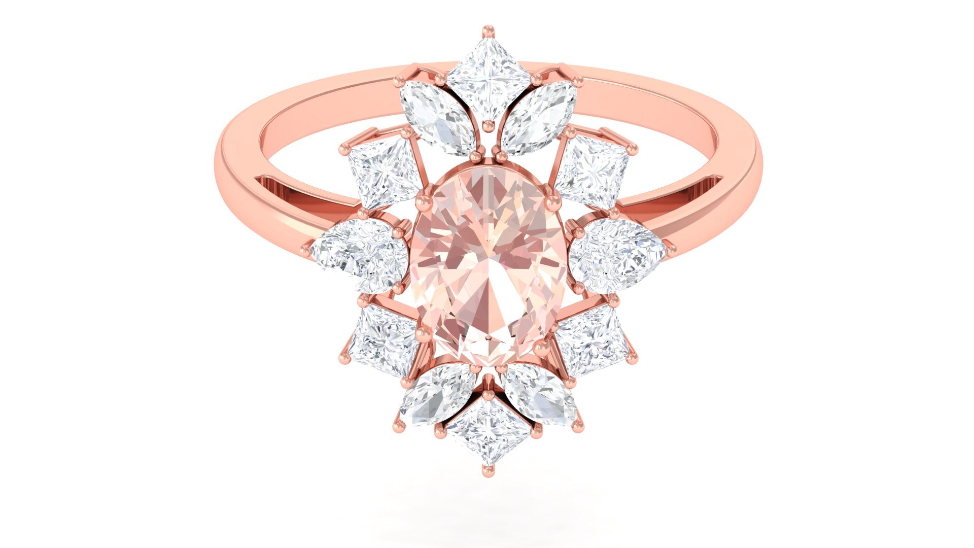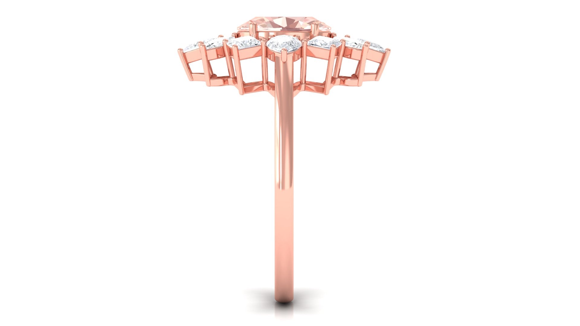This Beautiful Morganite Cocktail Ring is an excellent selection for Her. Embellished with Oval Cut Morganite in the center with Marquise, Pear, and Princess Cut Moissanite as a halo in a prong setting. This Lovely October Birthstone Ring is mounted in Gold metal makes for a magnificent choice.