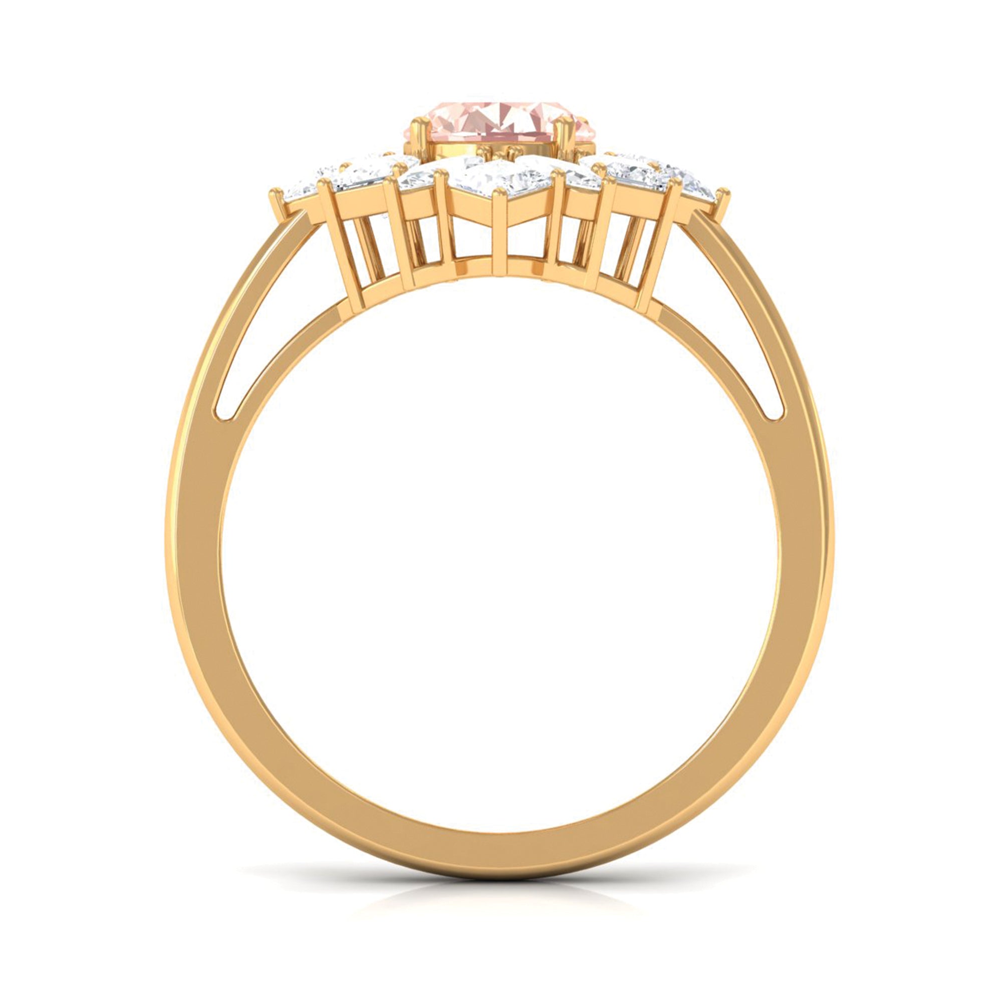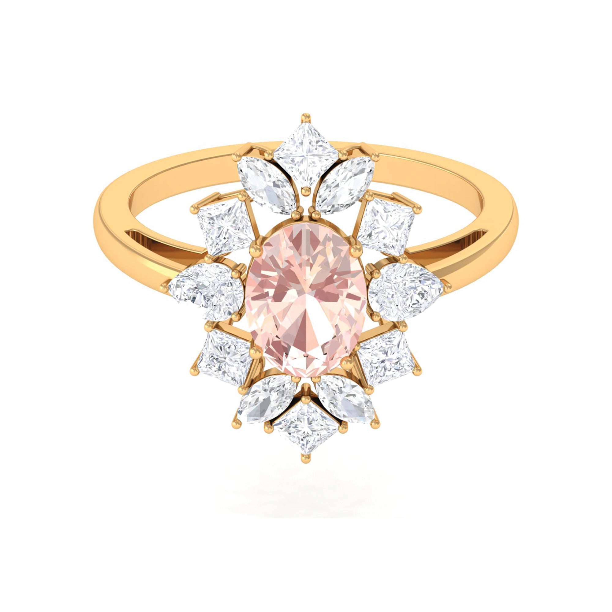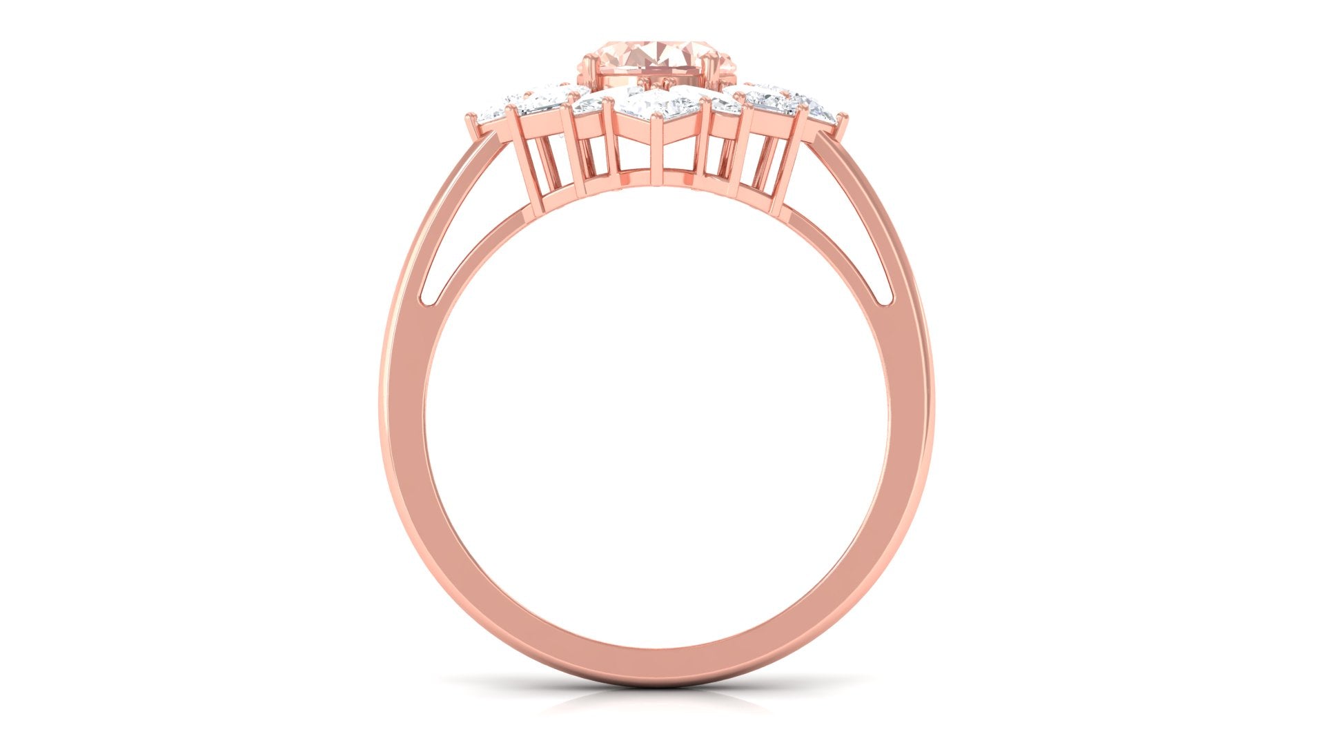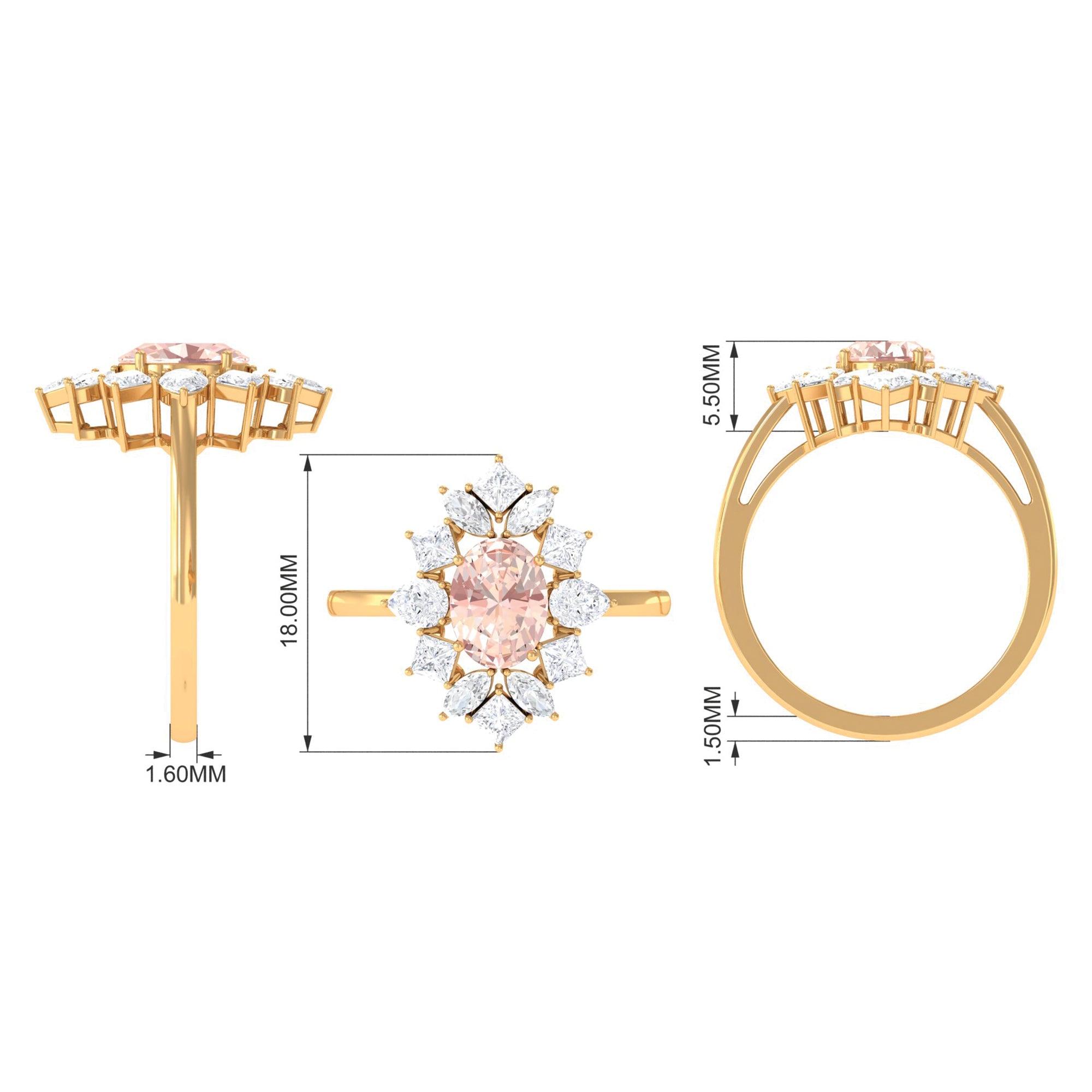 This Beautiful Morganite Cocktail Ring is an excellent selection for Her. Embellished with Oval Cut Morganite in the center with Marquise, Pear, and Princess Cut Moissanite as a halo in a prong setting. This Lovely October Birthstone Ring is mounted in Gold metal makes for a magnificent choice.