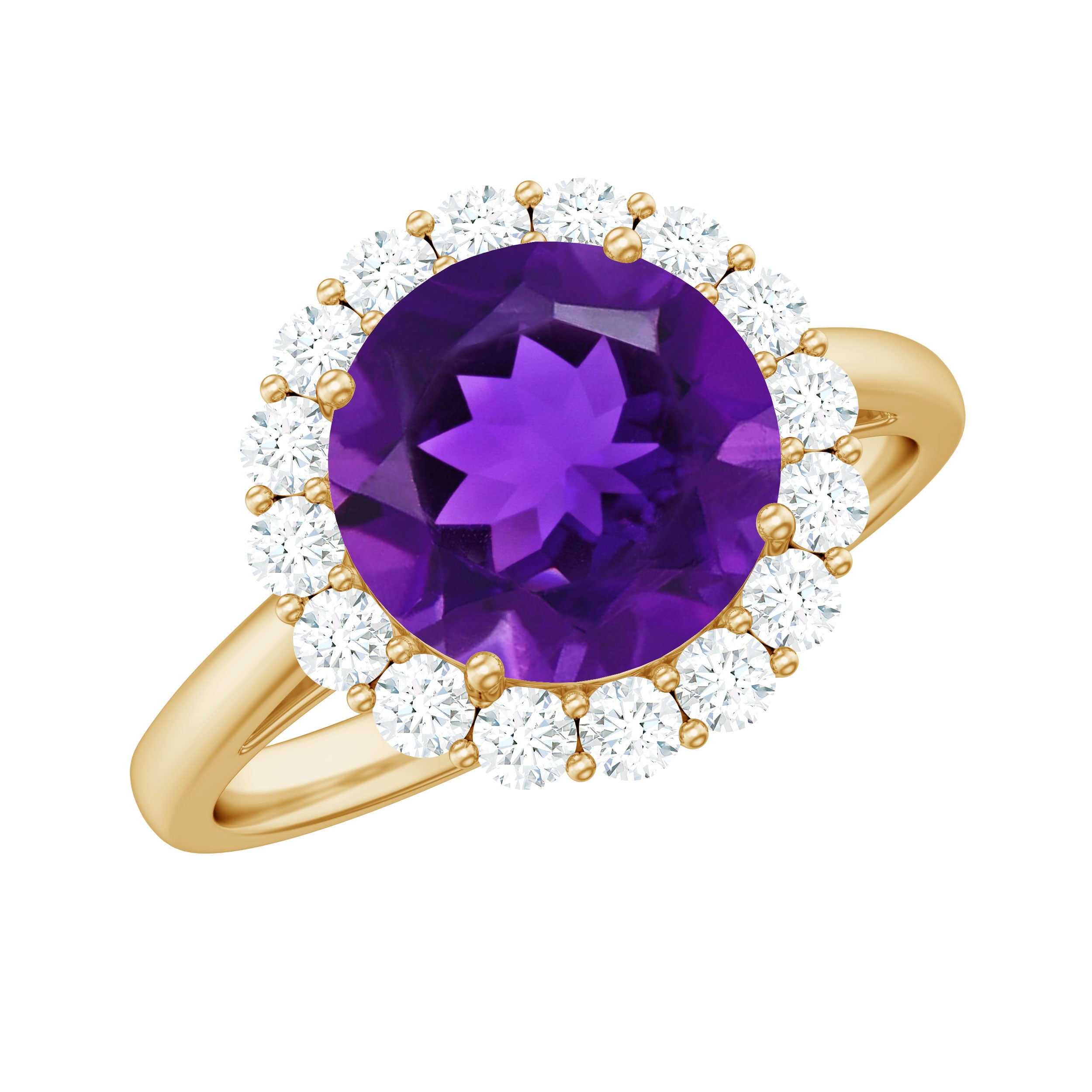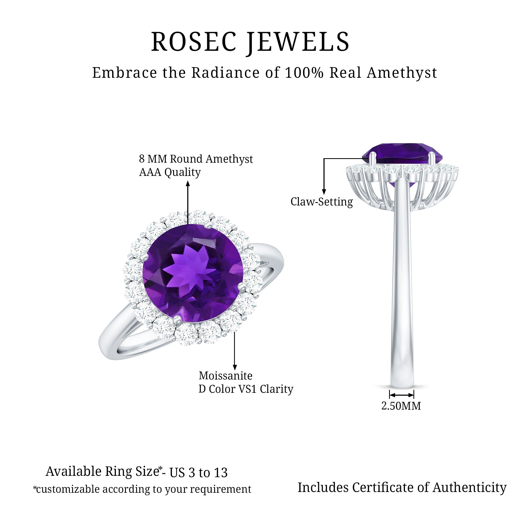 The Engagement Ring is designed with Round Shape Amethyst and Moissanite Halo. This 8 MM Amethyst Engagement Ring in Halo Setting will be a perfect gift for a woman.