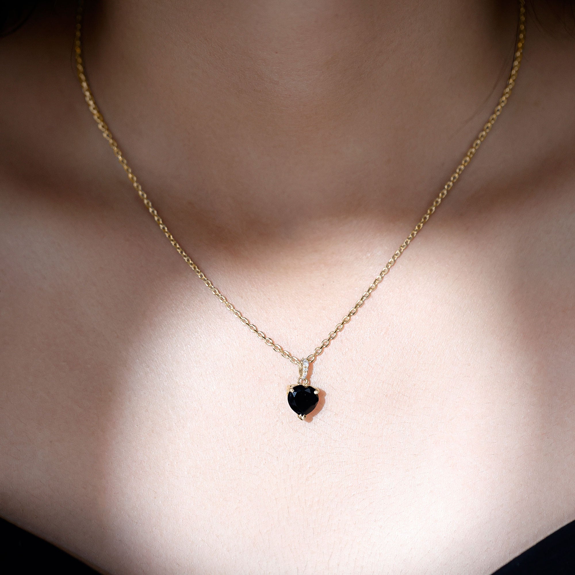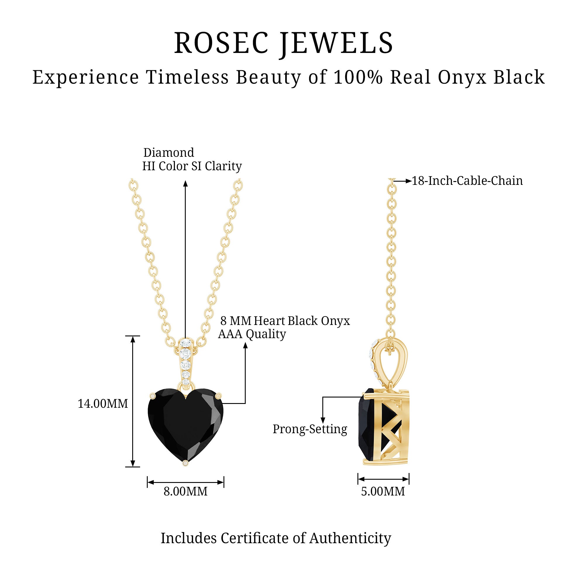 Express your boundless love for your ladylove through this enchanting Beautiful Pendant. Adorned with an 8 MM Heart Shape Black Onyx, delicately set in a 3-Prong-Setting, and accentuated with Round Shape Diamond, this solitaire pendant exudes a captivating charm. Crafted with utmost care, this gorgeous pendant is composed of Solid Gold, symbolizing the depth and purity of your affection.