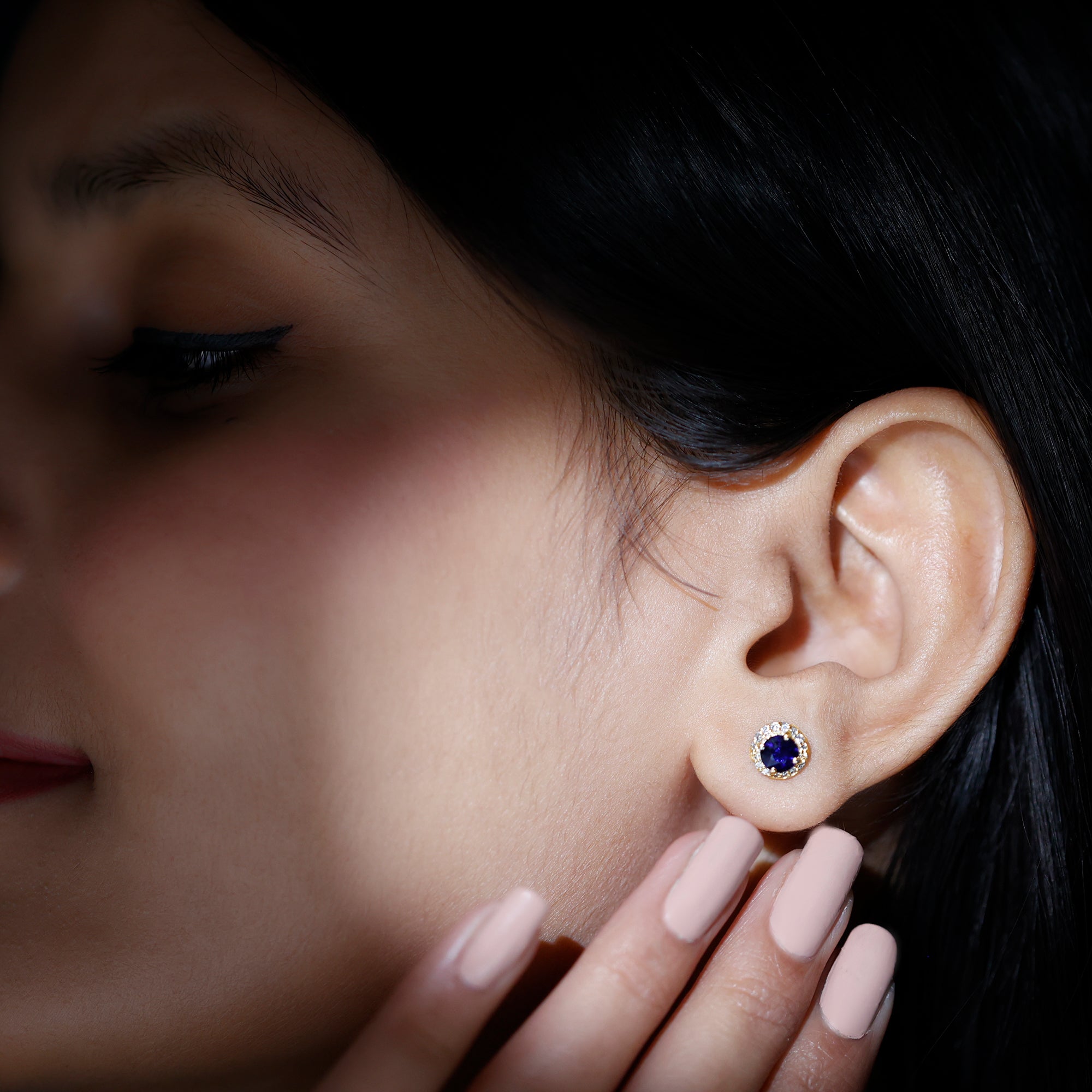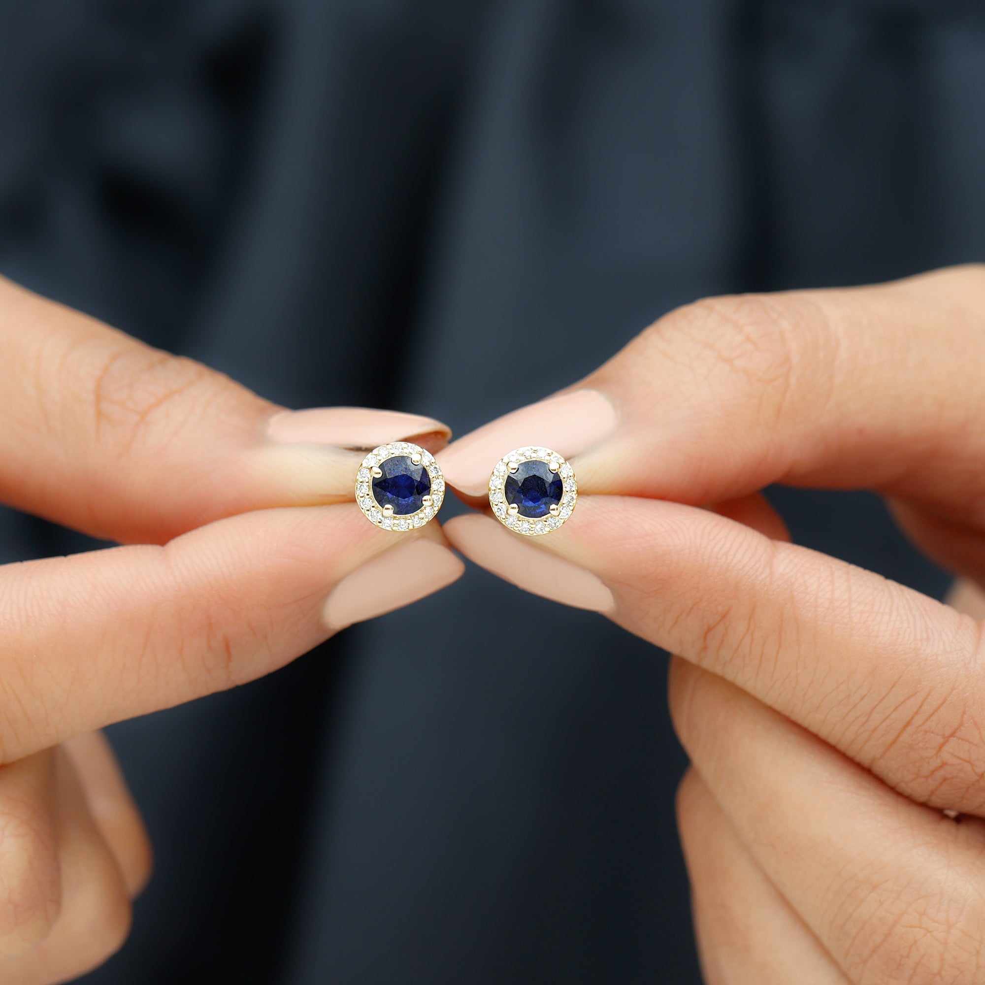 Crafted in Solid Gold, this stunning stud earring is adorned with a Round Shape Blue Sapphire gemstone set in the center in a Prong Setting, and surrounded by a halo of Round Shape Diamond. This accessory is a perfect addition to any outfit and suitable for any occasion.