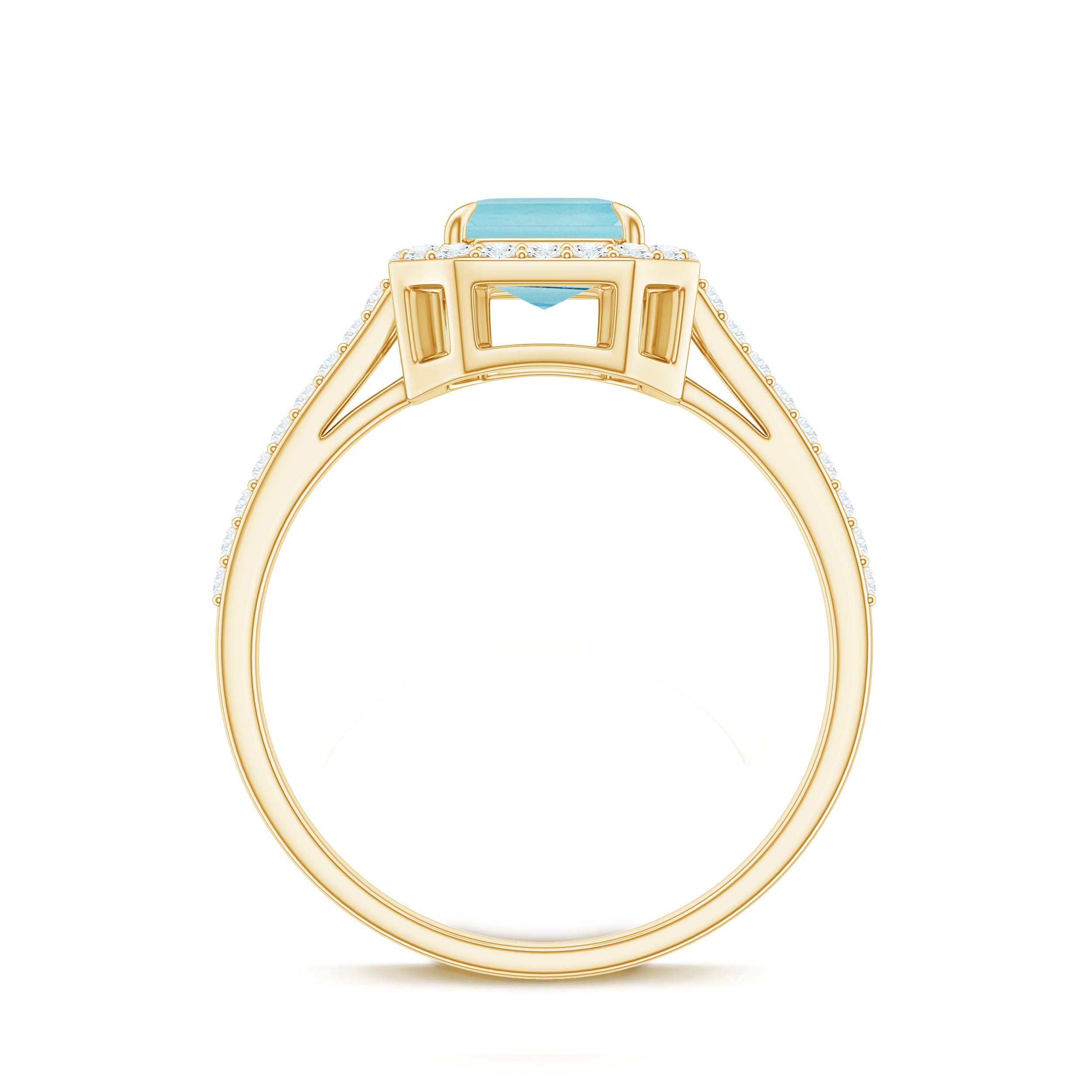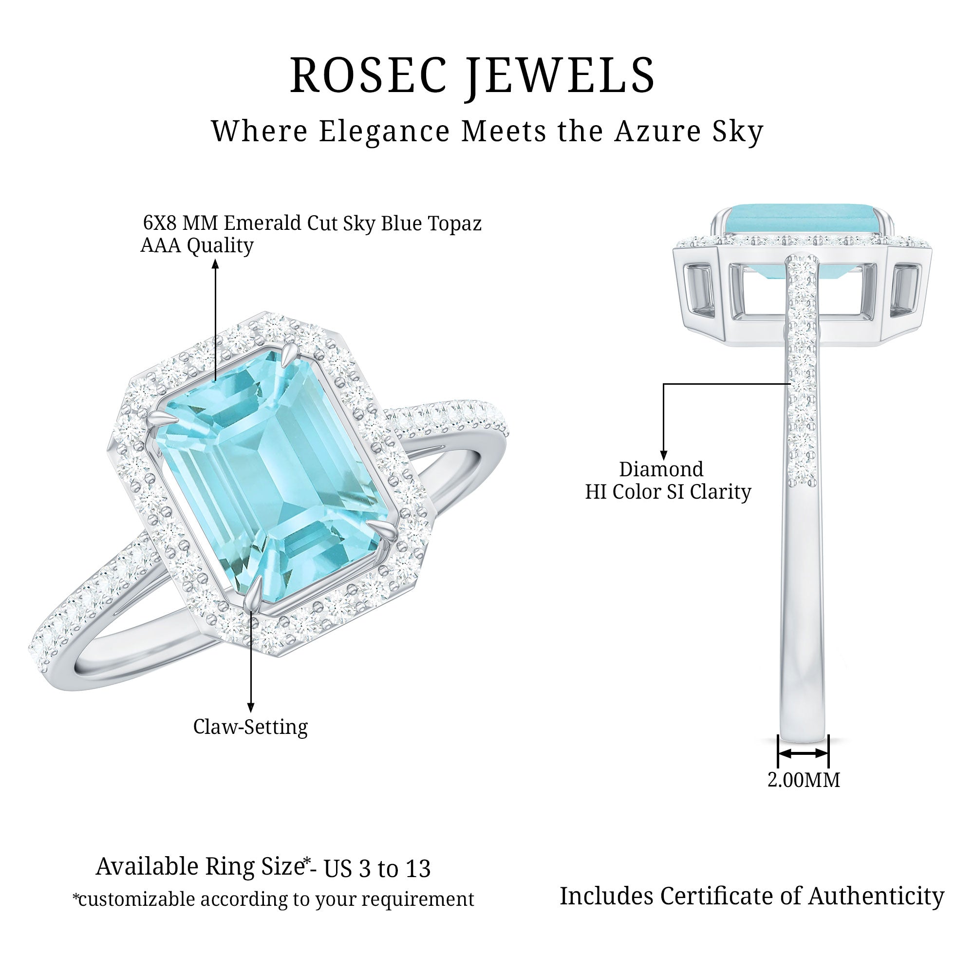 Make a statement with this Emerald Cut Shape Sky Blue Topaz Classic Engagement Ring, adorned with a Diamond Halo. The ring features a stunning Emerald Cut-cut Sky Blue Topaz set in a prong setting, surrounded by a dazzling halo of Diamond stones that adds to its luxurious appeal. The Sky Blue Topaz is known for its calming and soothing energy, making it a perfect symbol of love and serenity. The classic design of this engagement ring exudes sophistication and elegance, making it a timeless piece that will be cherished for years to come. This ring is a perfect choice for any bride-to-be who wants a unique and captivating engagement ring.