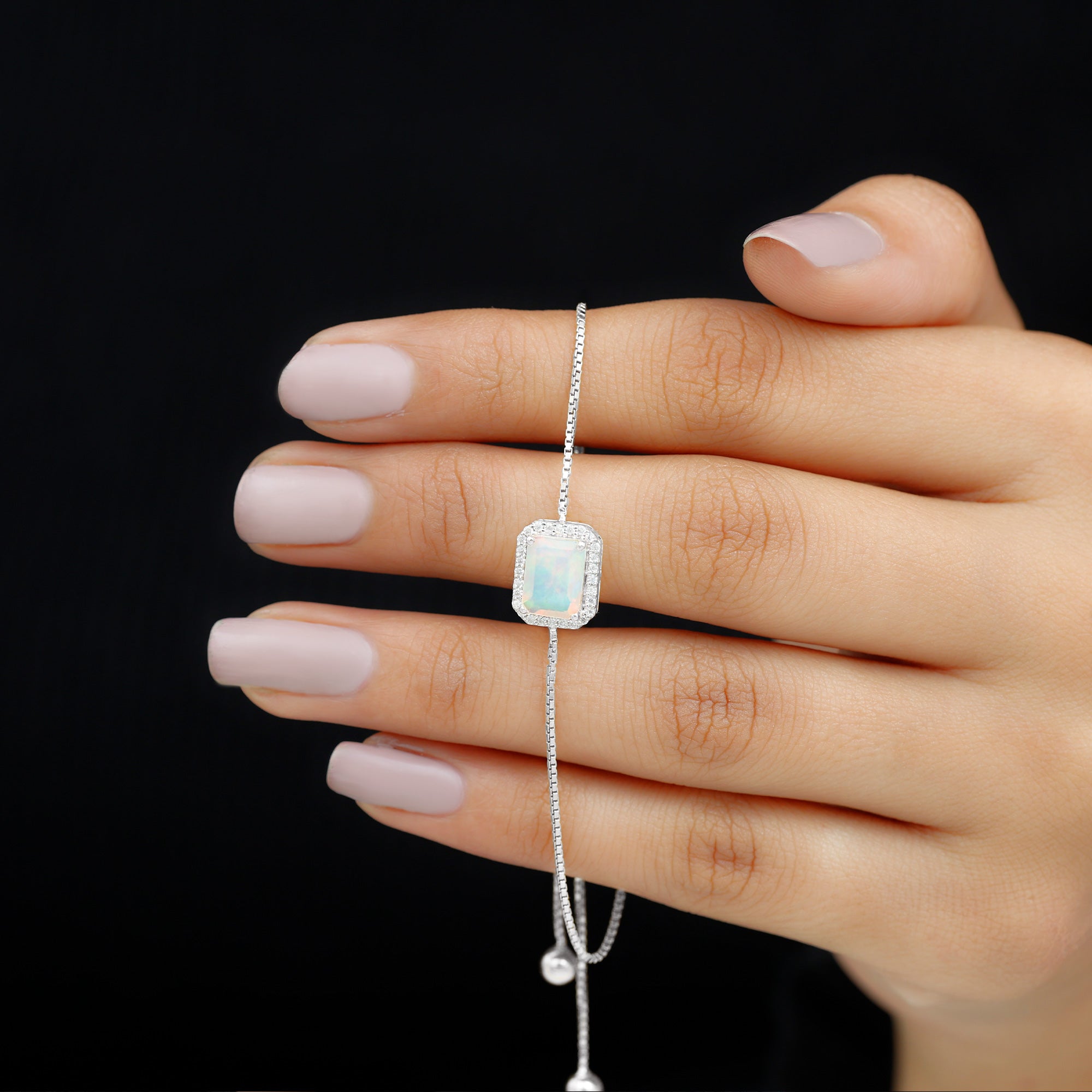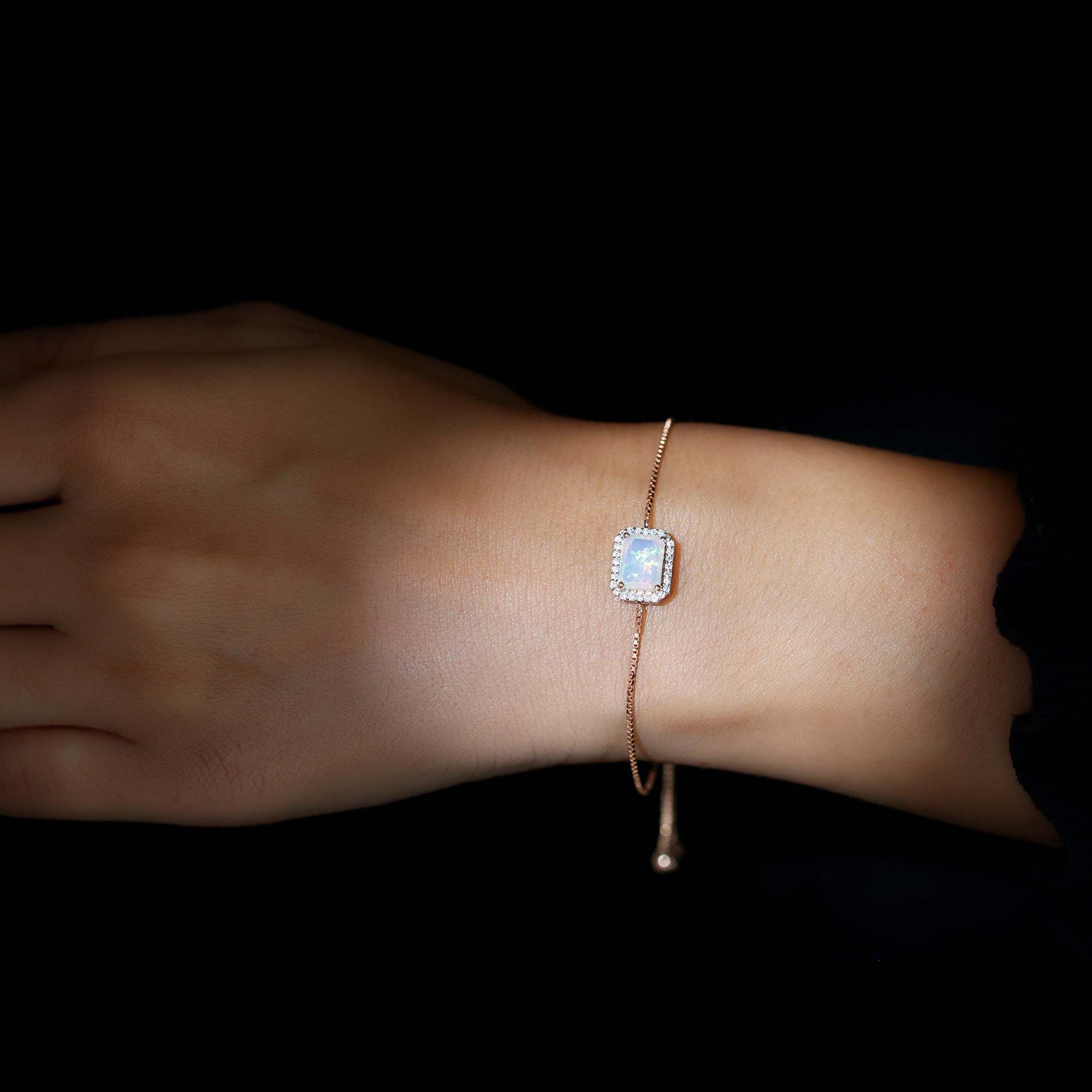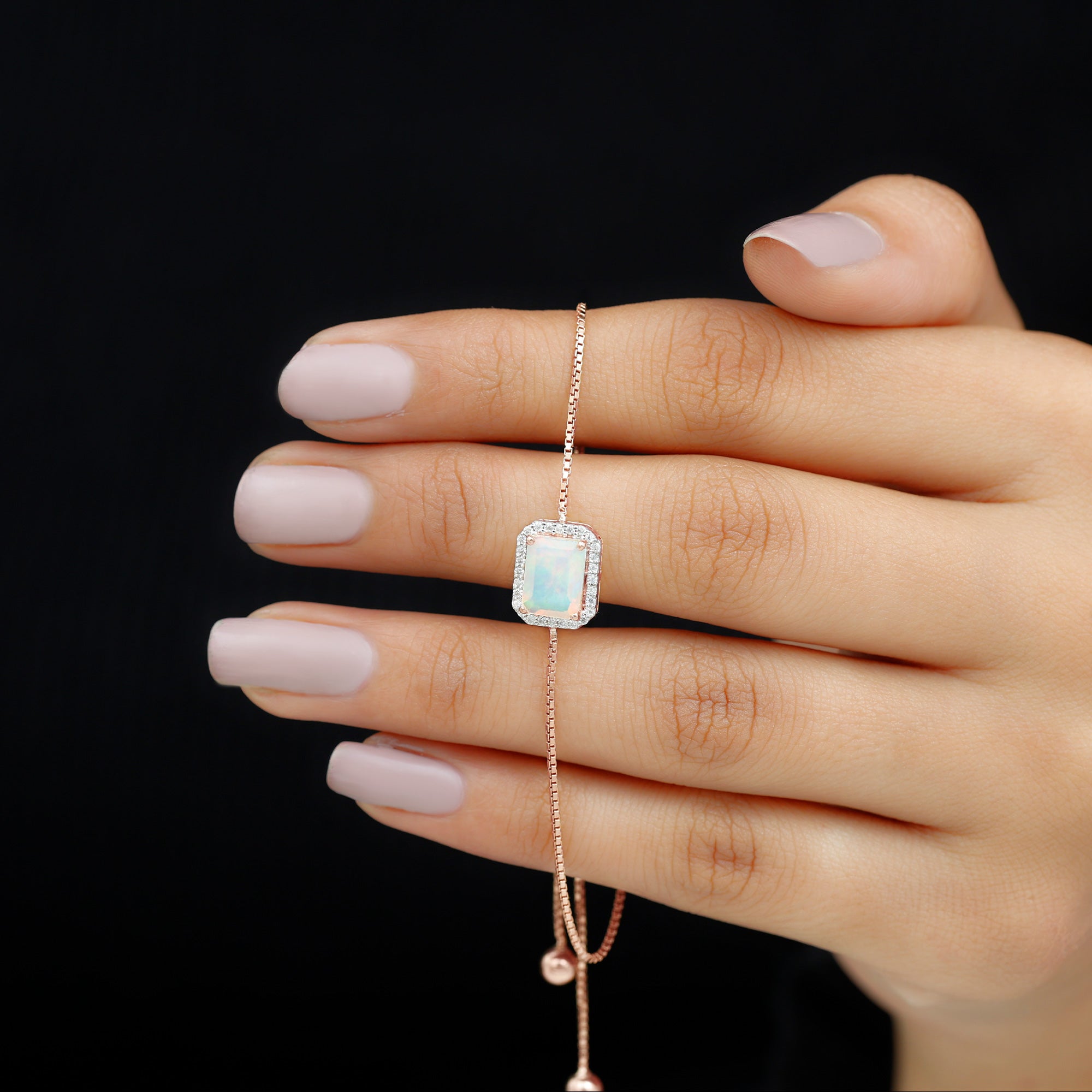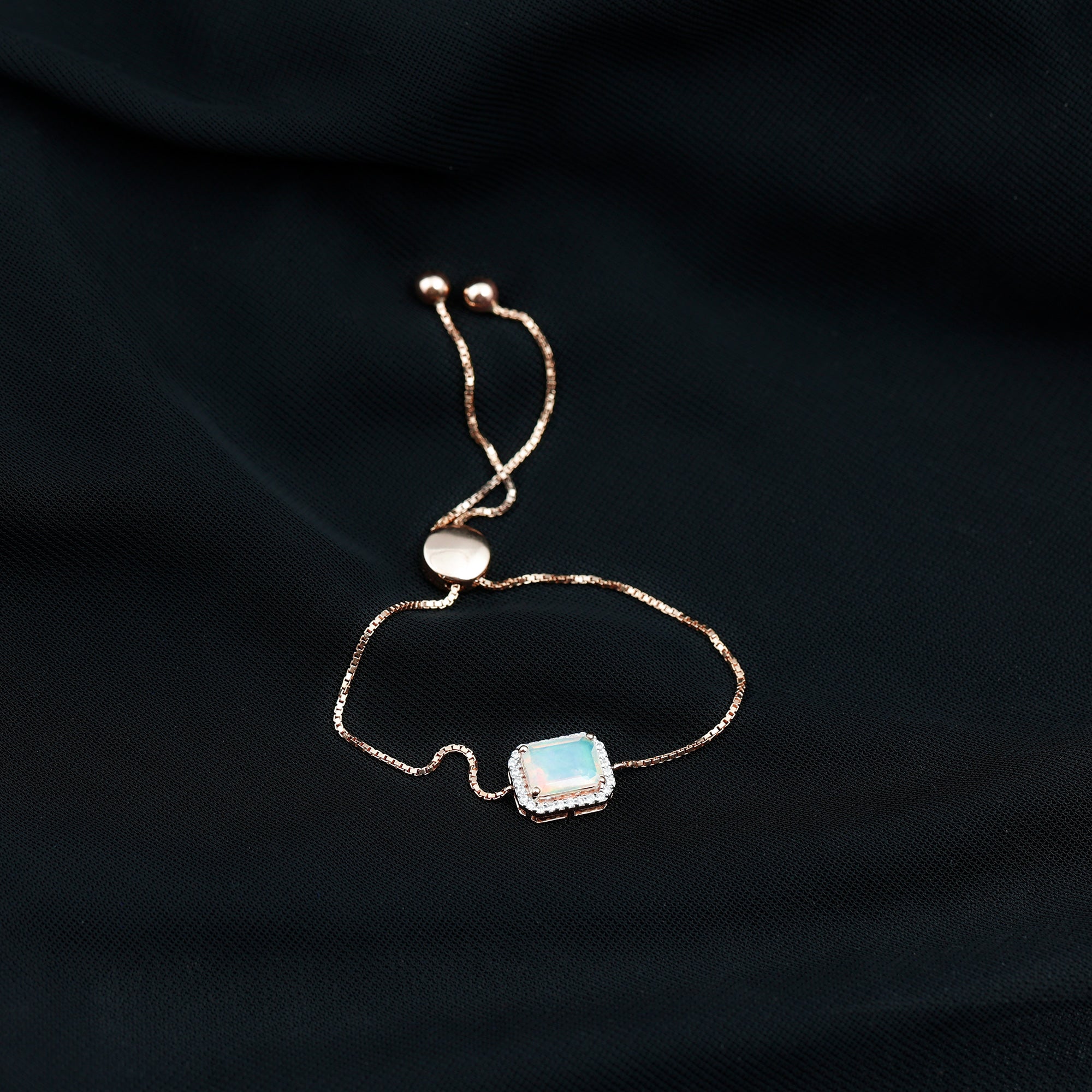 Enhance your Beauty with this Beautiful Gold Bolo Chain Bracelet embellished with Octagon Cut Ethiopian Opal in Prong Setting with Diamond Accent, crafted in Solid Gold Metal.
