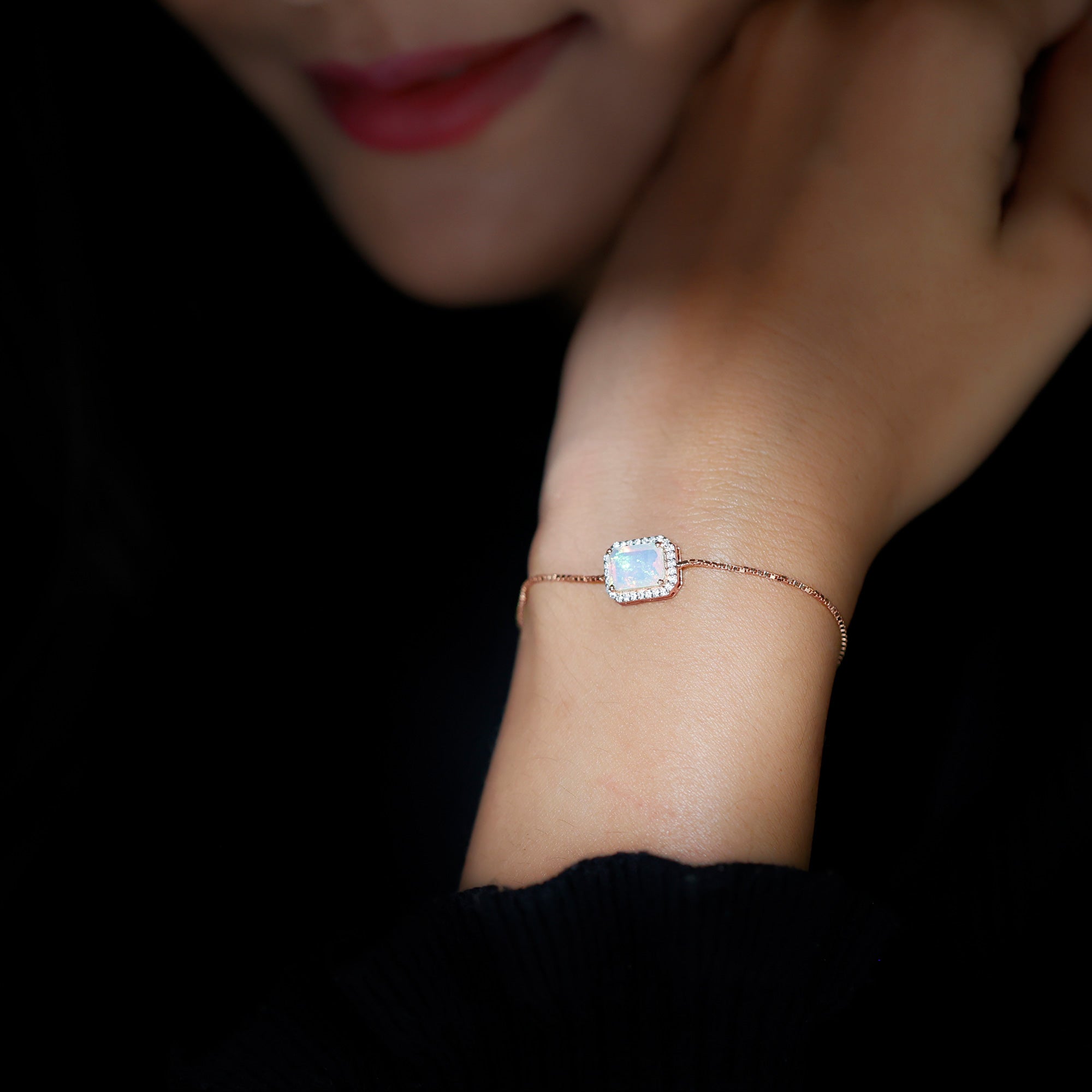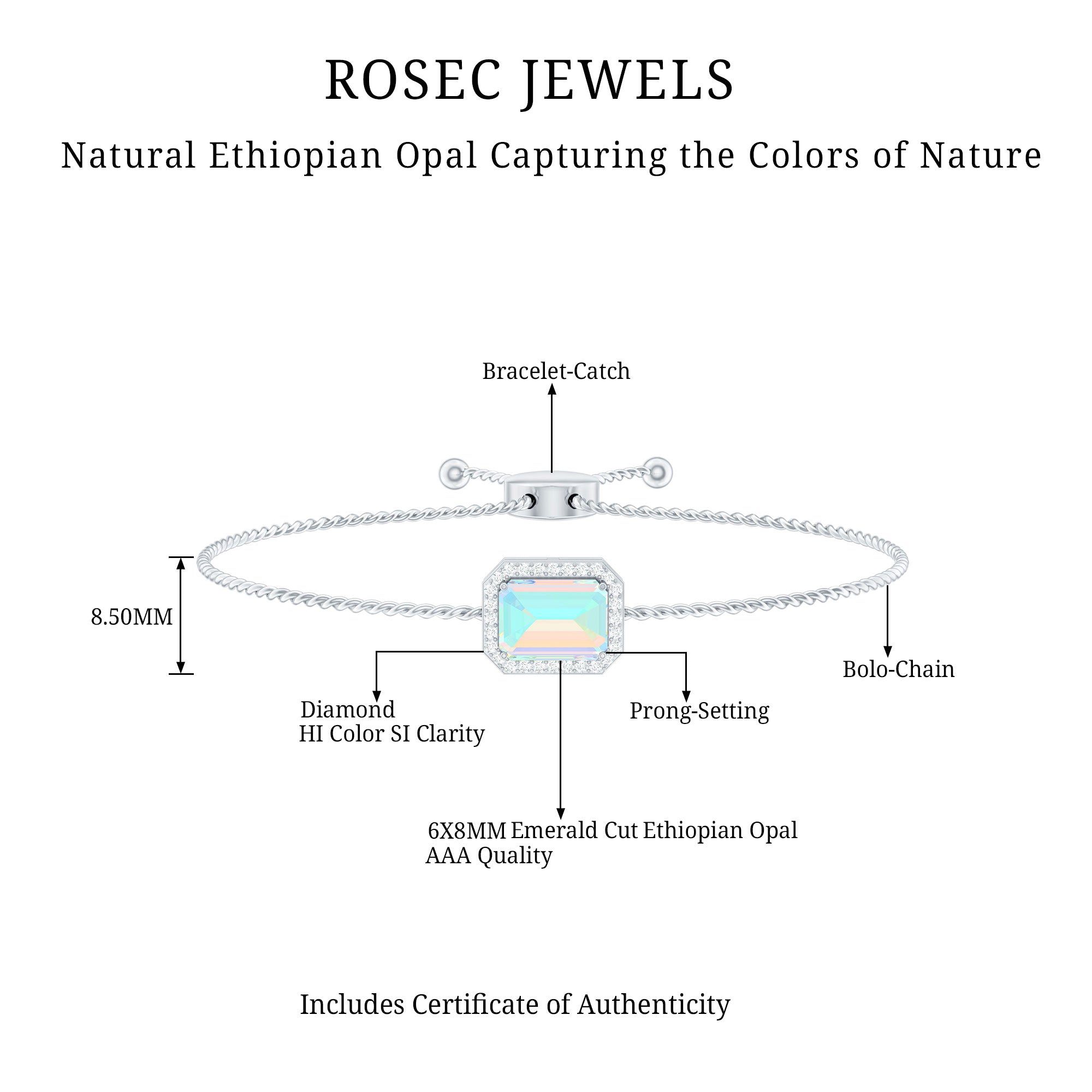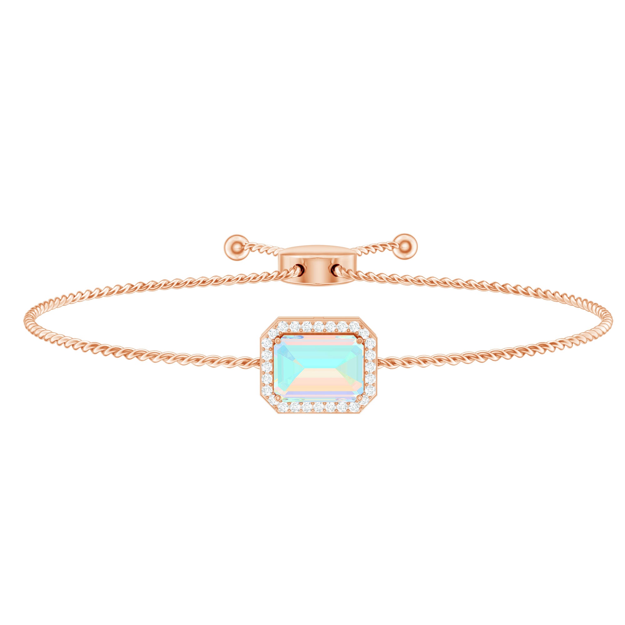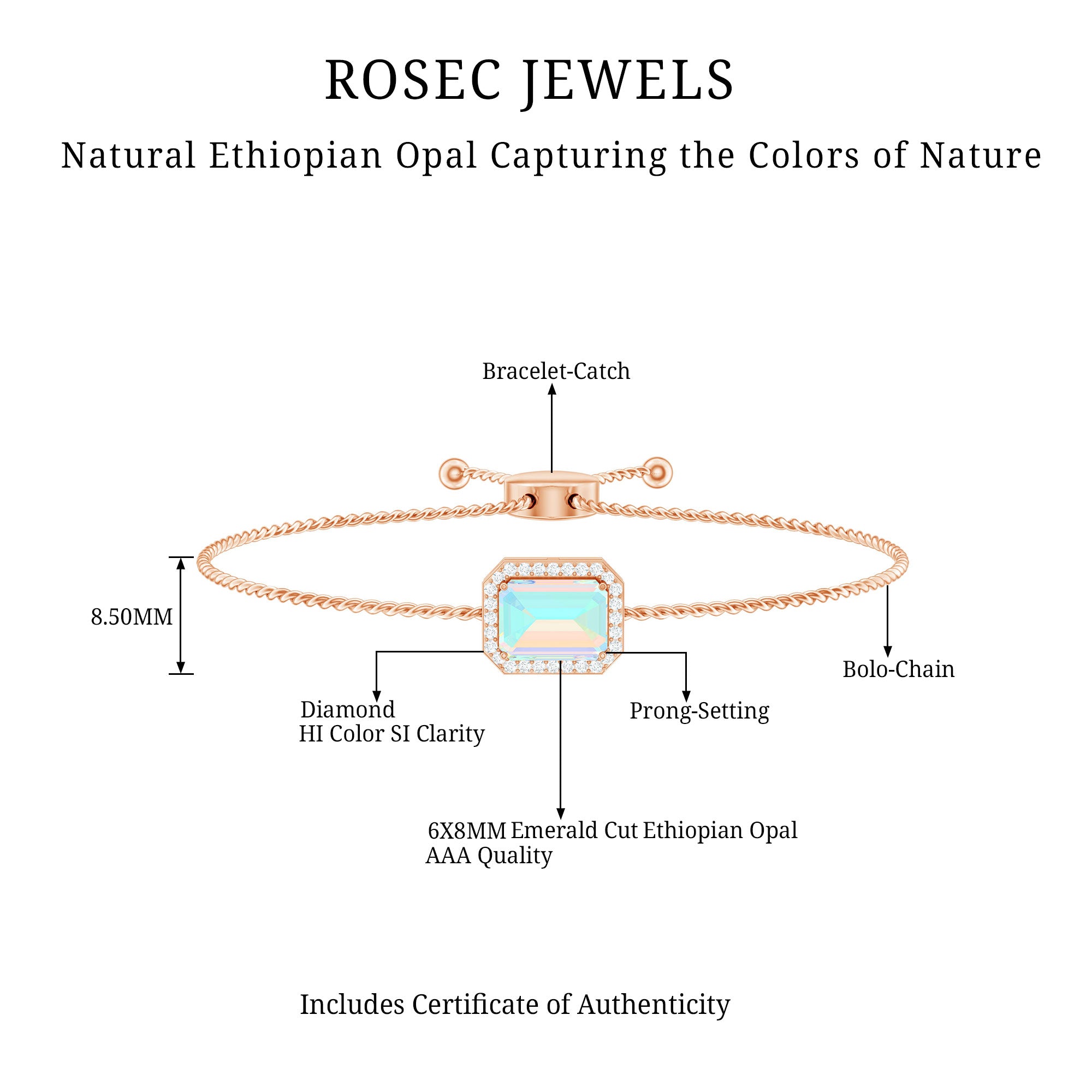 Enhance your Beauty with this Beautiful Gold Bolo Chain Bracelet embellished with Octagon Cut Ethiopian Opal in Prong Setting with Diamond Accent, crafted in Solid Gold Metal.