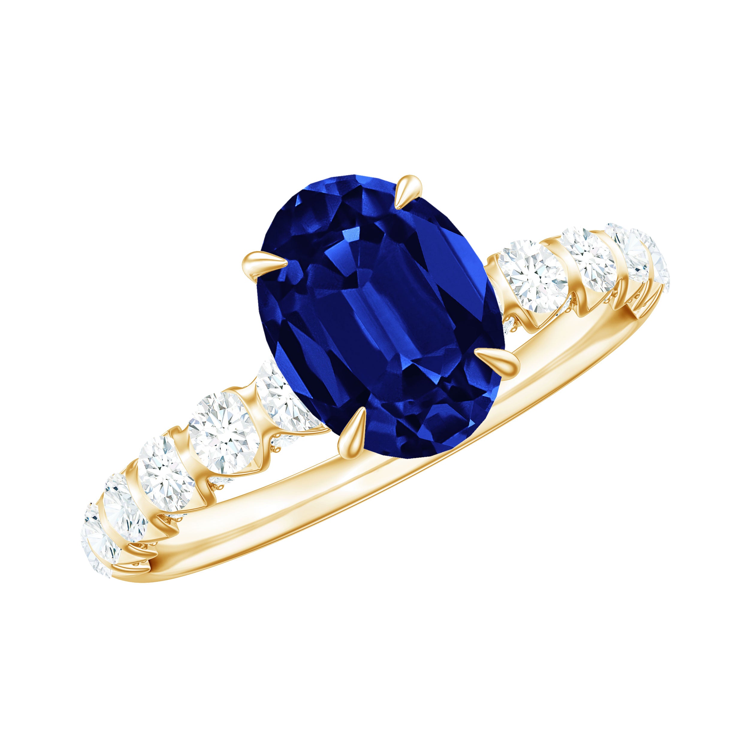2.25 CT Oval Cut Created Blue Sapphire Solitaire and Diamond Side Stones