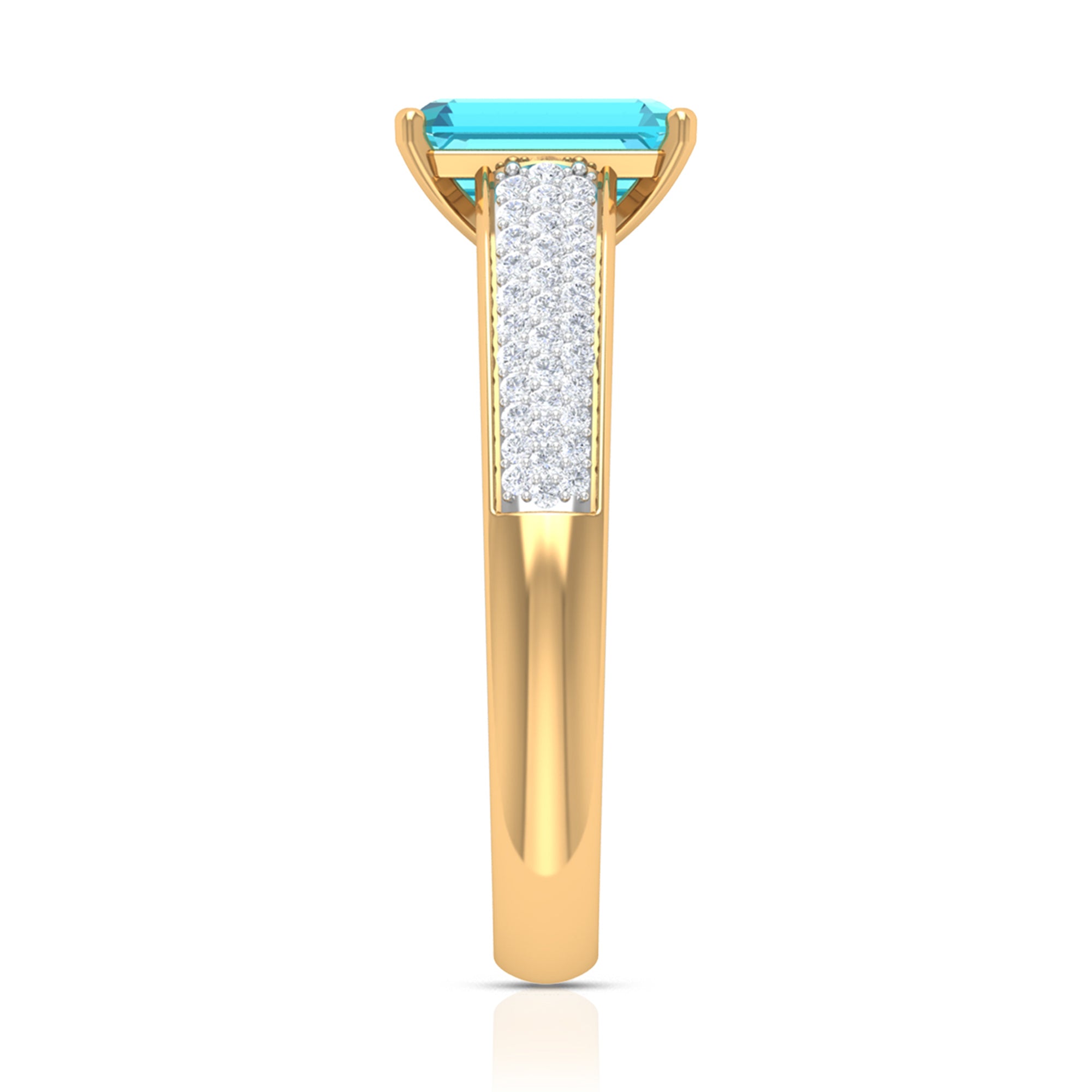 Mark the big day of your life with this classic Solitaire Ring adorned with Emerald Cut Swiss Blue Topaz in Prong Setting and Pave Set Diamond. The ring is crafted with Solid Gold to make for a luxurious choice for the special occasion of your life.