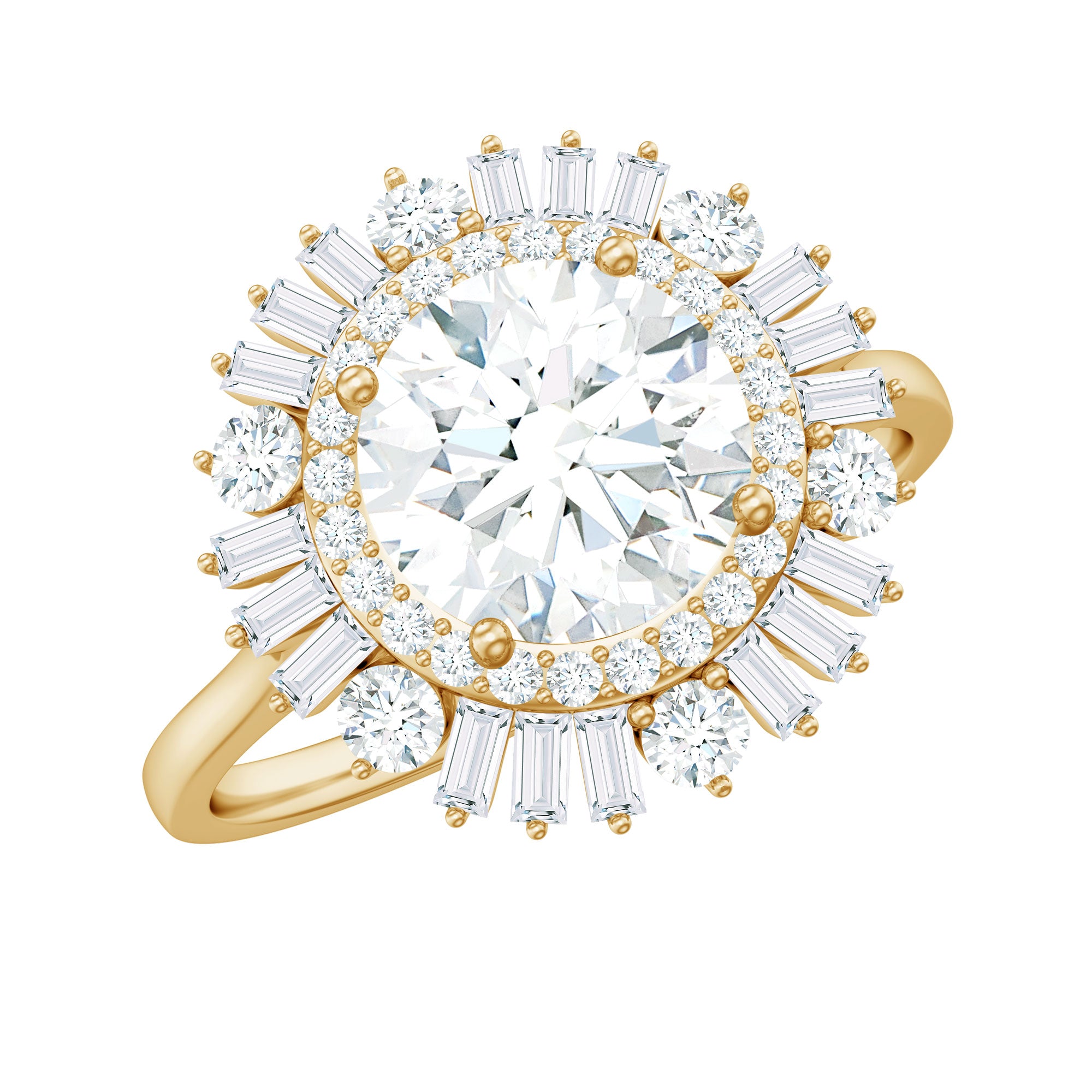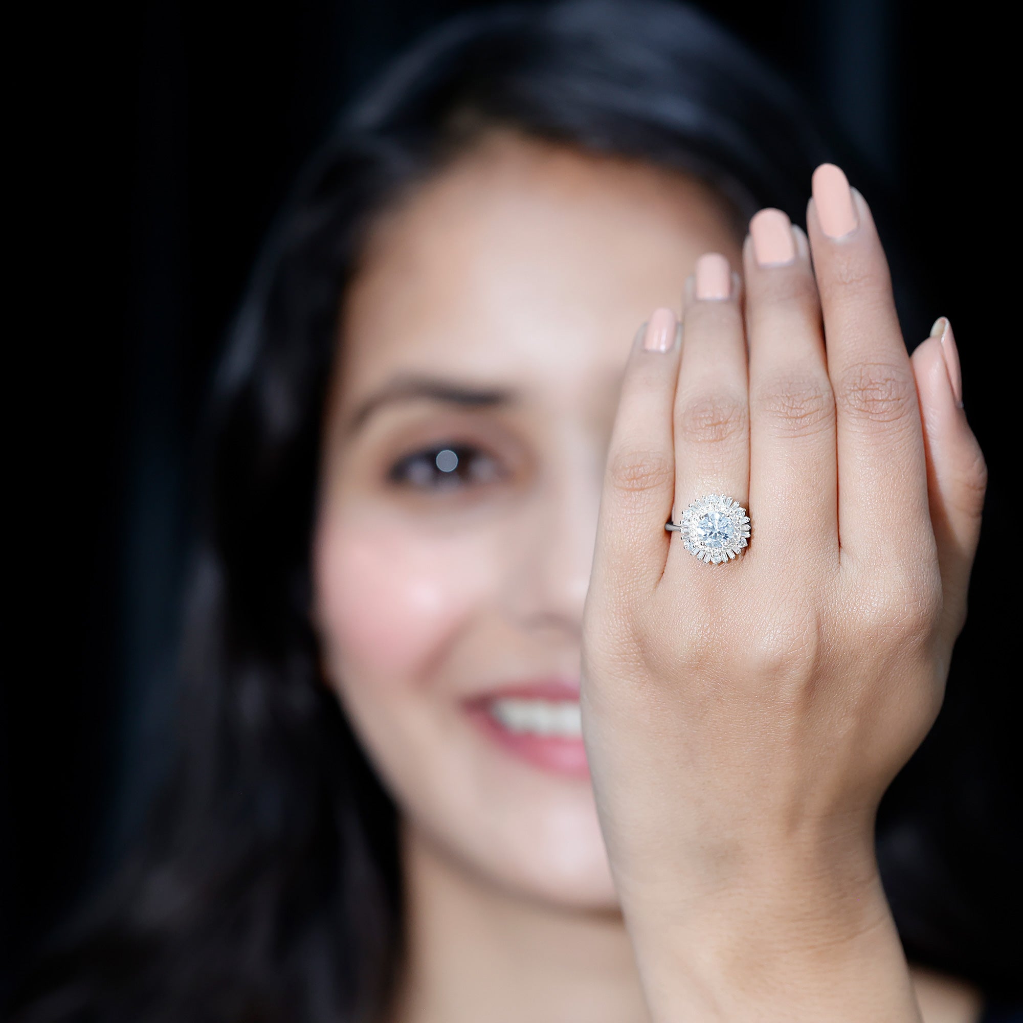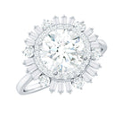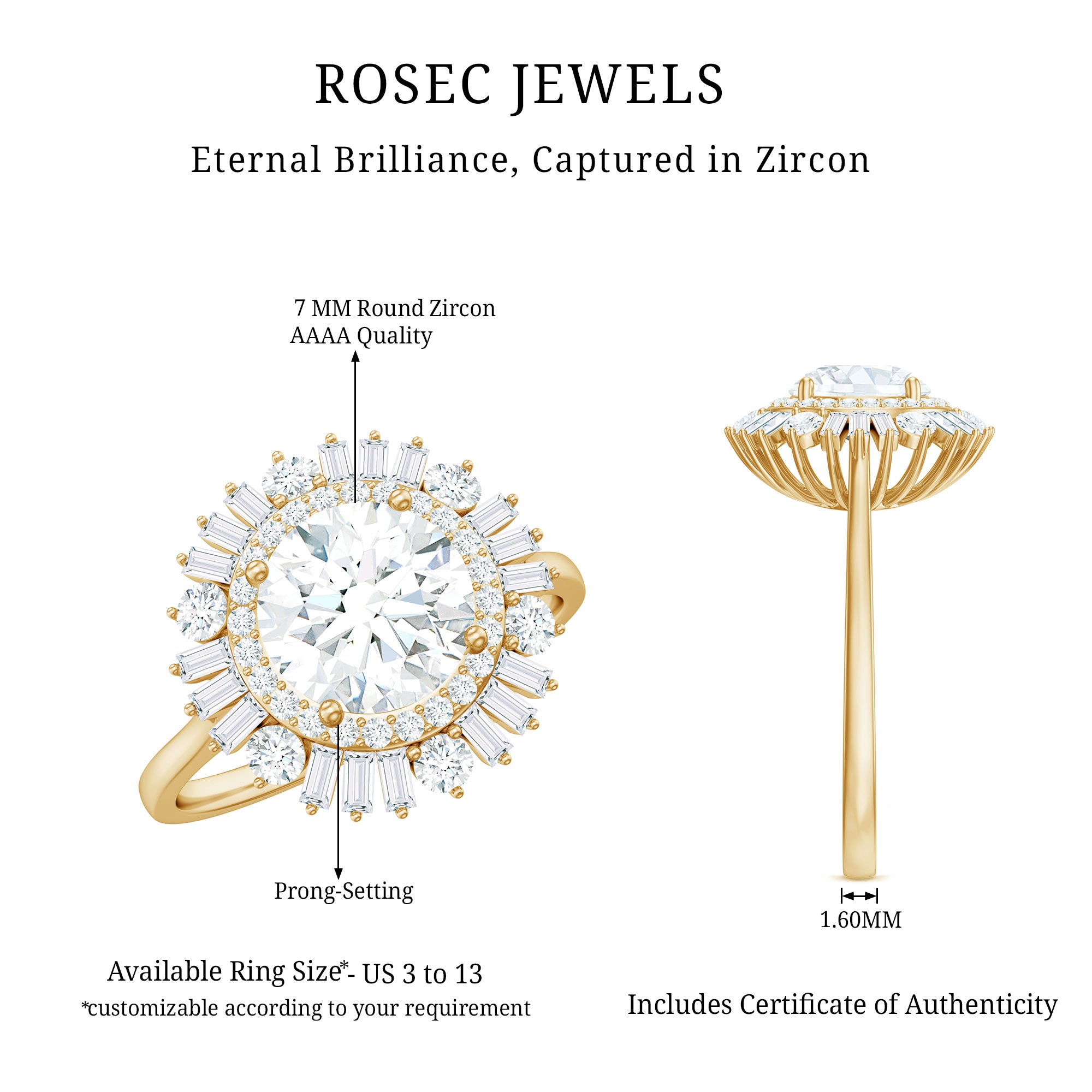 A perfect ring is a more precise way to express emotions to your better half. This beautiful cubic zirconia ring will make her feel on cloud nine, the Zircon Engagement Ring effortlessly draws your attention. This halo engagement ring is embellished with Round and Baguette Cut Zircon with Halo, creating a glistening appeal. This Zircon Ring is an excellent choice for Cocktail Engagement jewelry.