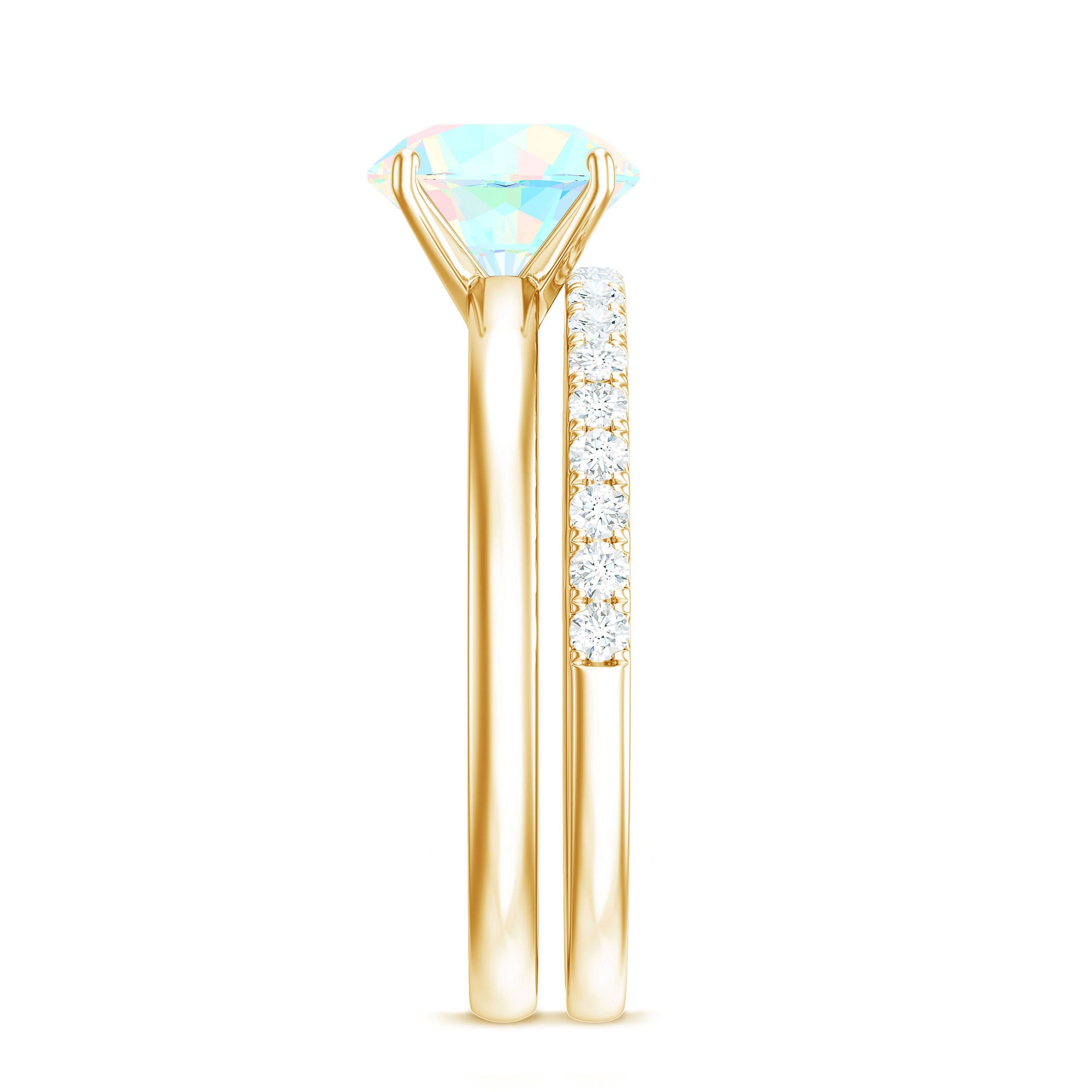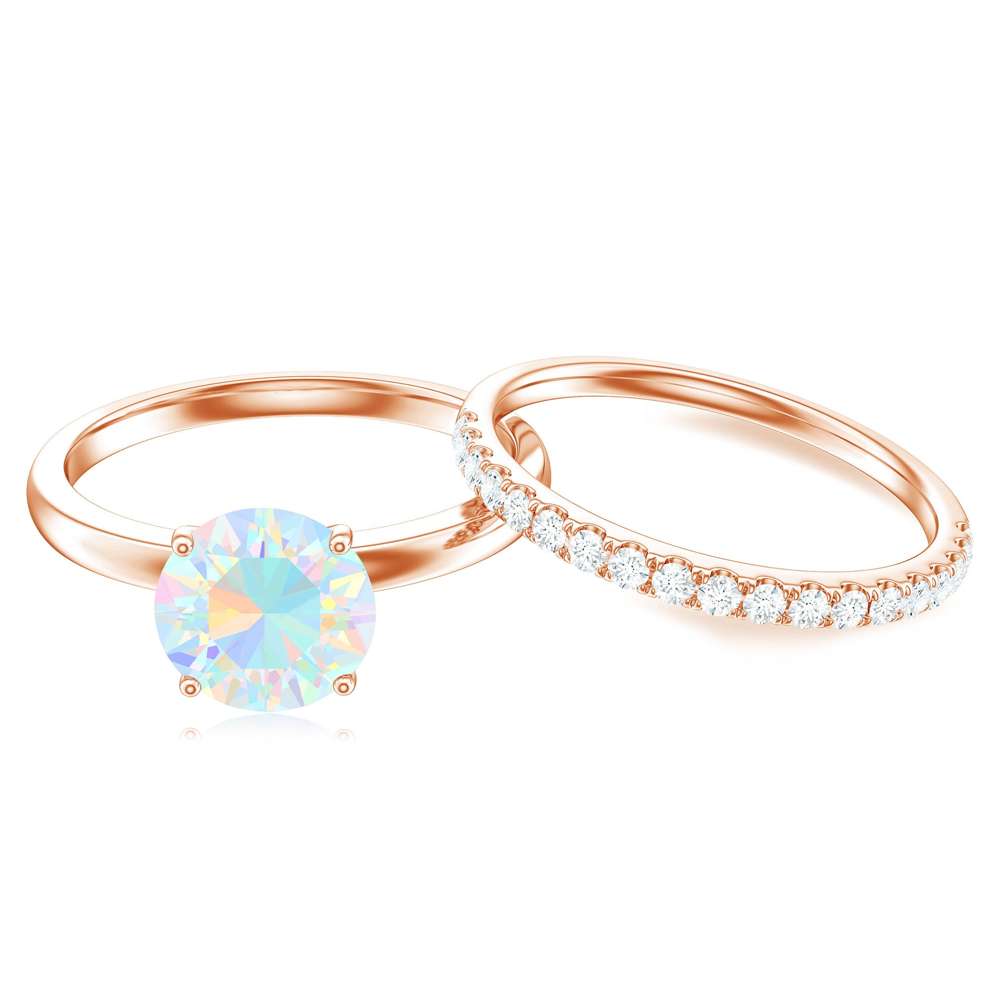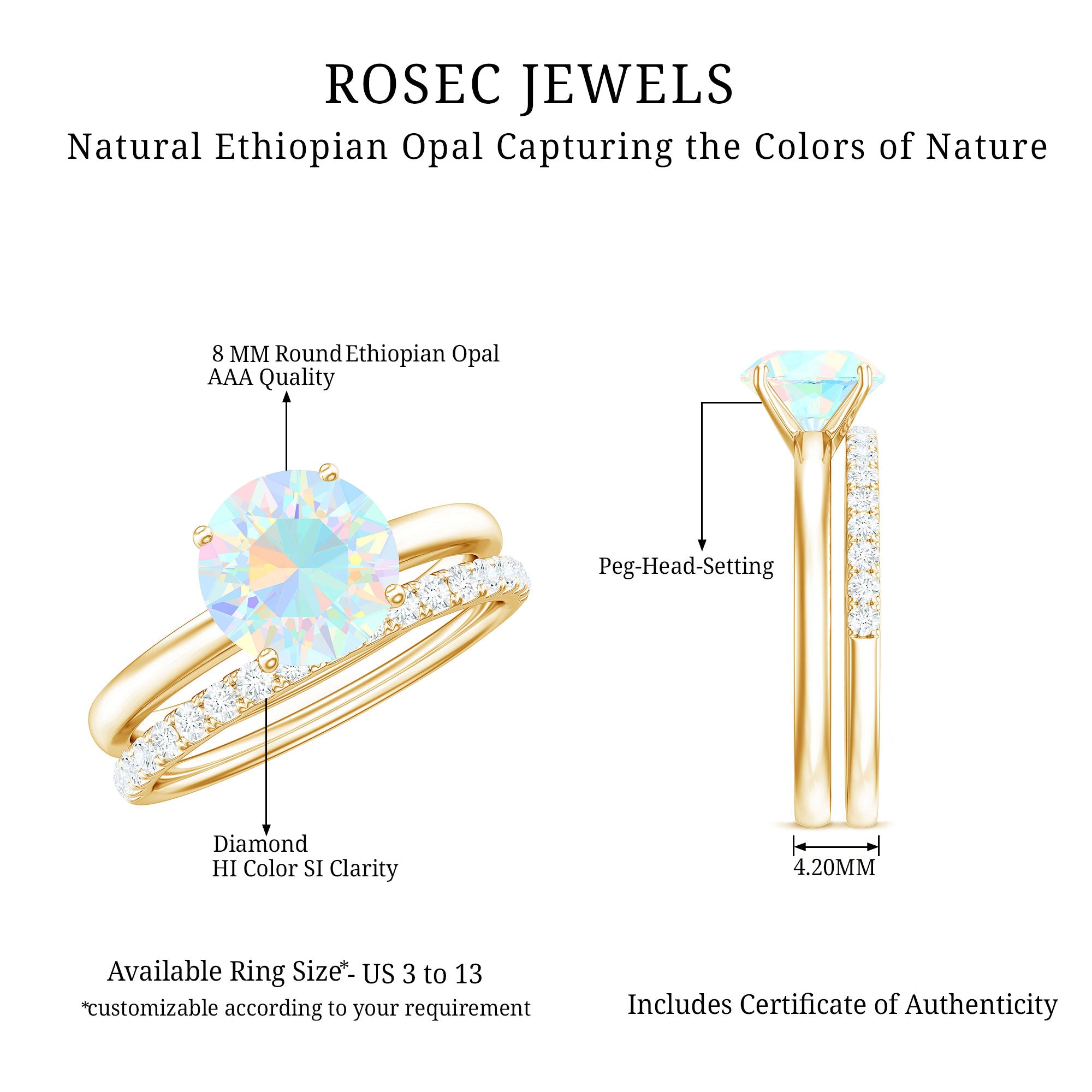 Celebrate your forever with a burst of color and sparkle of this Wedding Bridal Ring Set. This enchanting Solitaire Wedding Ring Set is designed to commemorate love in its most luminous form. The Engagement Ring showcases a glowing 8 mm Round Shape Ethiopian Opal, radiating with rainbow hues that shift in the light, a gemstone known for symbolizing hope, passion and harmony. Paired perfectly with a Diamond Wedding Band, this Opal Engagement Ring Set creates a captivating contrast between the mystical fire of opal and the classic brilliance of diamond stones. Complementing each other, this Opal Engagement Ring with Enhancer reflects the beauty of two souls coming together as one. Whether you are planning the perfect proposal or searching for a meaningful bridal set, this Engagement Ring and Wedding Band Set delivers elegance with a twist of the unexpected. This Opal Wedding Ring Set is a wearable promise of love that shines bright, stands out and lasts forever.
