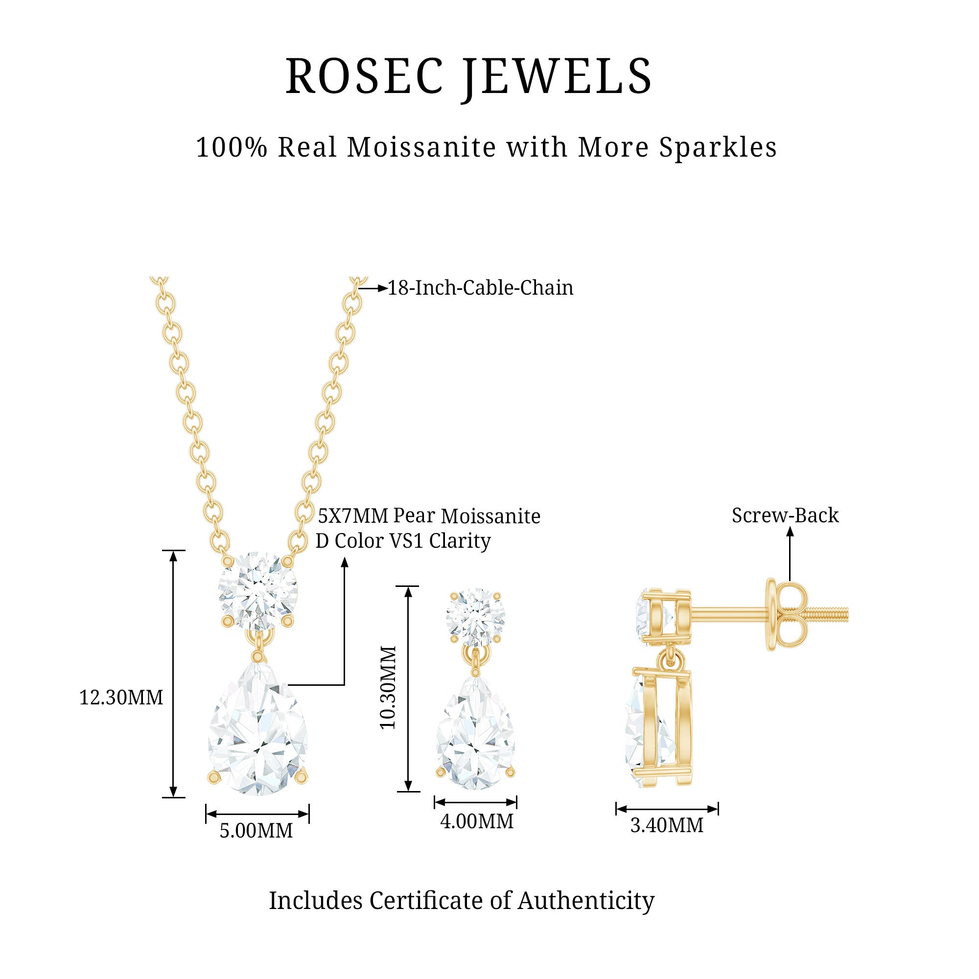 Designed to allure, the teardrop jewelry suite consists of a drop pendant necklace and a matching earring pair. Uniquely crafted with a pear shaped moissanite and topped by a round moissanite, the necklace earring set is utterly beautiful. Prong set one below the other, the moissanite exudes an exceptional brilliance, that make the two-stone jewelry set a glistening addition to your jewelry kit. The necklace comes with a connected chain, while the earring pair is complete with screw back posts.