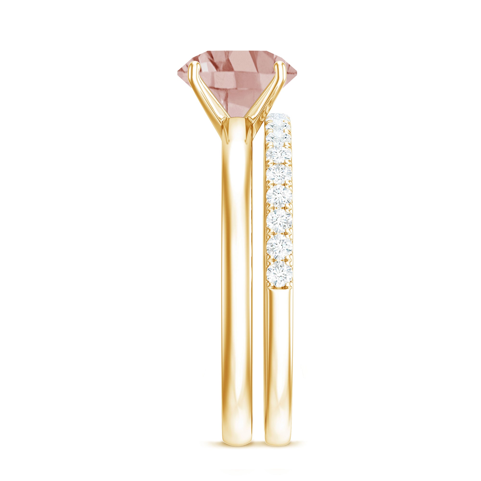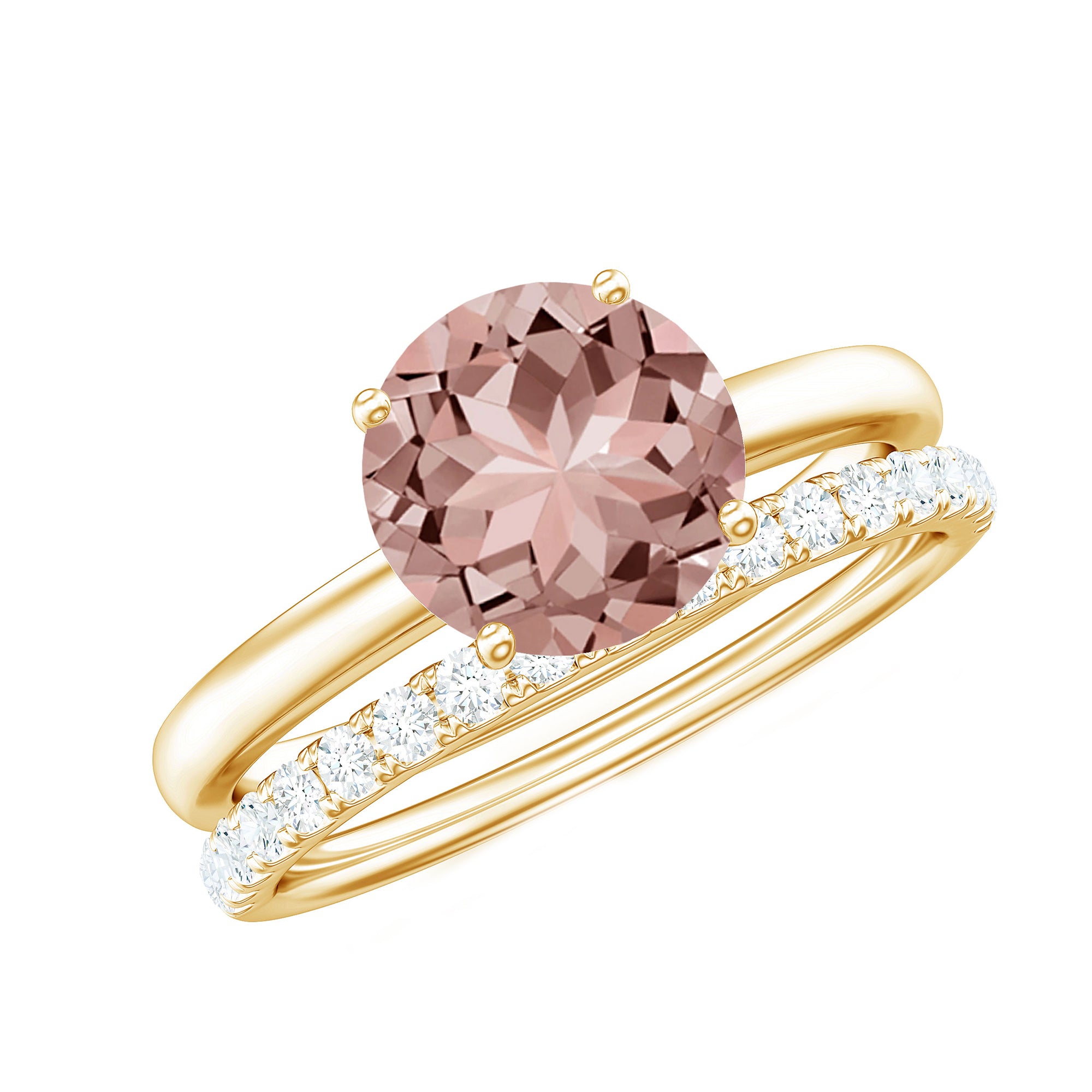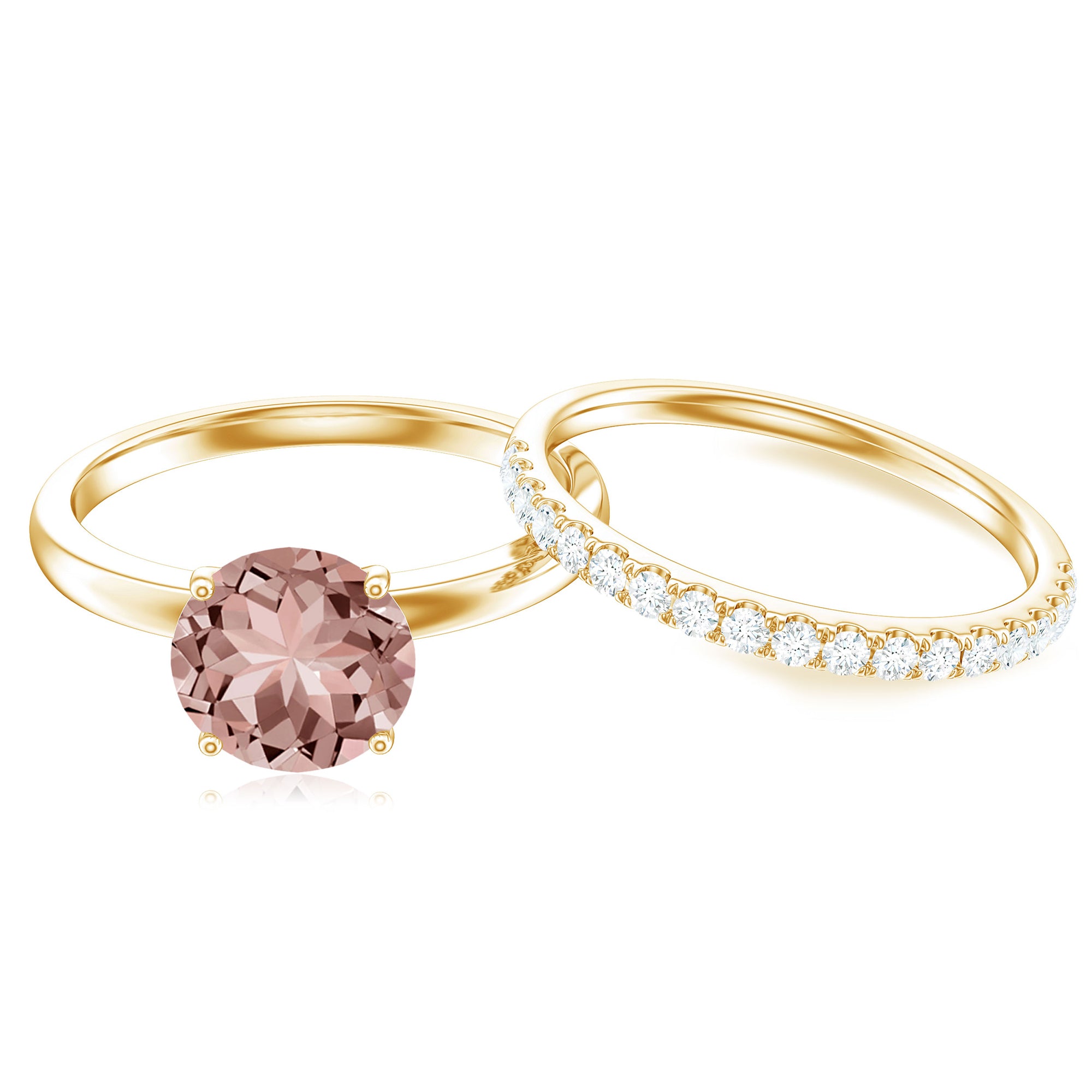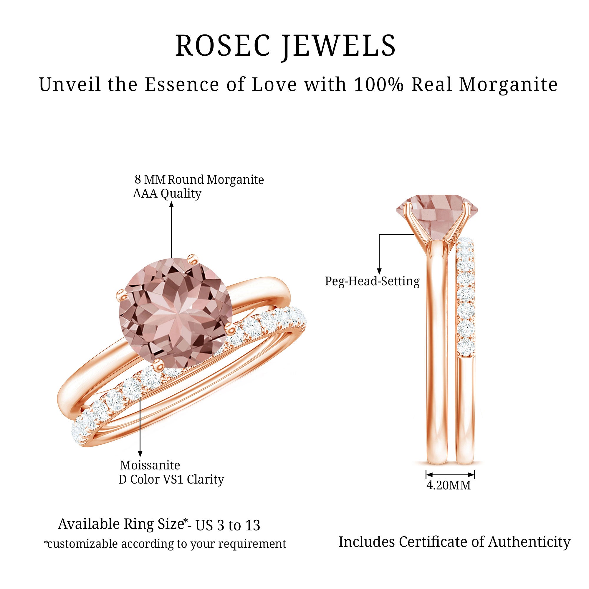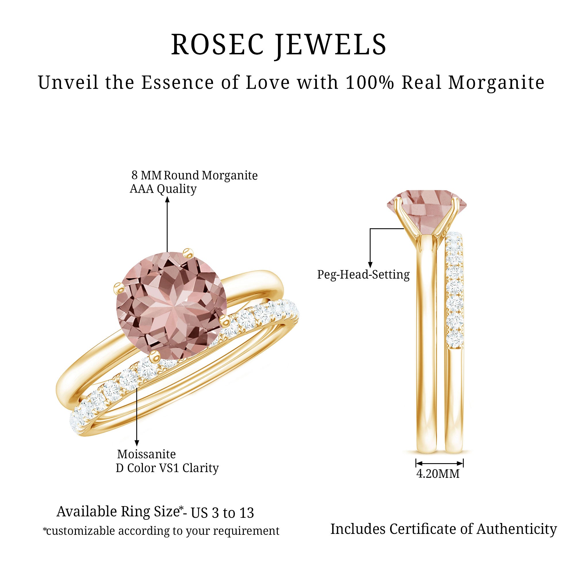 Commemorate your special day with this exquisite Wedding Ring Set, crafted from solid gold. This beautiful bridal set features a round cut Morganite solitaire and round cut Moissanite accents, making it a stunning choice for your big day.