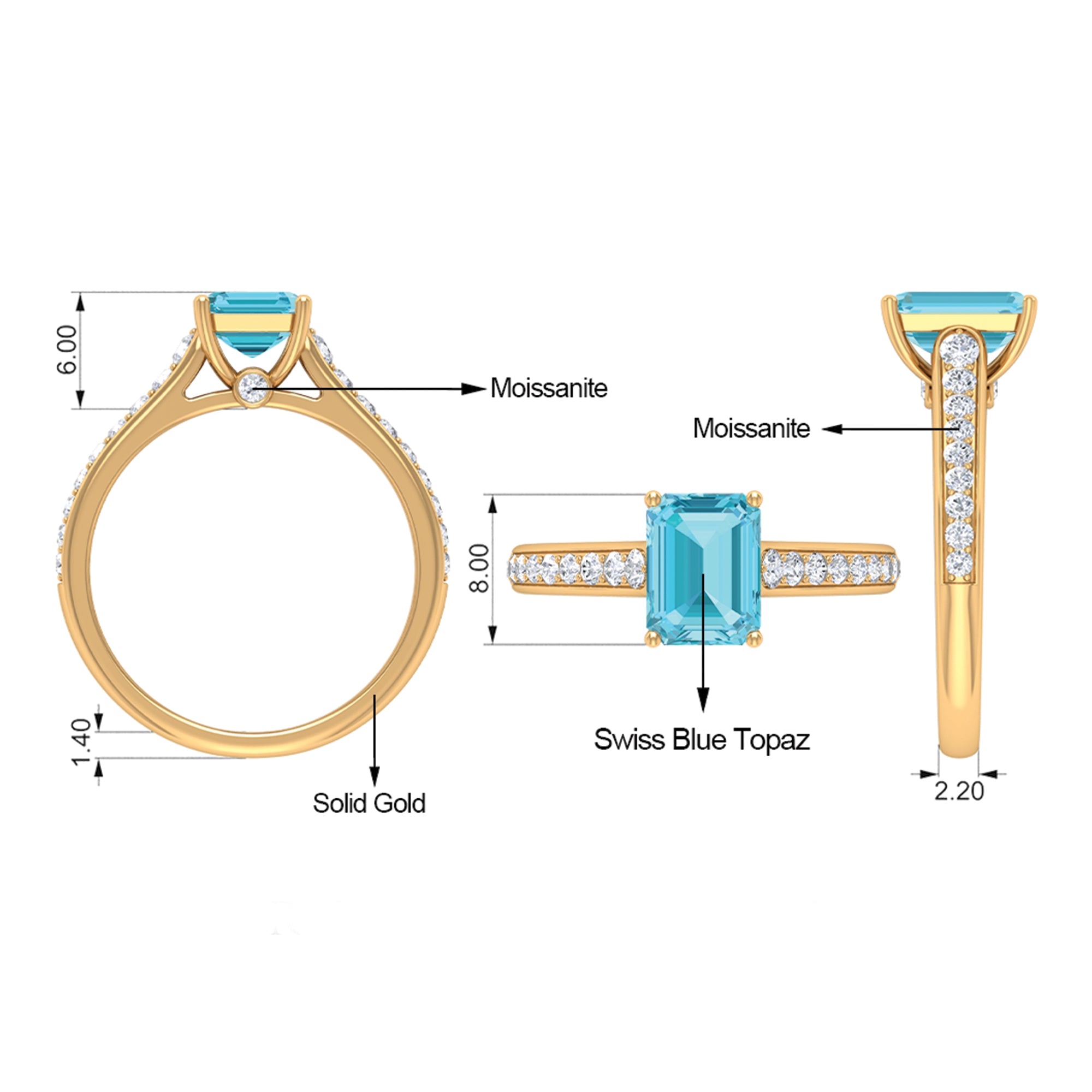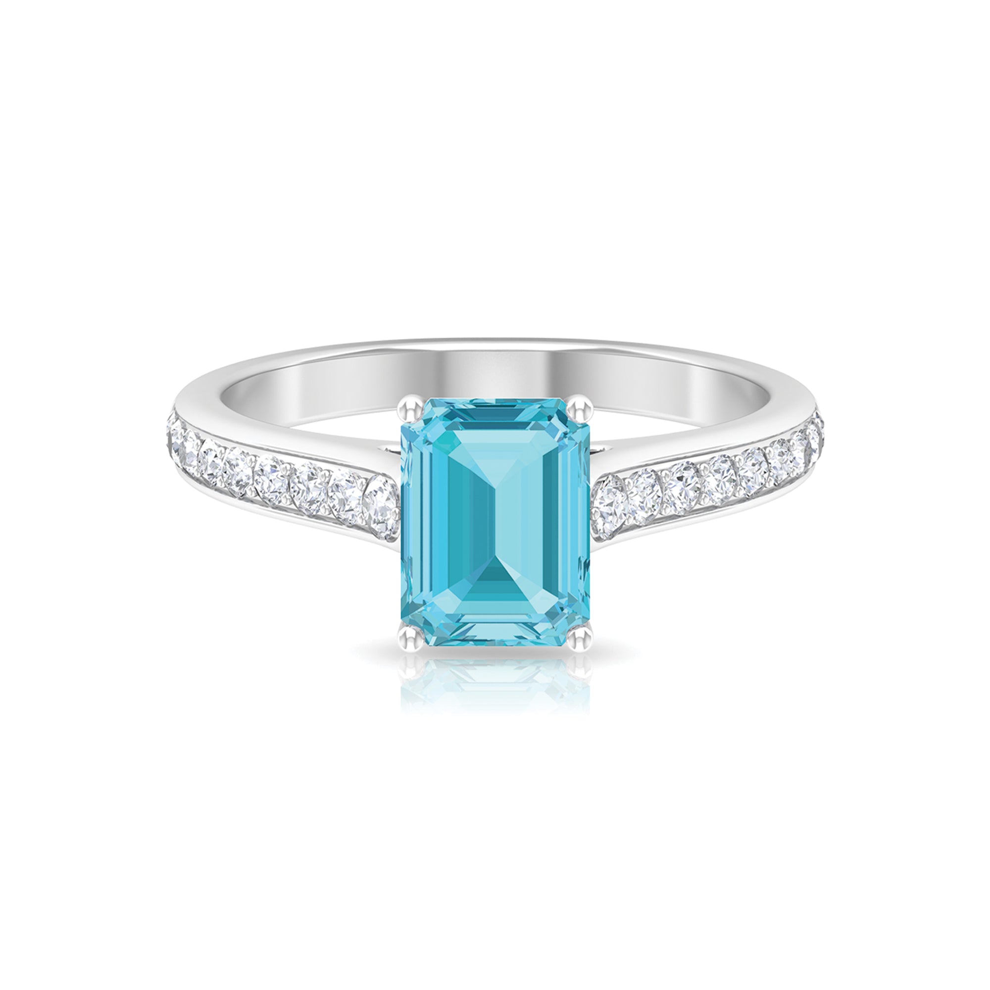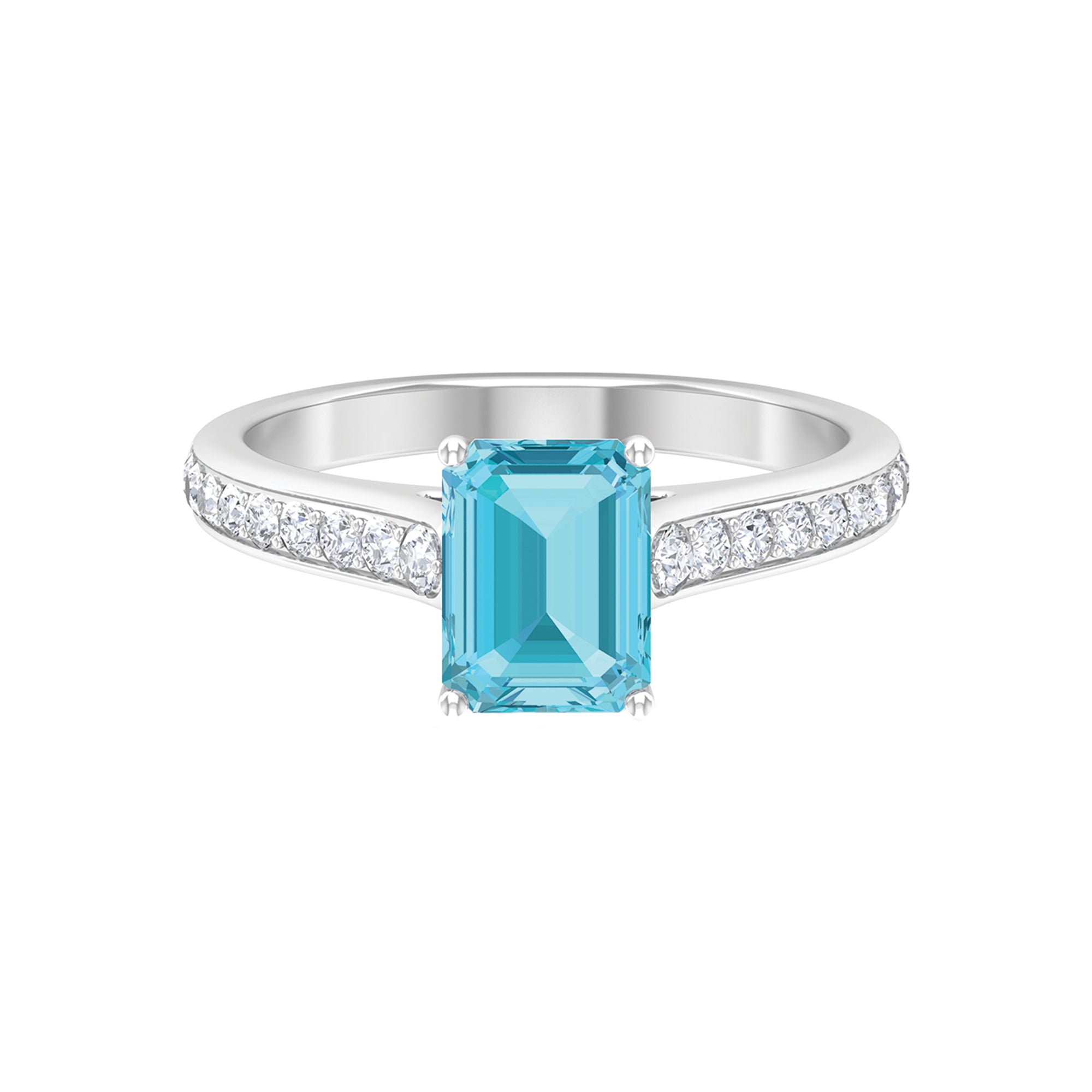 2.50 CT Emerald Cut Swiss Blue Topaz Solitaire with Diamond Side Stone Ring