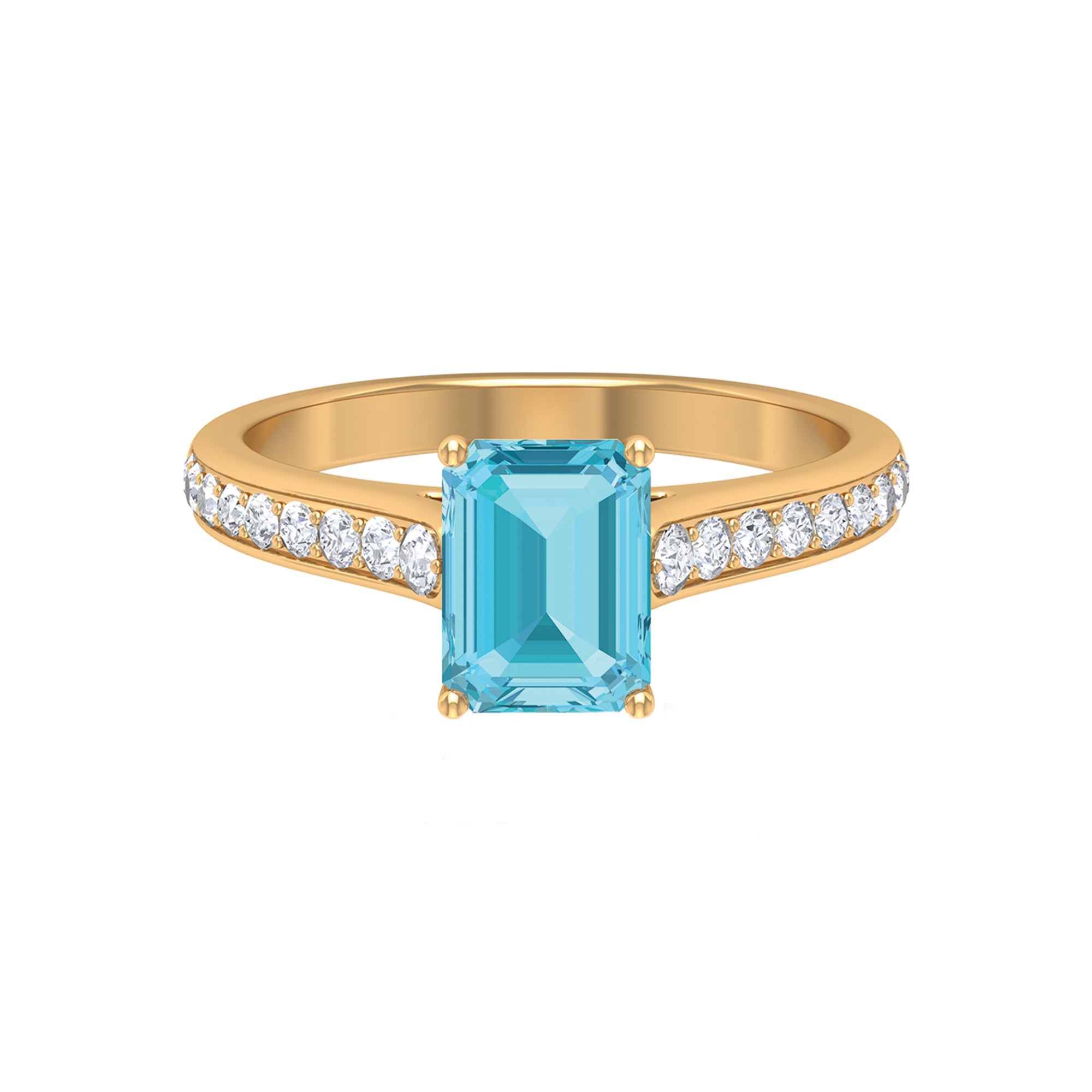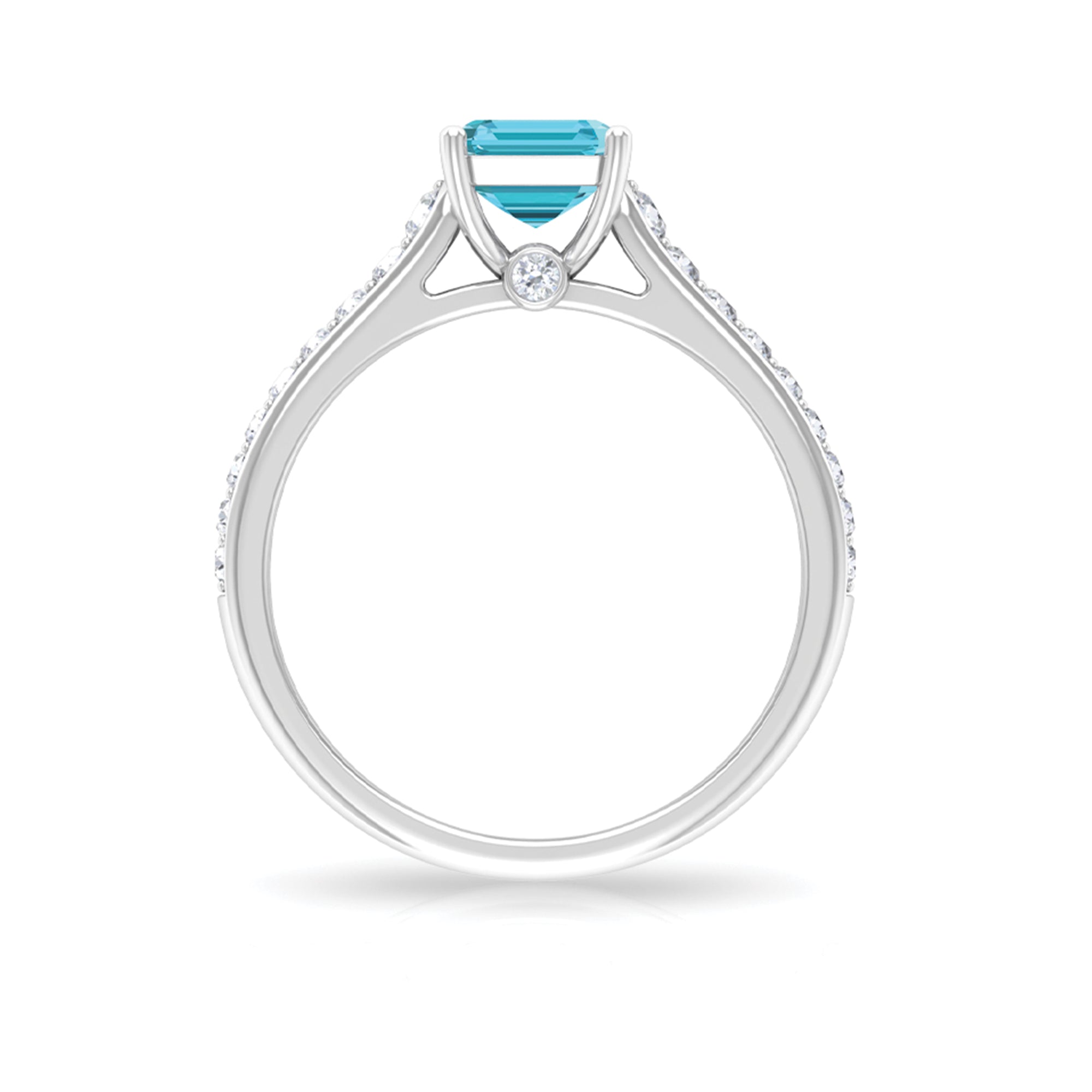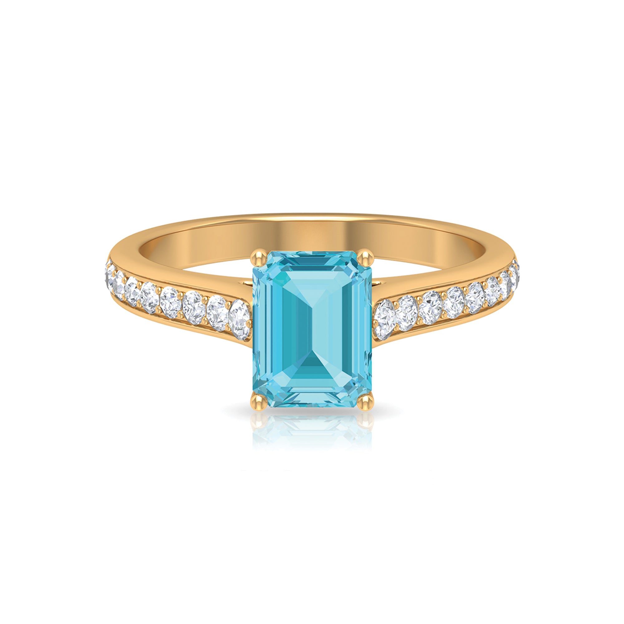 2.50 CT Emerald Cut Swiss Blue Topaz Solitaire with Diamond Side Stone Ring