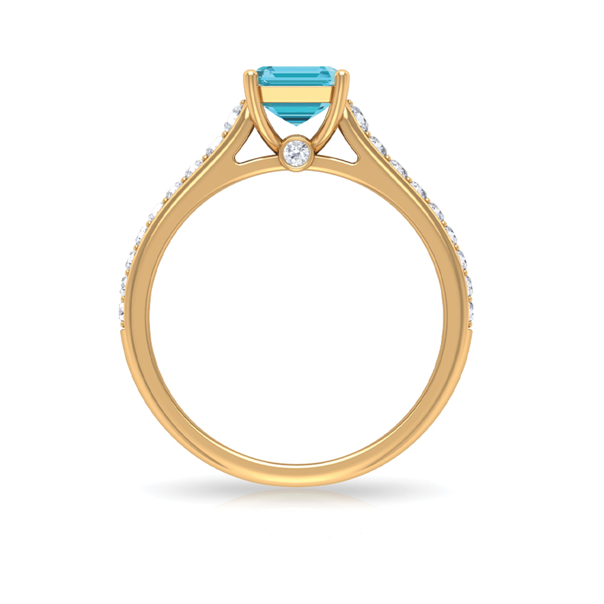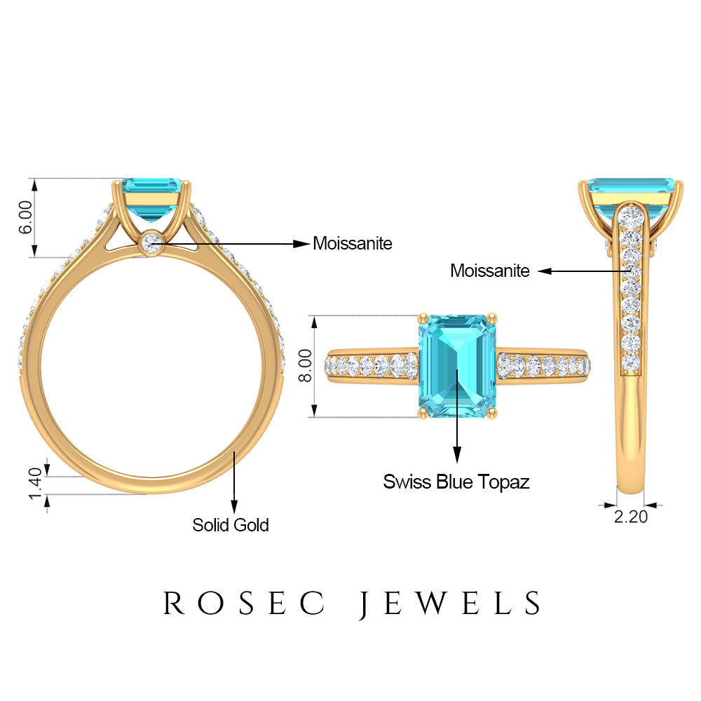 Make your important day a memorable one with this Emerald Cut solitaire ring. This engagement ring is adorned with Swiss blue topaz center stone and Diamond side stones add a flair of charm to its appearance.
