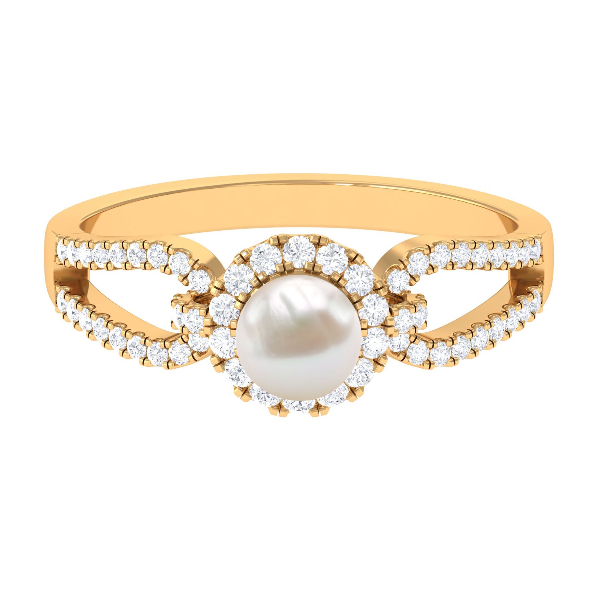 With a contemporary split shank design this ring has a unique solitaire white pearl with shining metal and a sculptural look. Amazingly crafted in Gold with a round shape Freshwater Pearl surrounded by a classic Diamond halo and side stone. Stunningly adorn yourself with this timeless Freshwater Pearl jewelry.