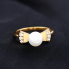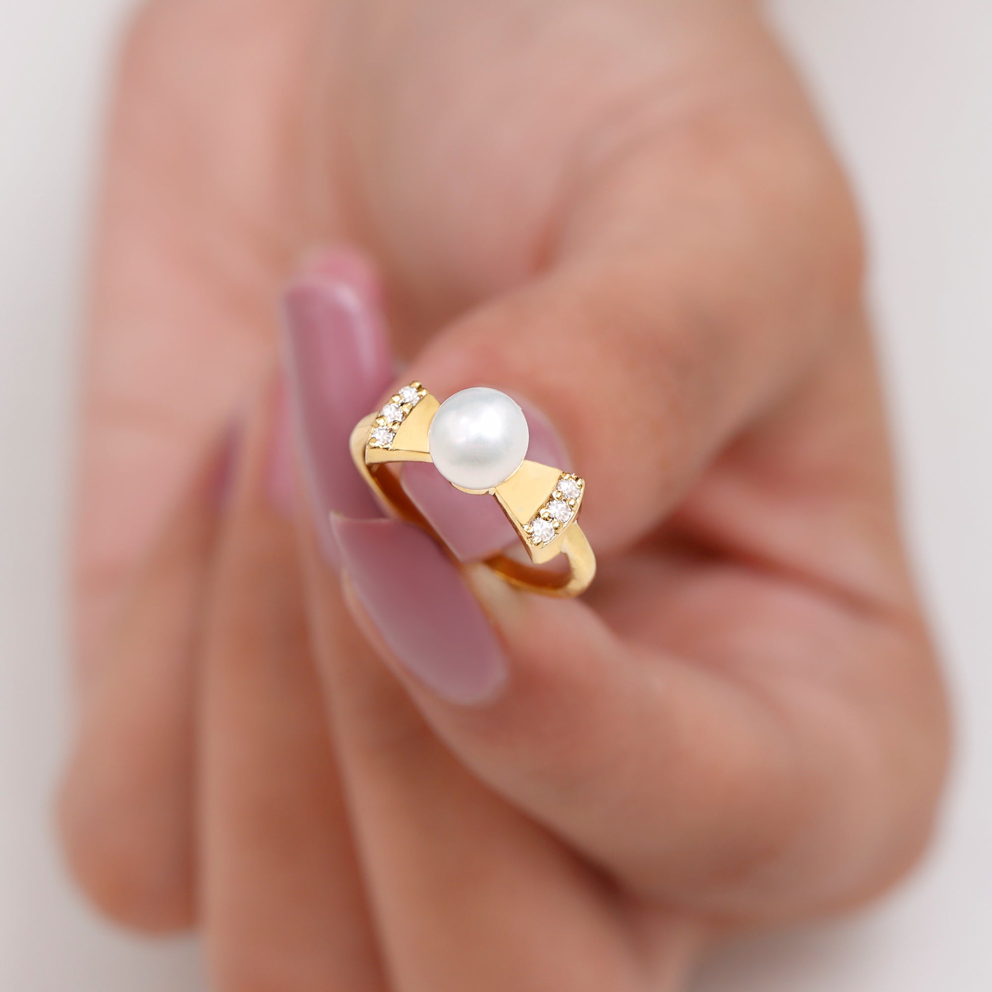 This Solitaire Ring is a stunning and feminine piece of jewelry that is perfect for any occasion. The ring features Round Shape Freshwater Pearl in Bead Set with sparkling Diamond gemstones studded over a delicate and intricate bow design. The contrast between the white pearl and the Diamond creates a stunning and timeless look that is sure to impress. The rings understated yet eye-catching design makes it a perfect gift for a loved one or a special treat for yourself.