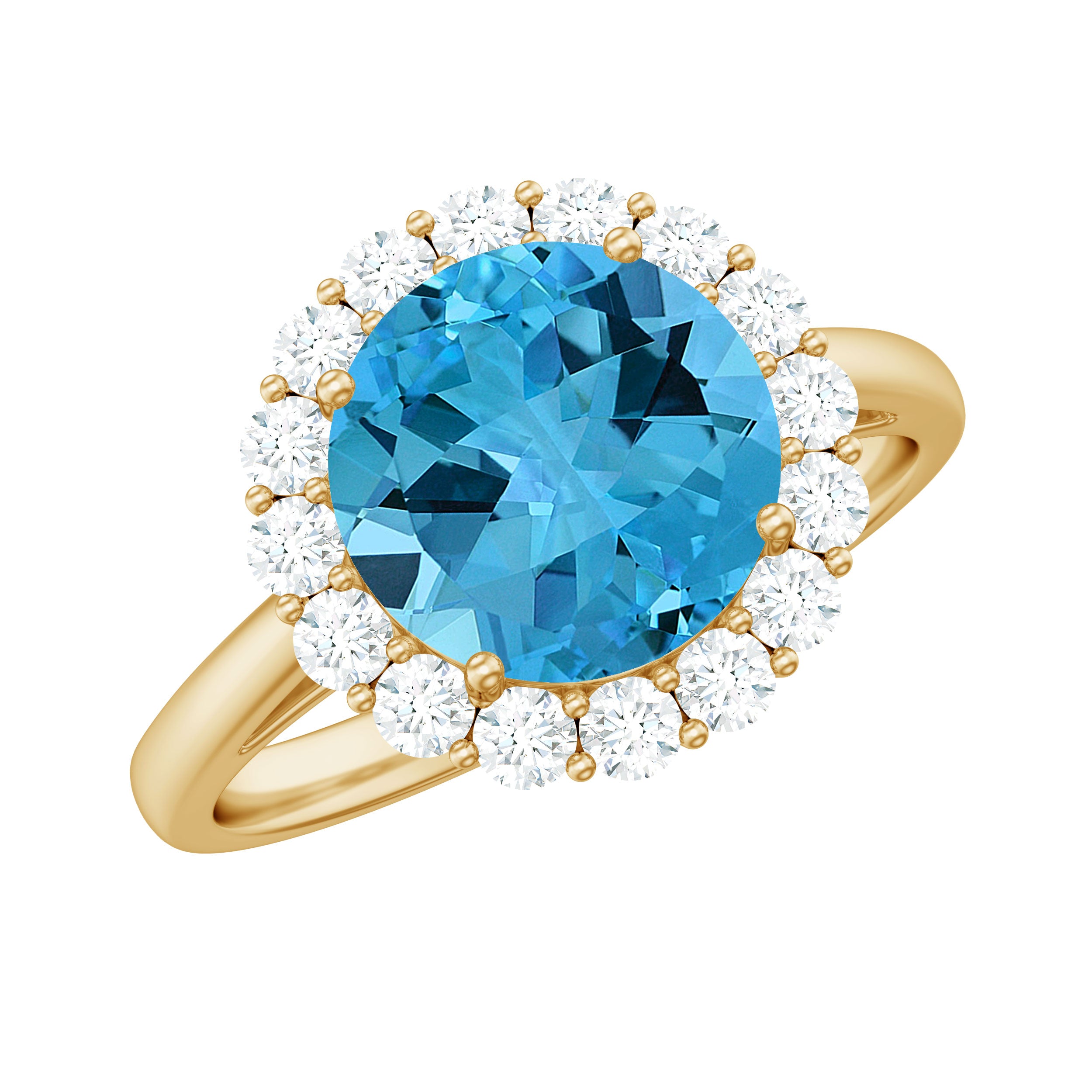 It is a Gold Halo Ring featuring a Round Cut Swiss Blue Topaz as Solitaire embellished in Prong Setting with Round Cut Moissanite embellished in Pave Setting for Women.