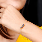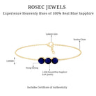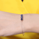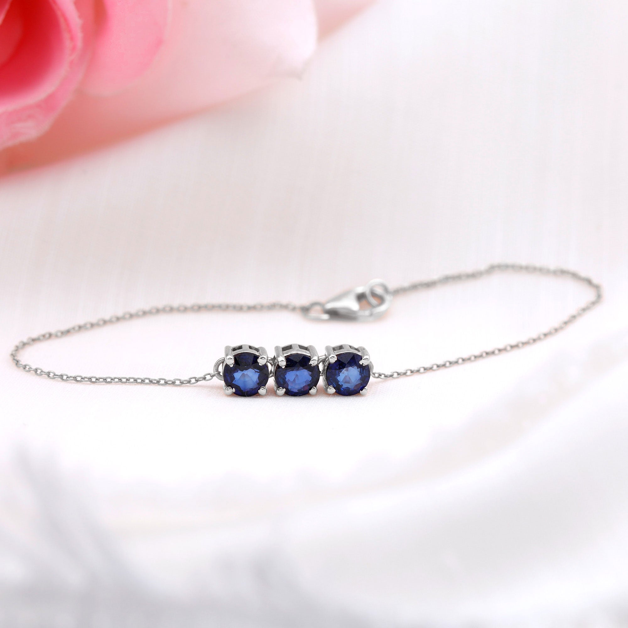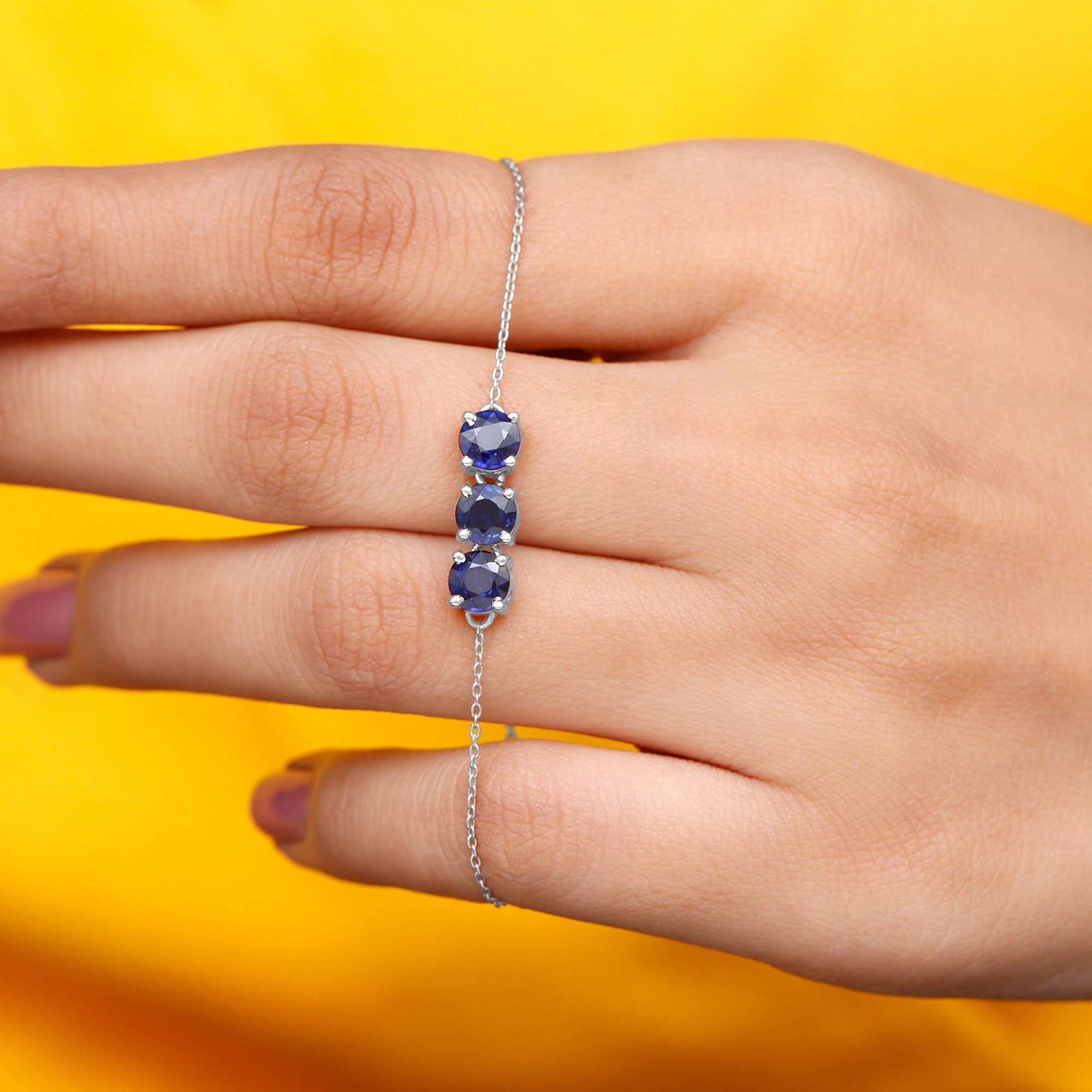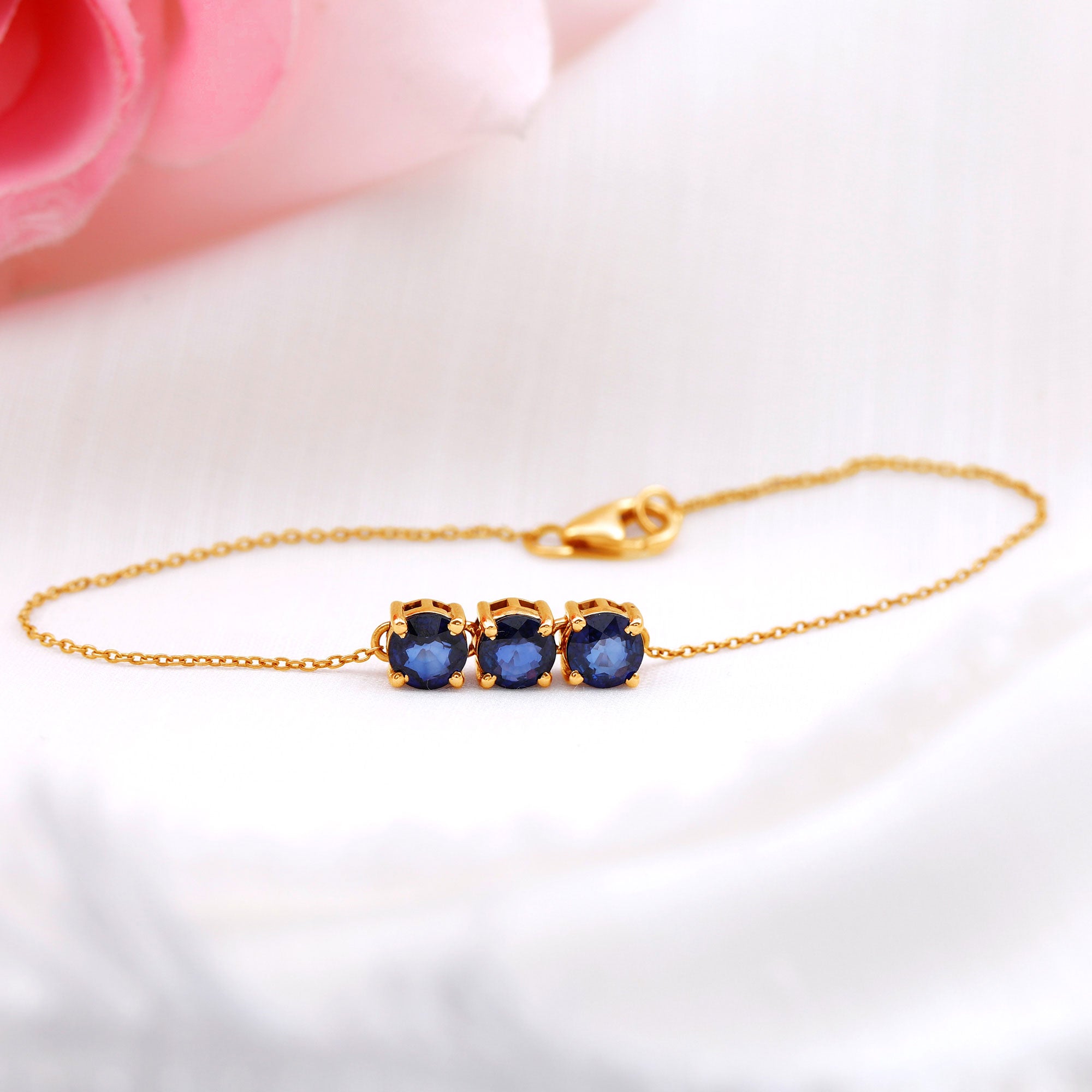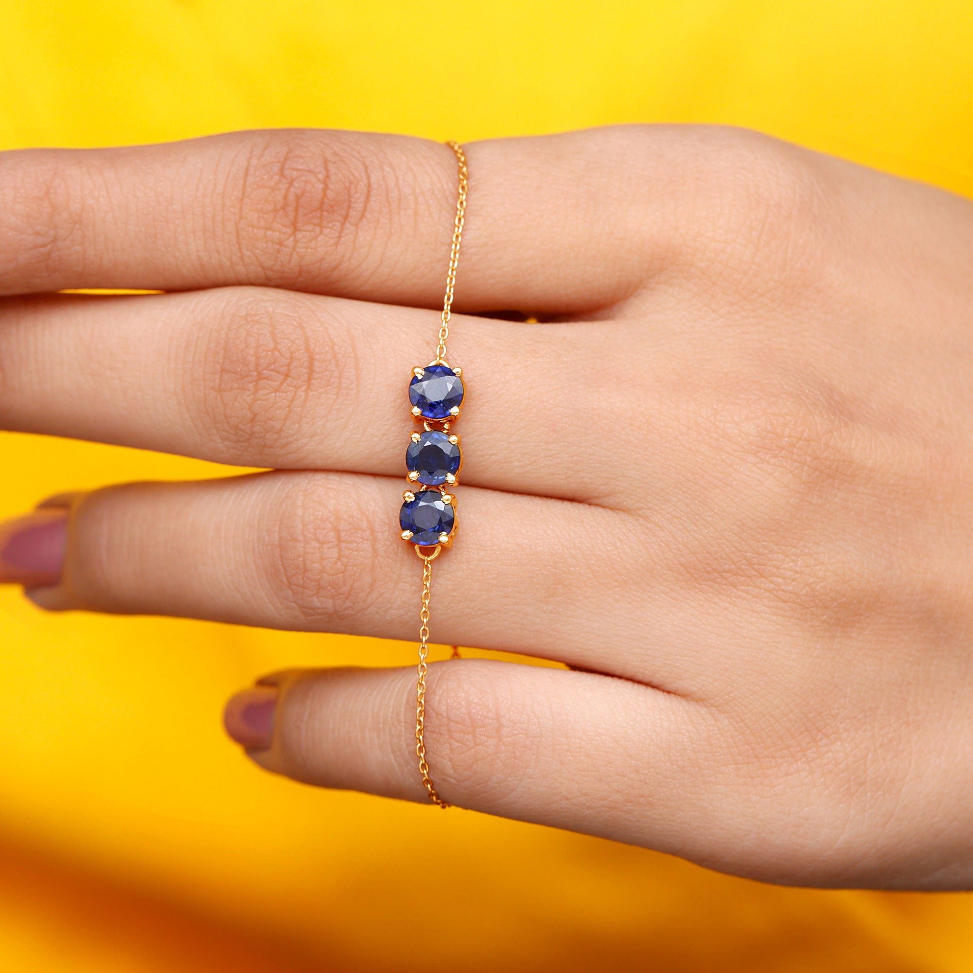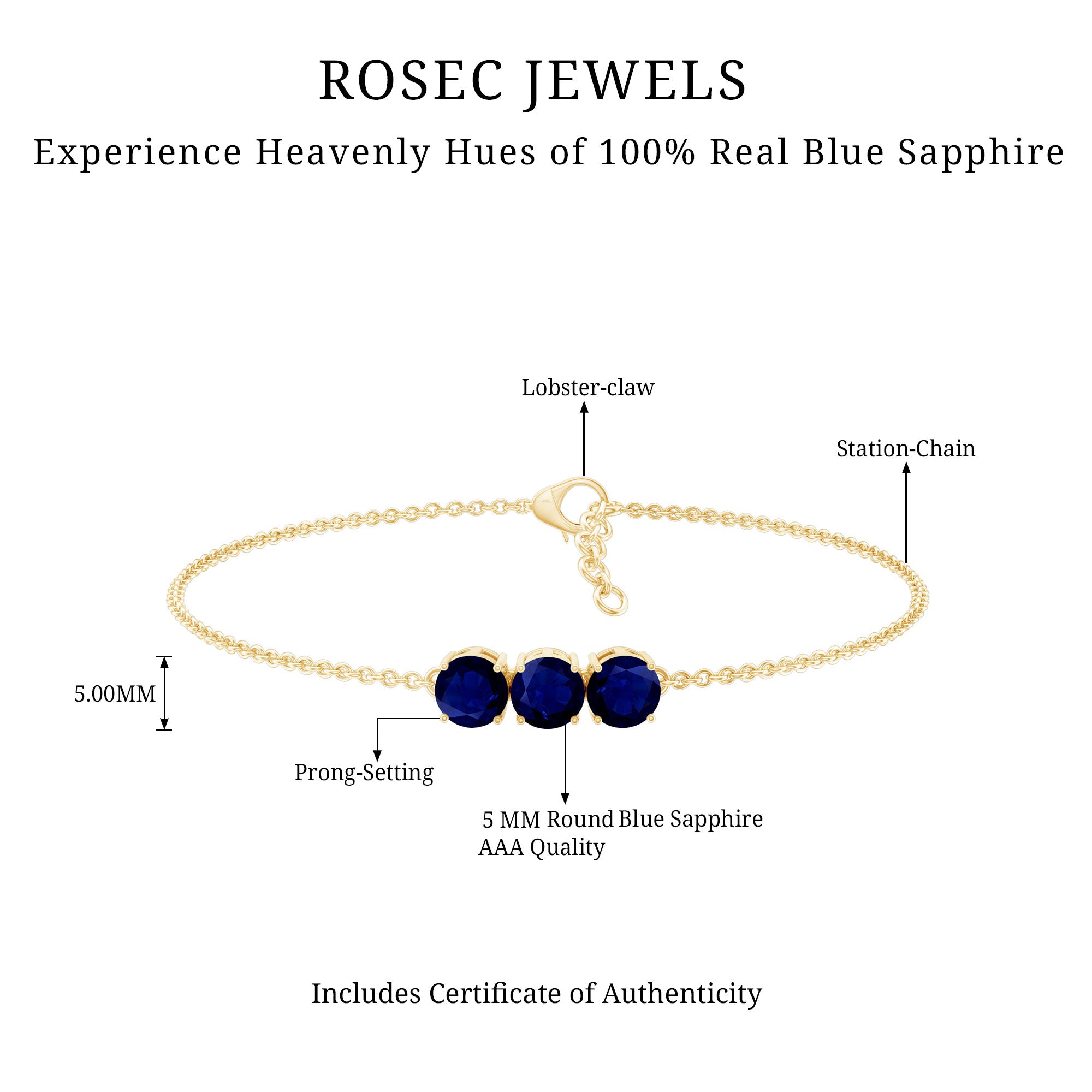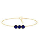 Surprise your beloved on the special occasion with this Three Stone Chain Bracelet adorned with Round Cut Blue Sapphire in Prong Setting and crafted with Solid Gold.