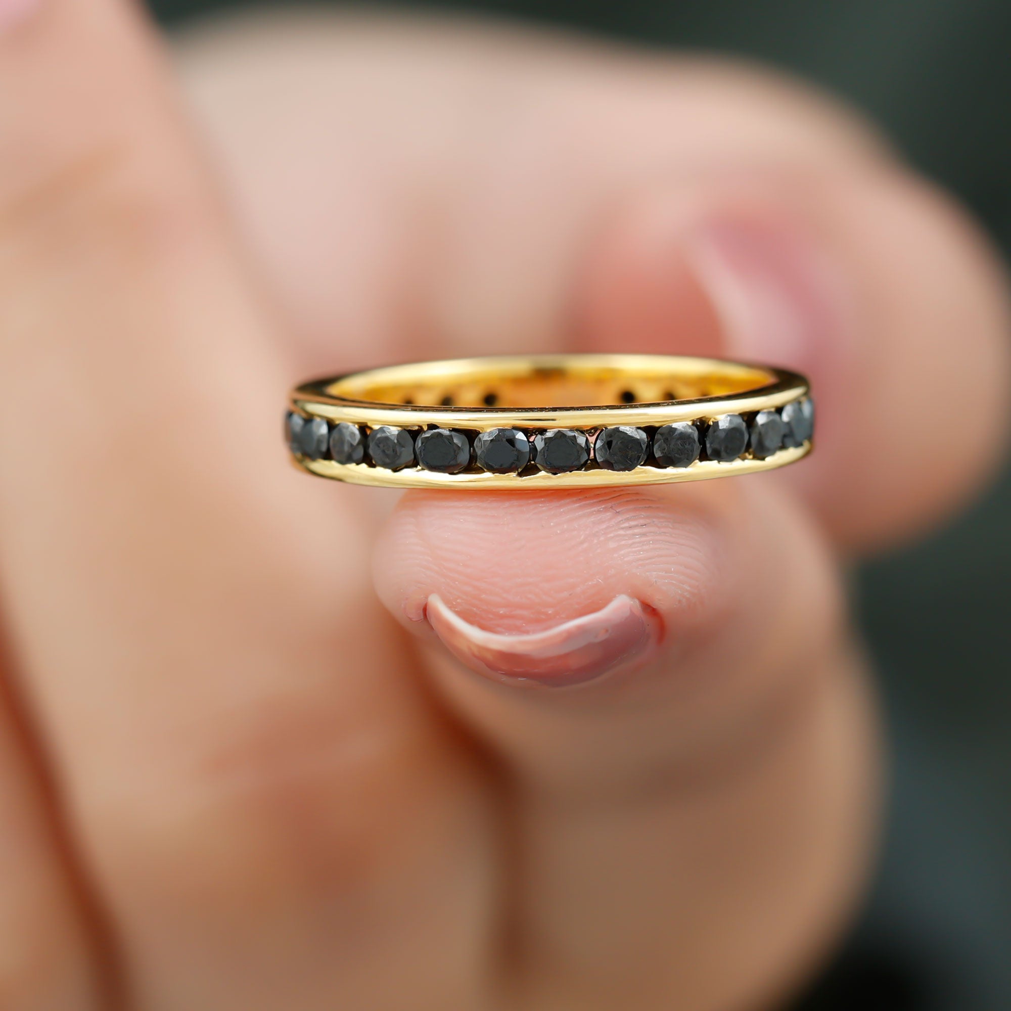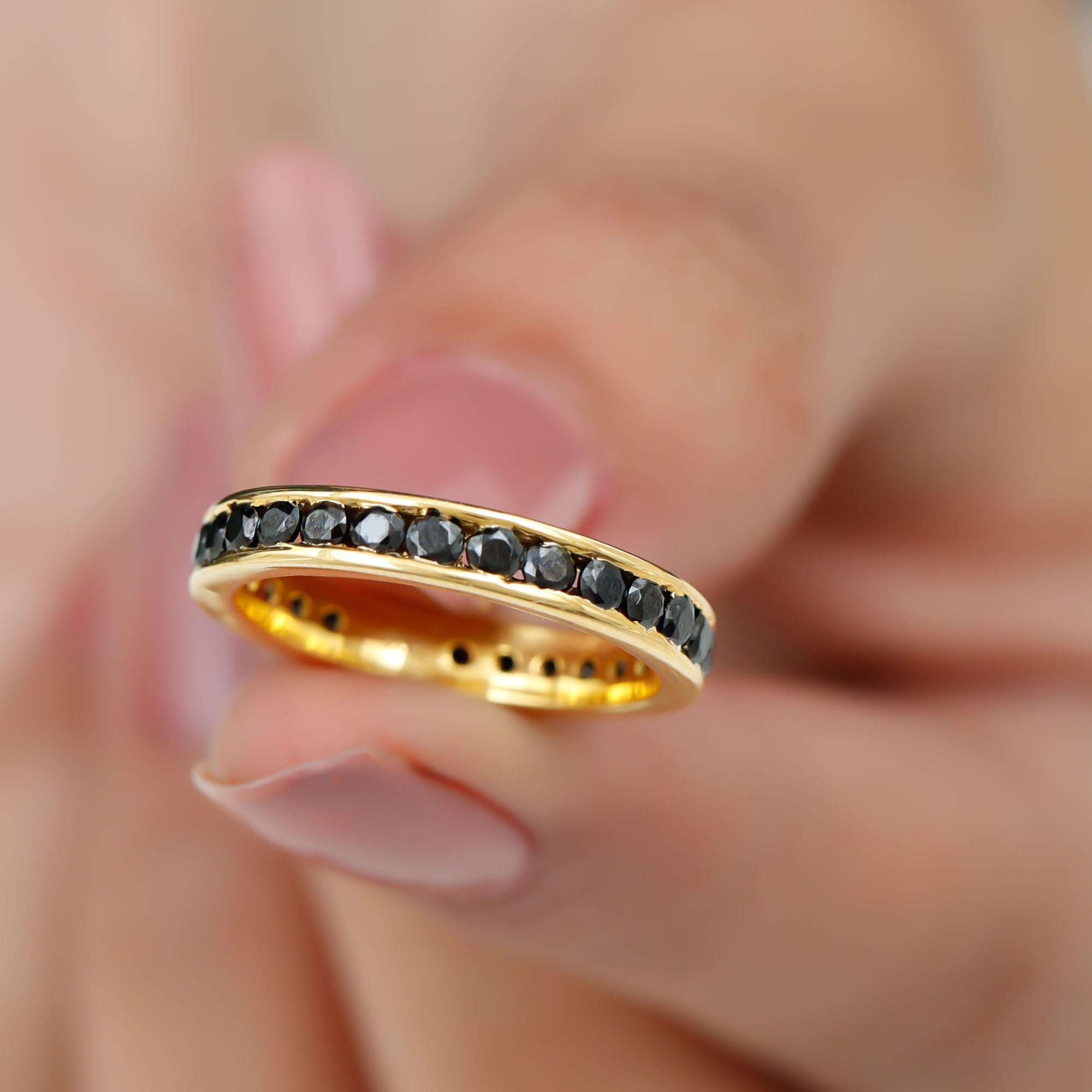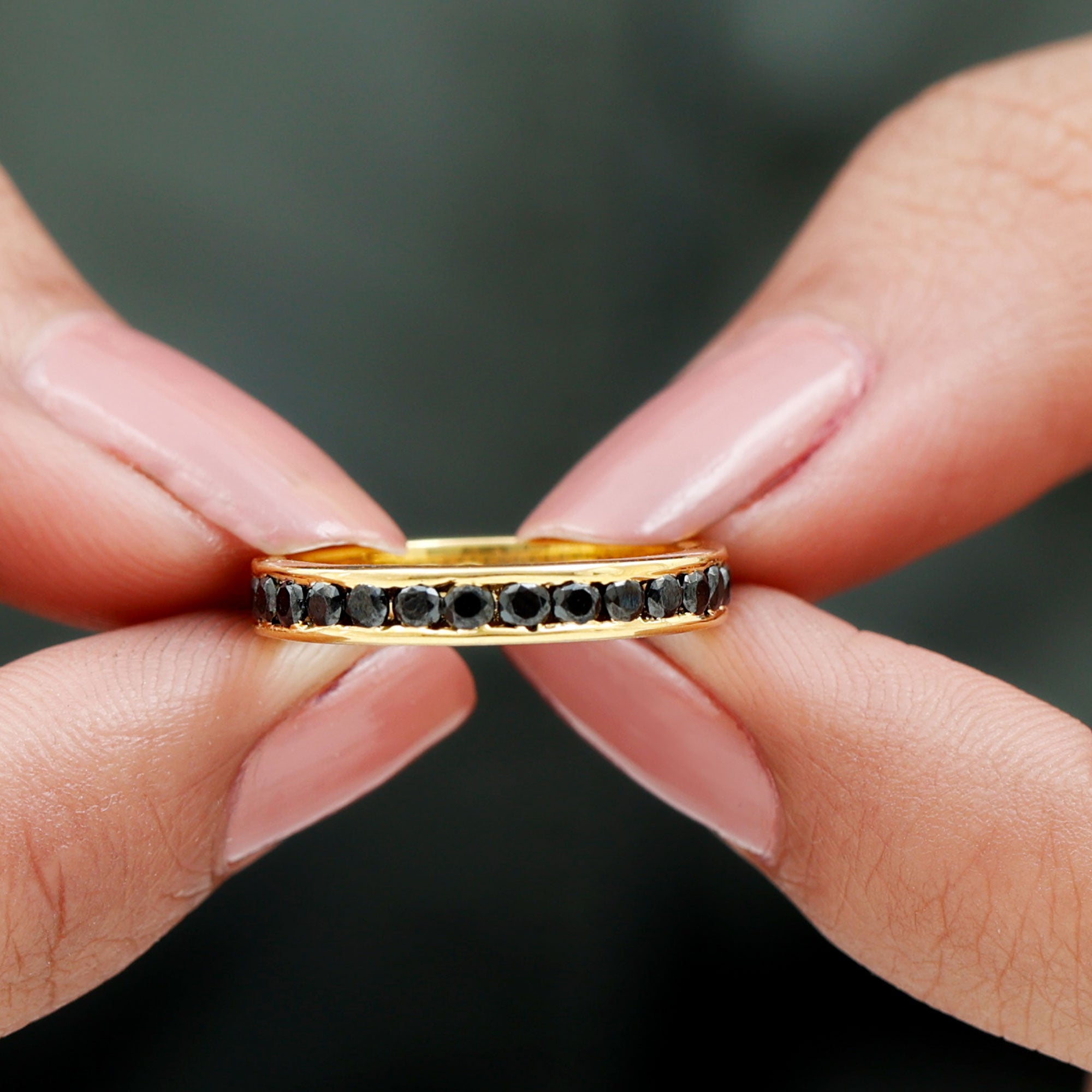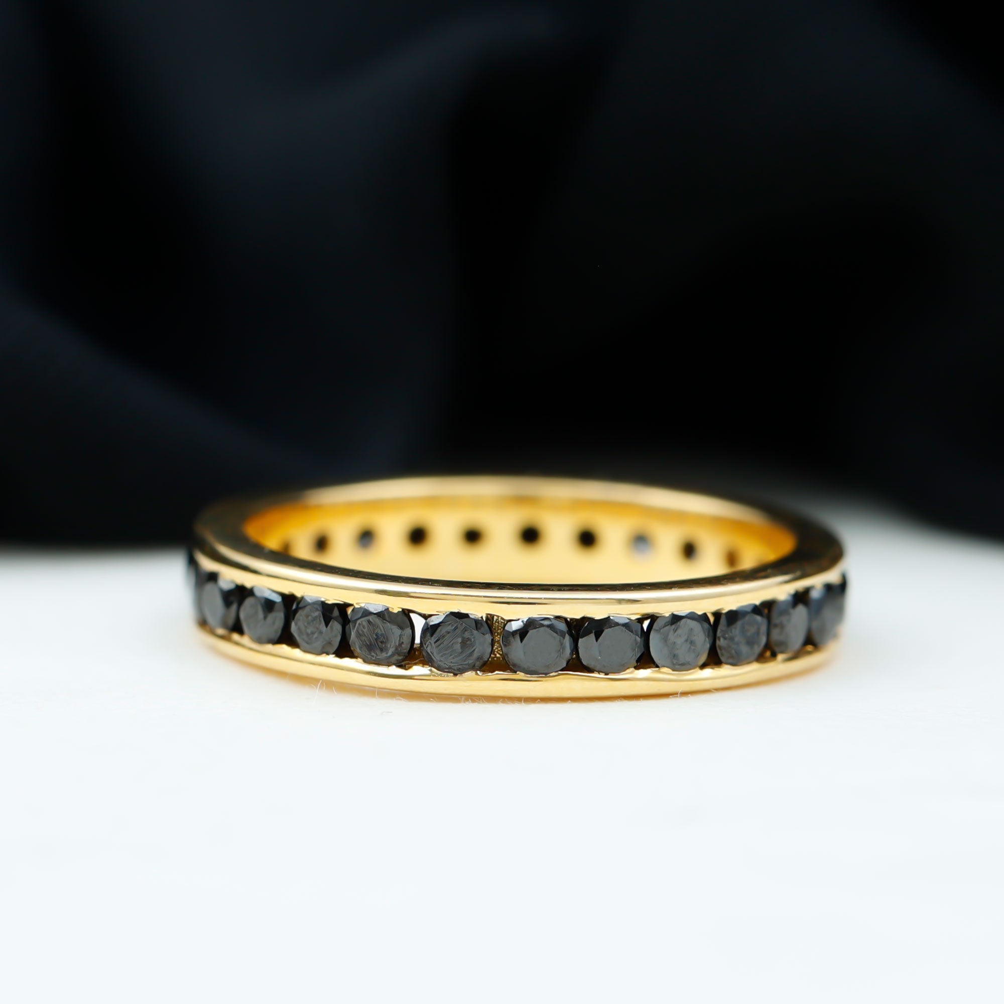 We know you want to flaunt the party, Grab this Admiring Eternity Ring To dazzle up your finger with Gemstone Rings we bring this Channel Set Black Spinel and Gold Eternity Ring, that will set your fashion style high in the sky. This Gemstone Ring is a cherry on the cake with your party outfit or family brunch.