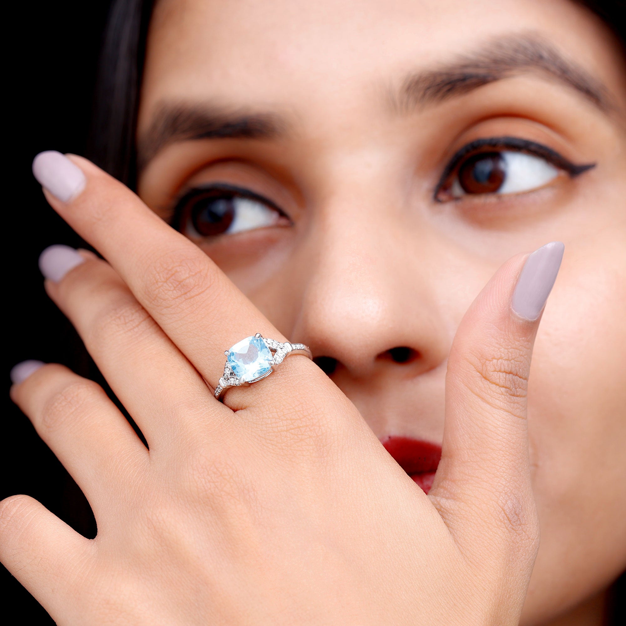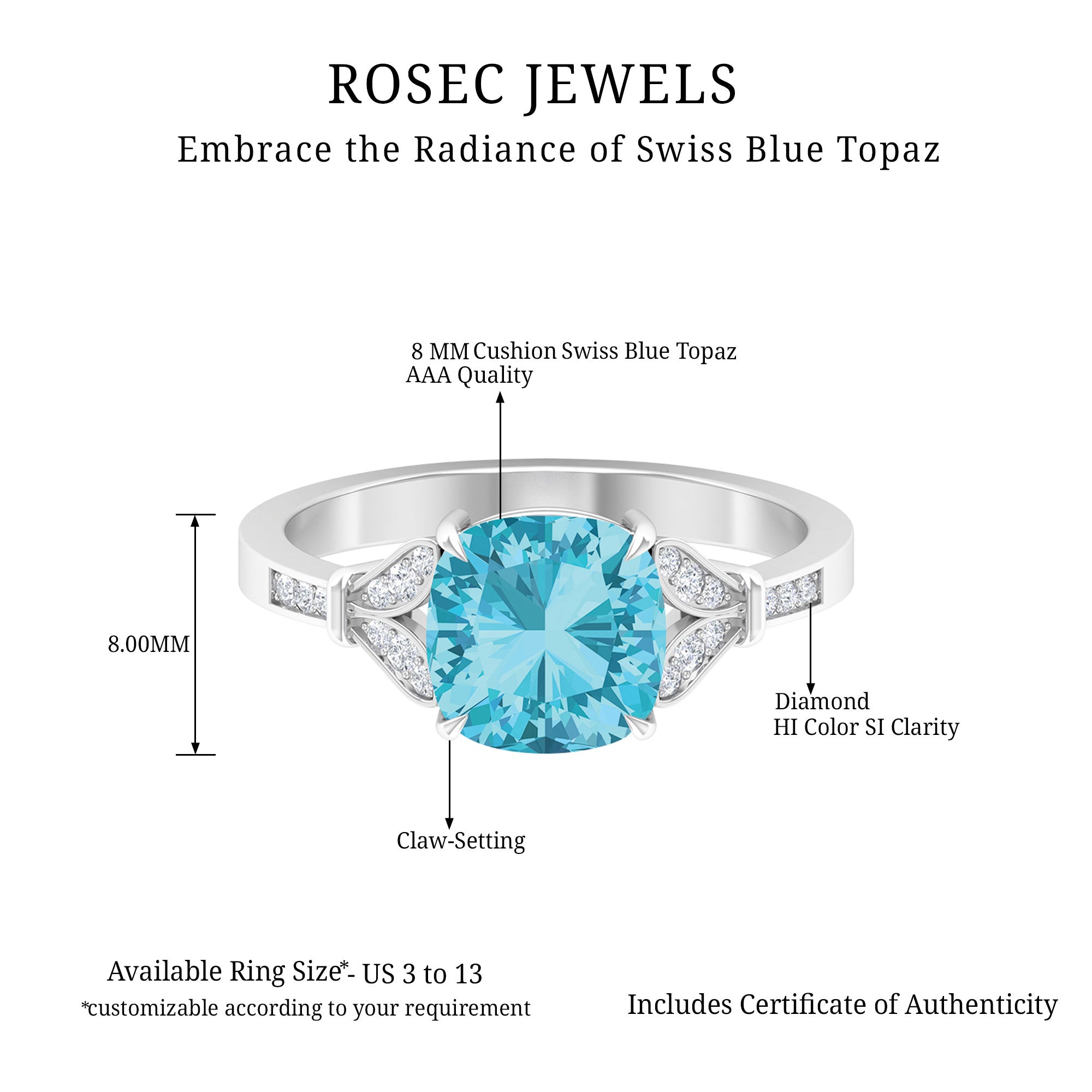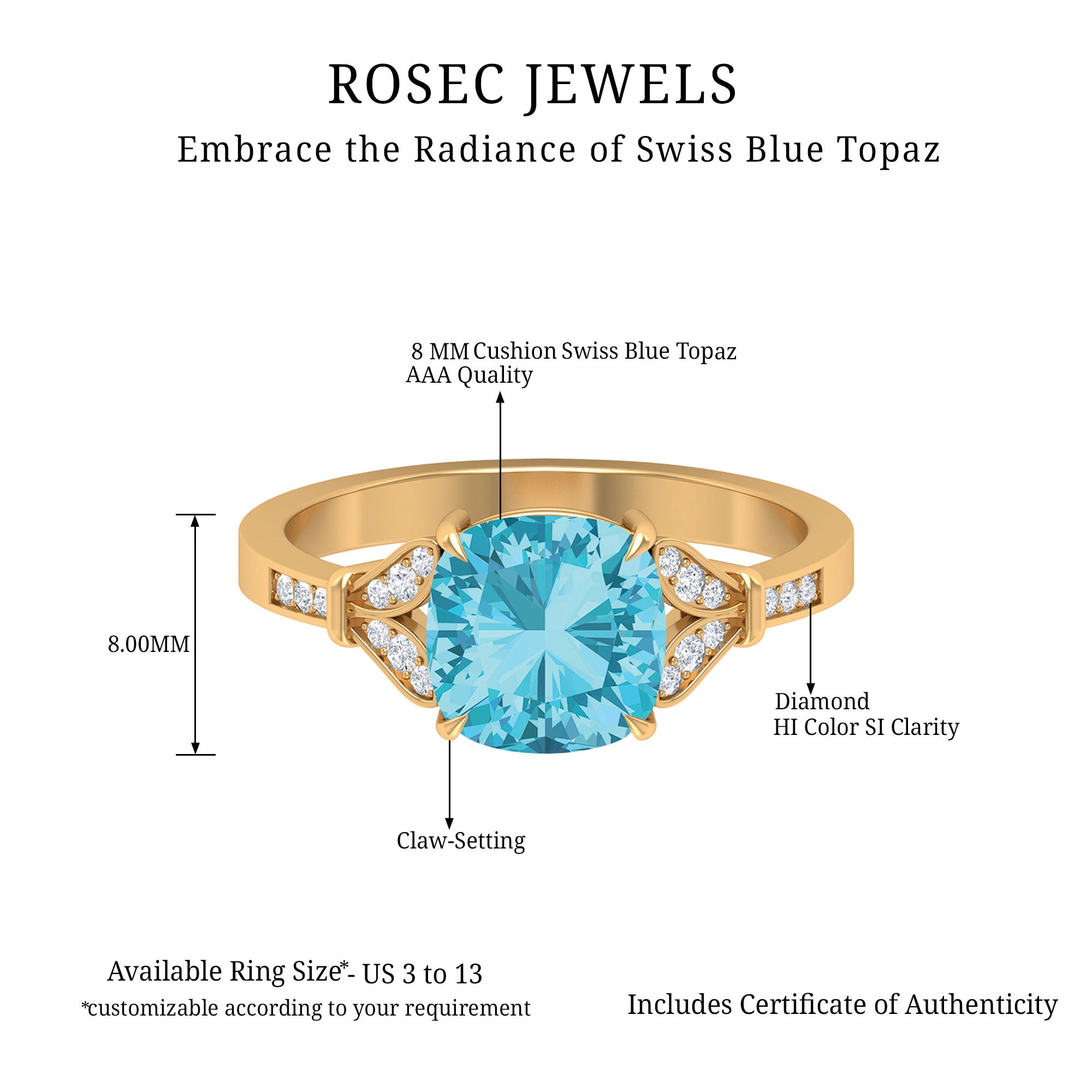 2.75 CT Cushion Cut Swiss Blue Topaz Solitaire with Diamond Side Stone Ring