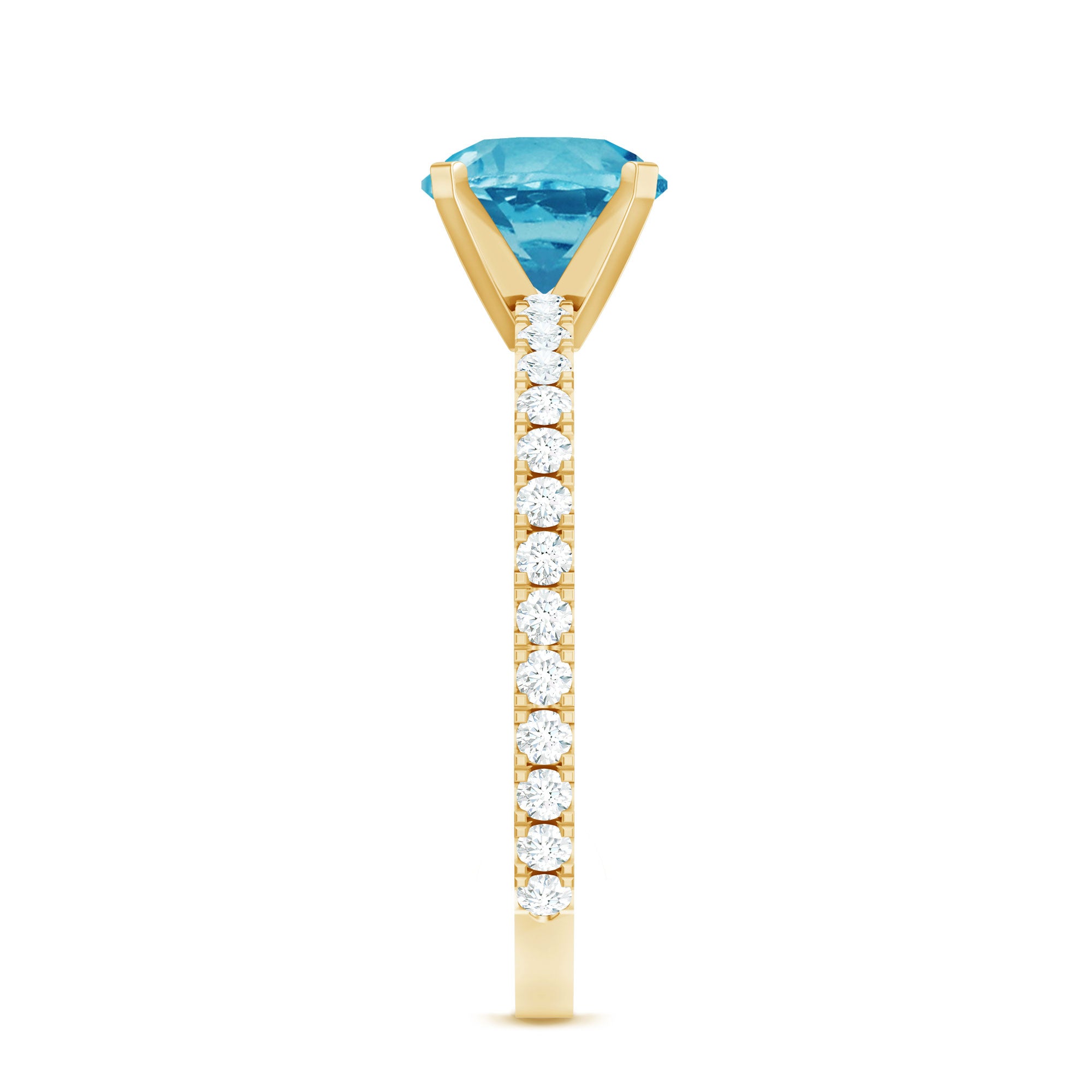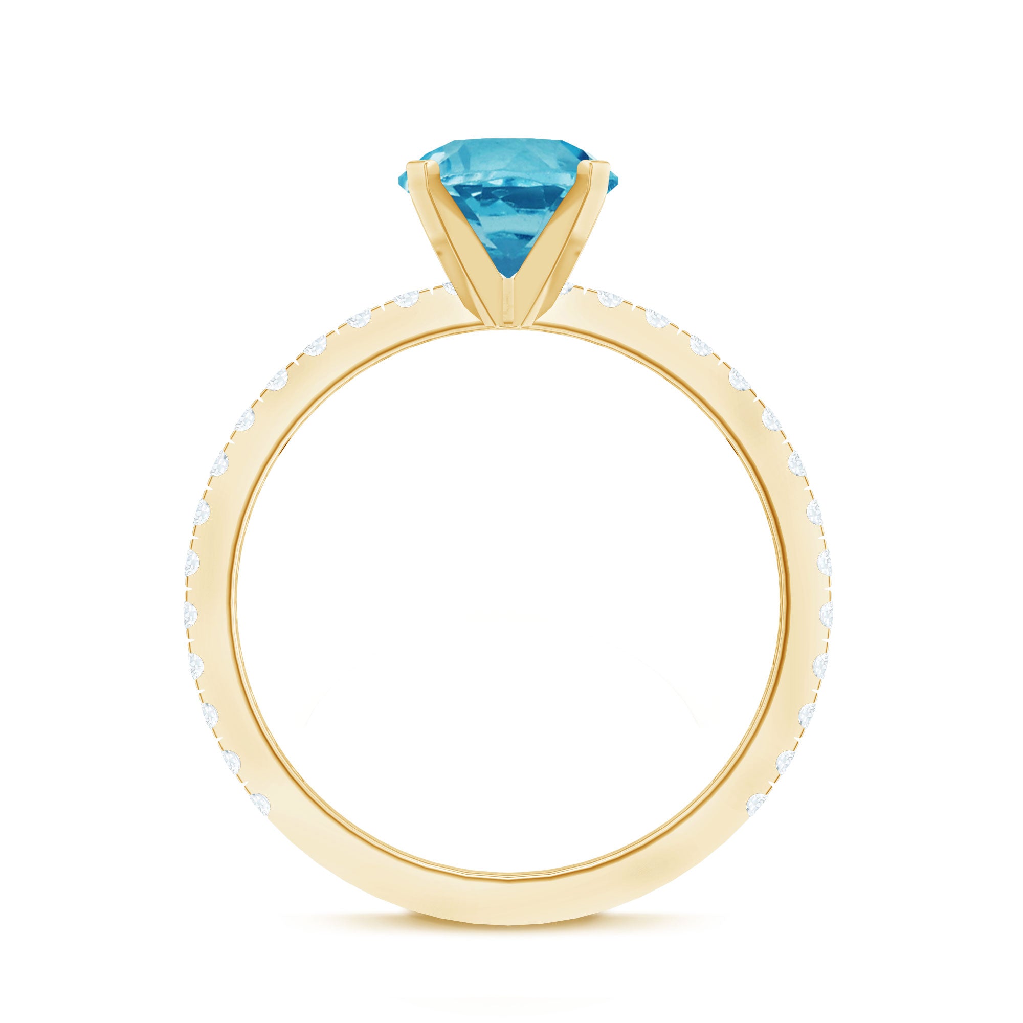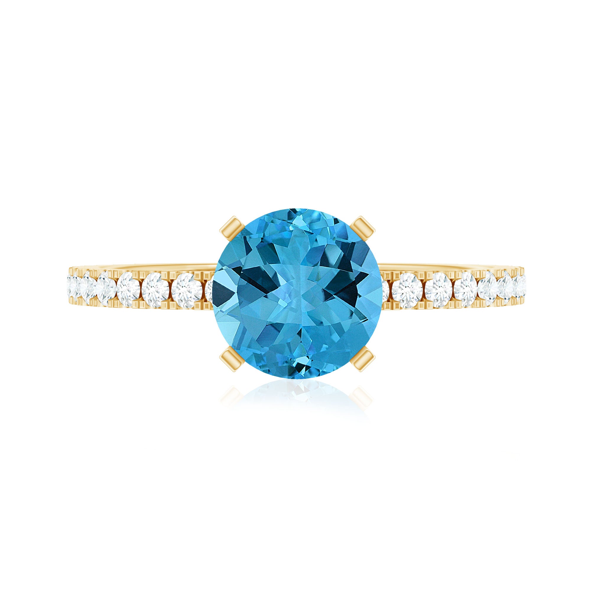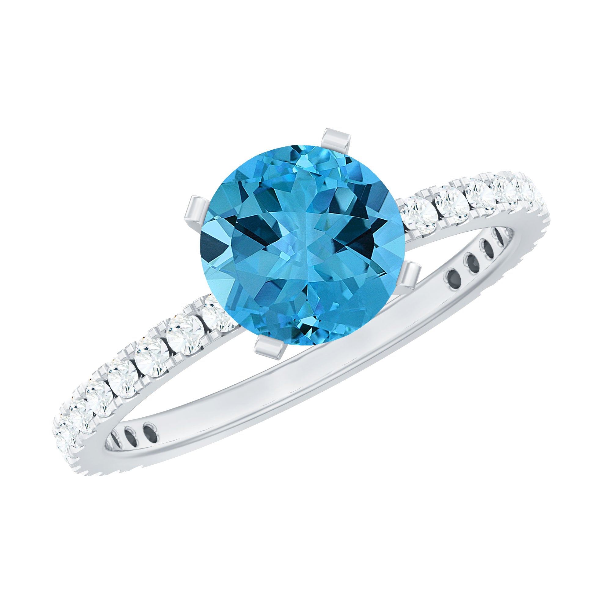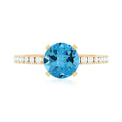 This Solitaire Ring is embellished with Round Shape Swiss Blue Topaz Gemstone with Diamond as Side Stones. This Topaz Ring is crafted in gold with 4 Prong Peg Head Setting, which makes it a valuable Engagement Ring.